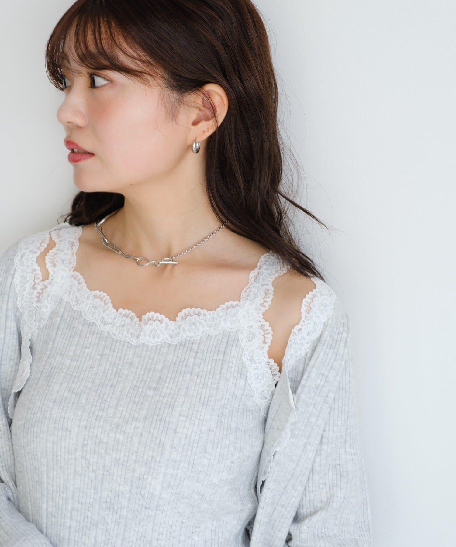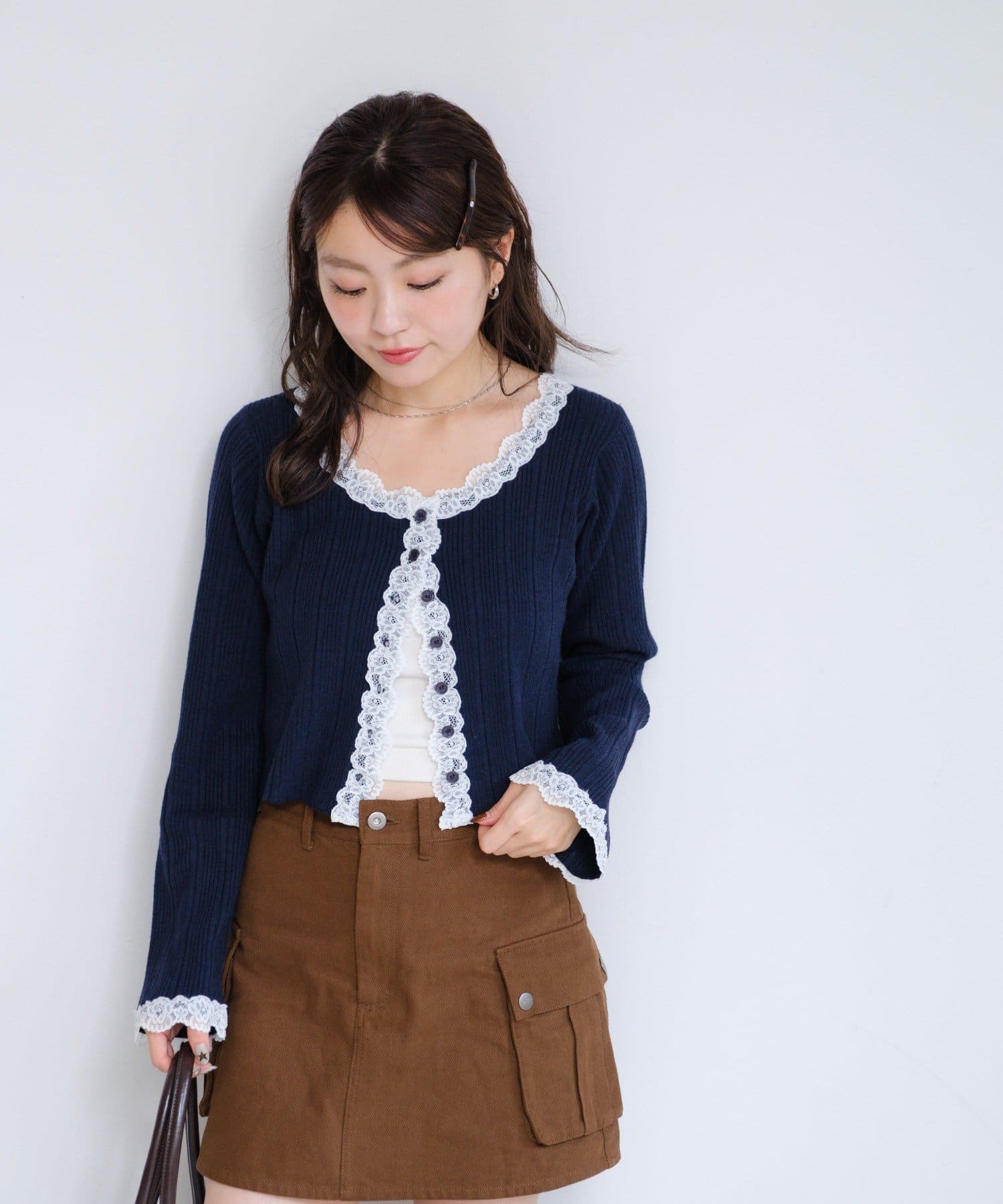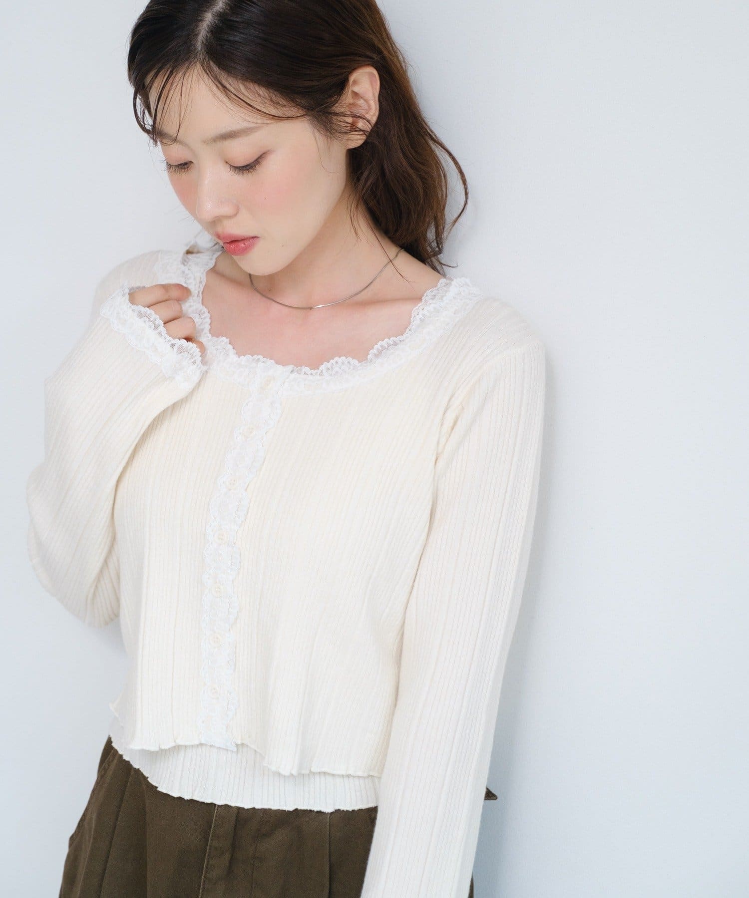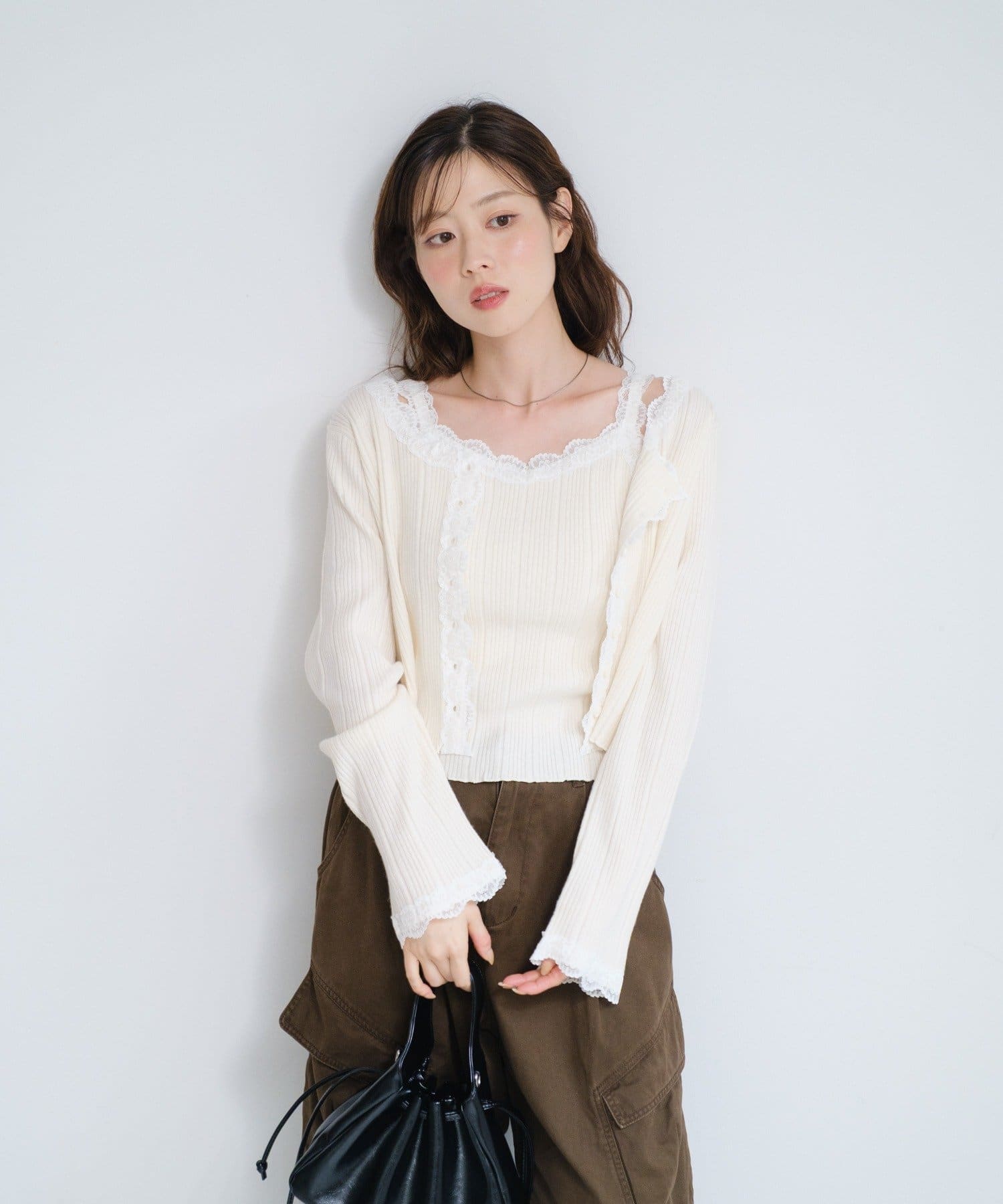 レース使いがフェミニンな印象のリブニットアンサンブル。