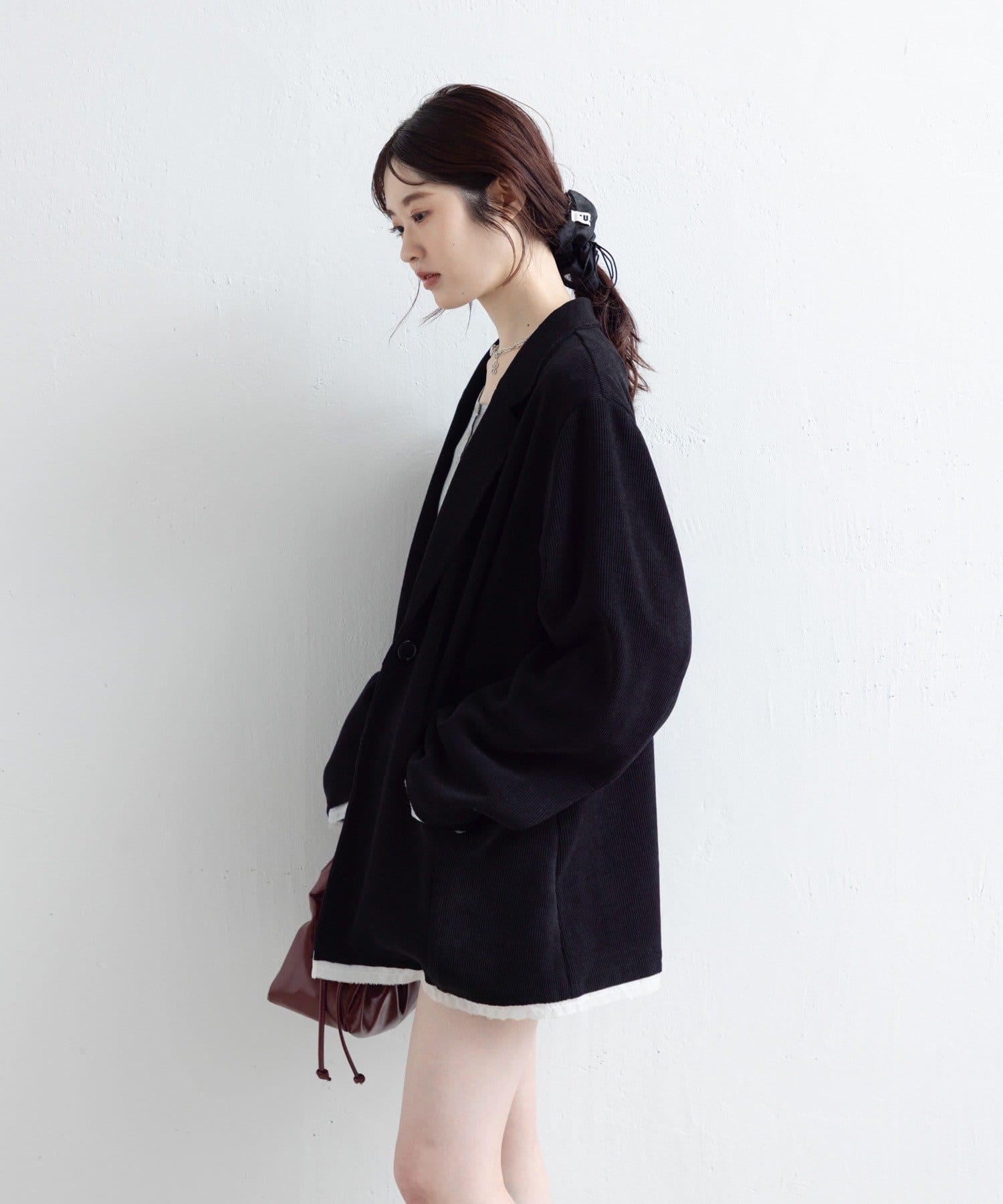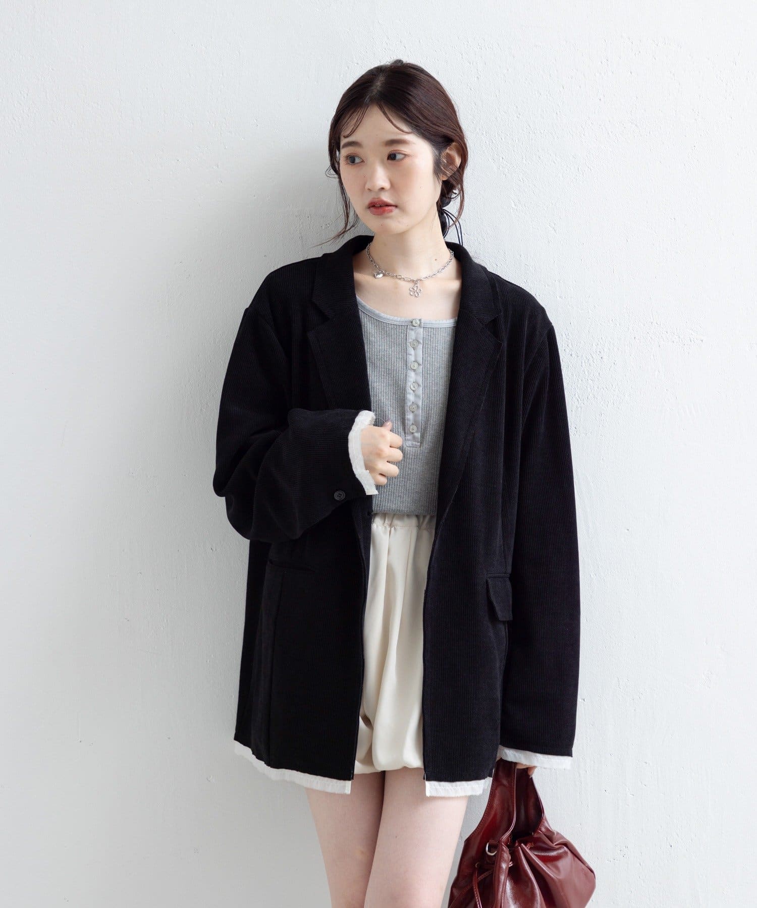 購入場所:店舗コーデュロイ生地でジャケットとなると少し重いのかなと思っていましたが軽すぎるくらい軽くて驚きました!!しかも袖口と裾にホワイトが入ってて大人っぽいのに可愛さも忘れないという天才ジャケットでした⭐︎⭐︎!!