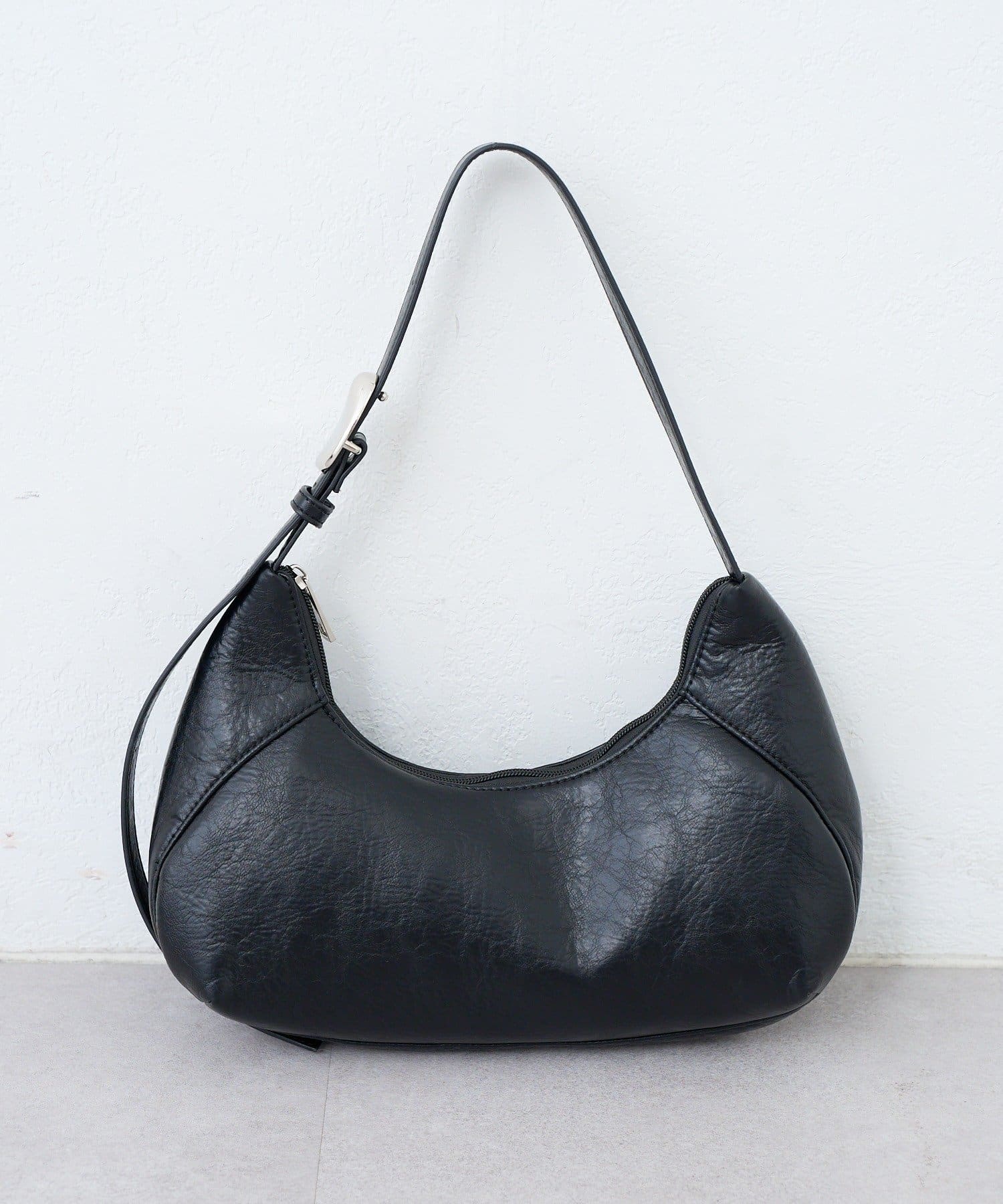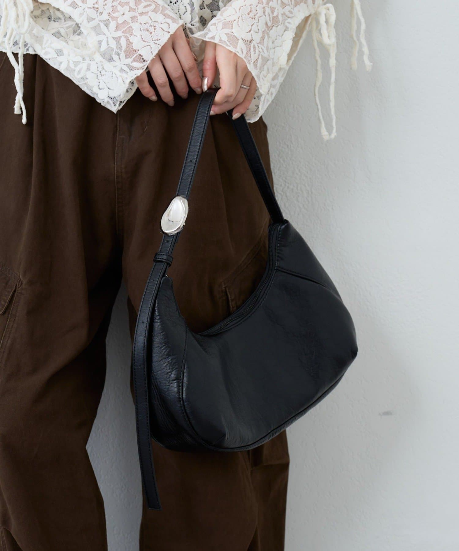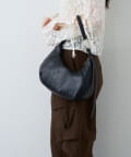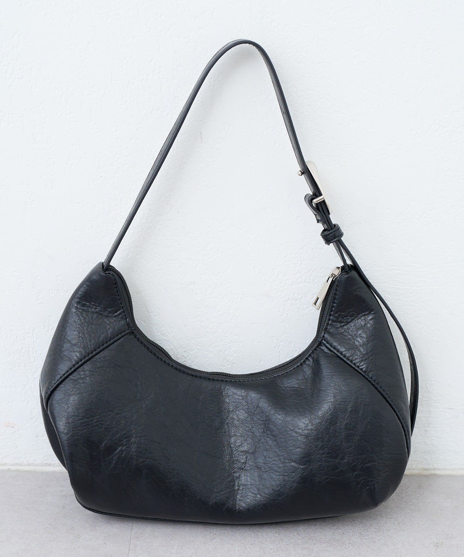 柔らかなレザー調素材と上品なモチーフが魅力のハーフムーンバッグ。