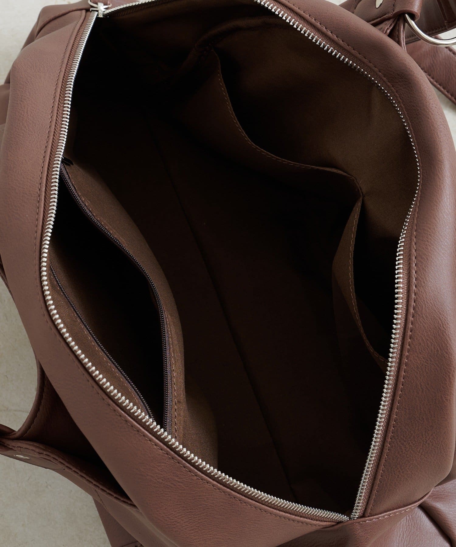 メイン収納は大きく開くファスナー仕様で出し入れがしやすく、セパレート部分で小物の整理もしやすい設計。
