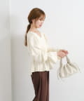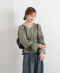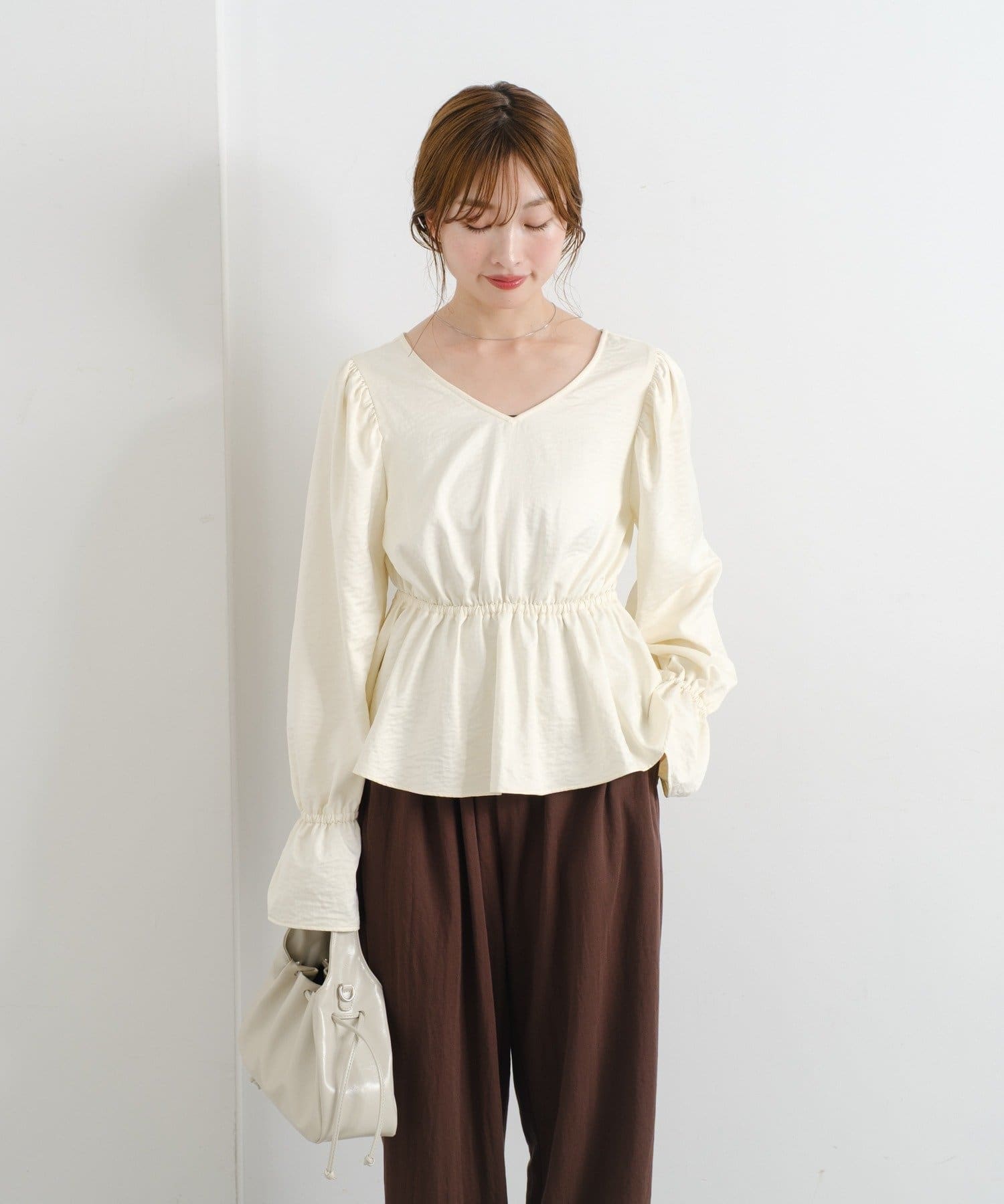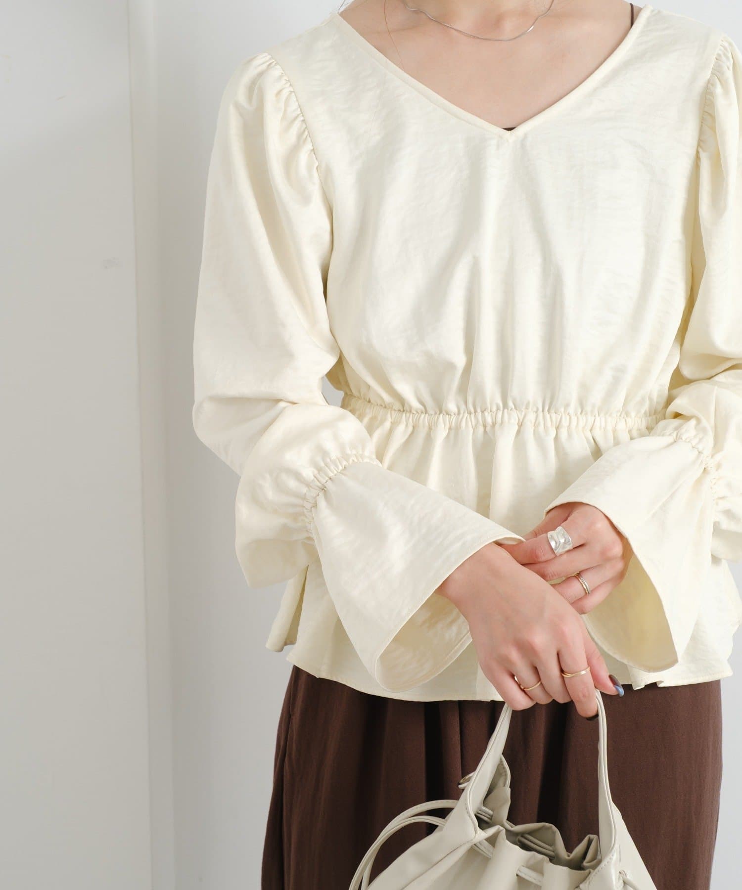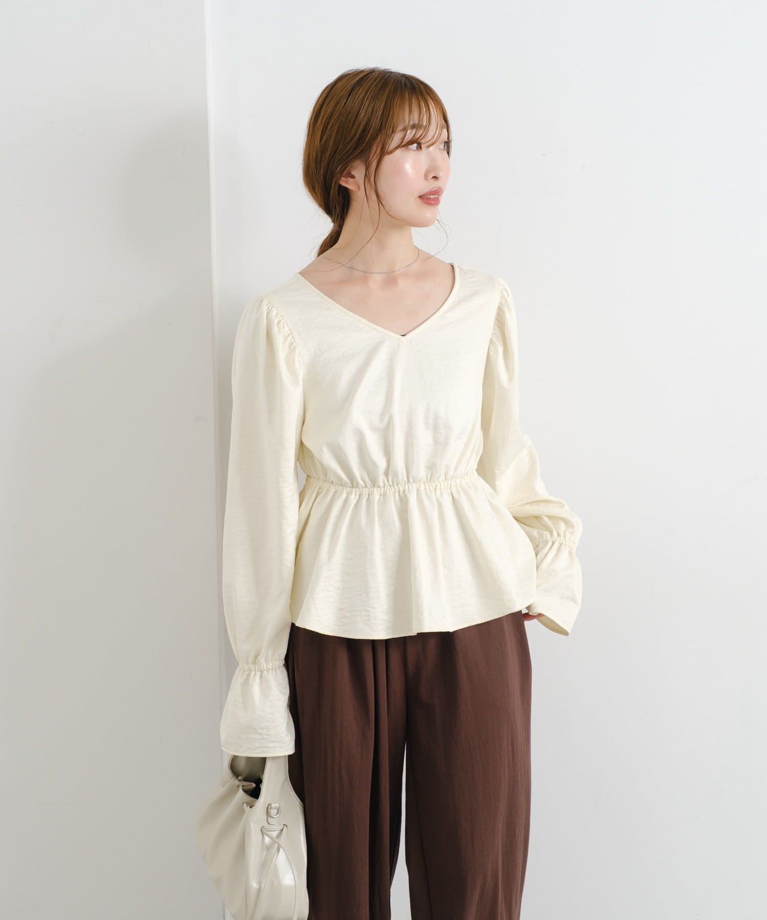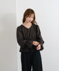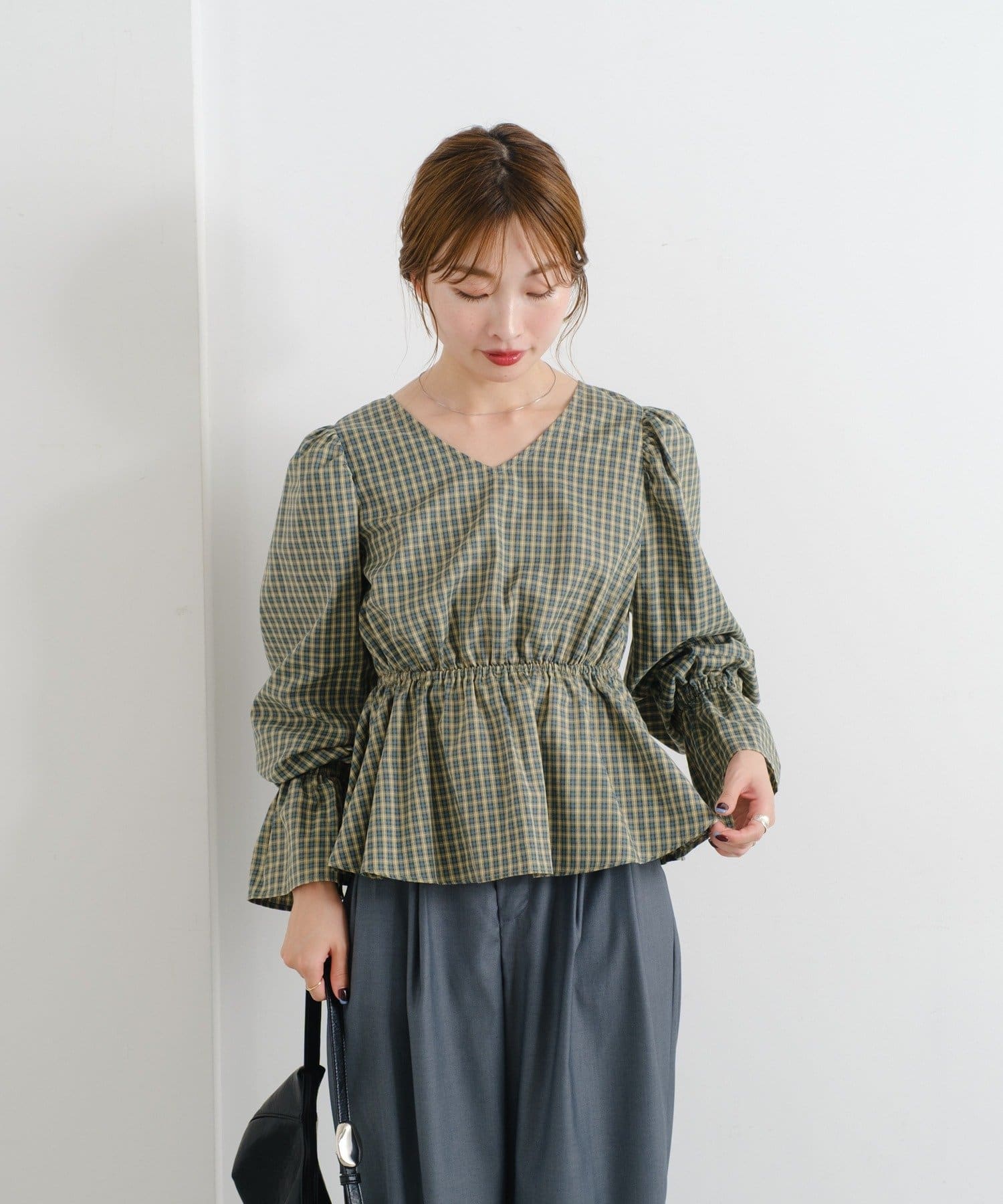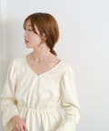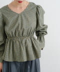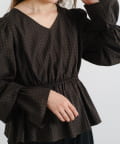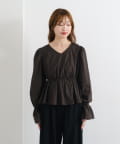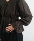 ふんわりとしたパフスリーブとギャザー入りのペプラムで、女性らしいシルエットを強調。