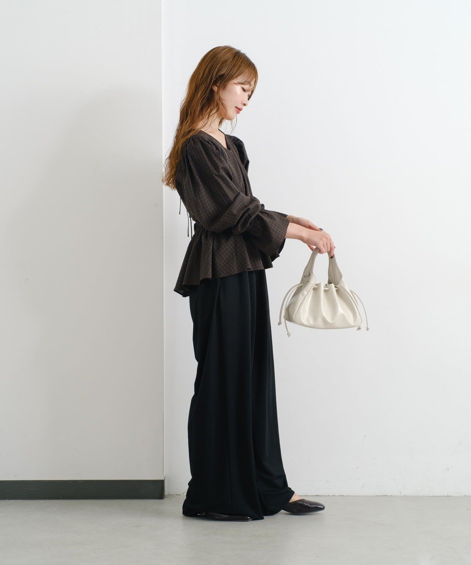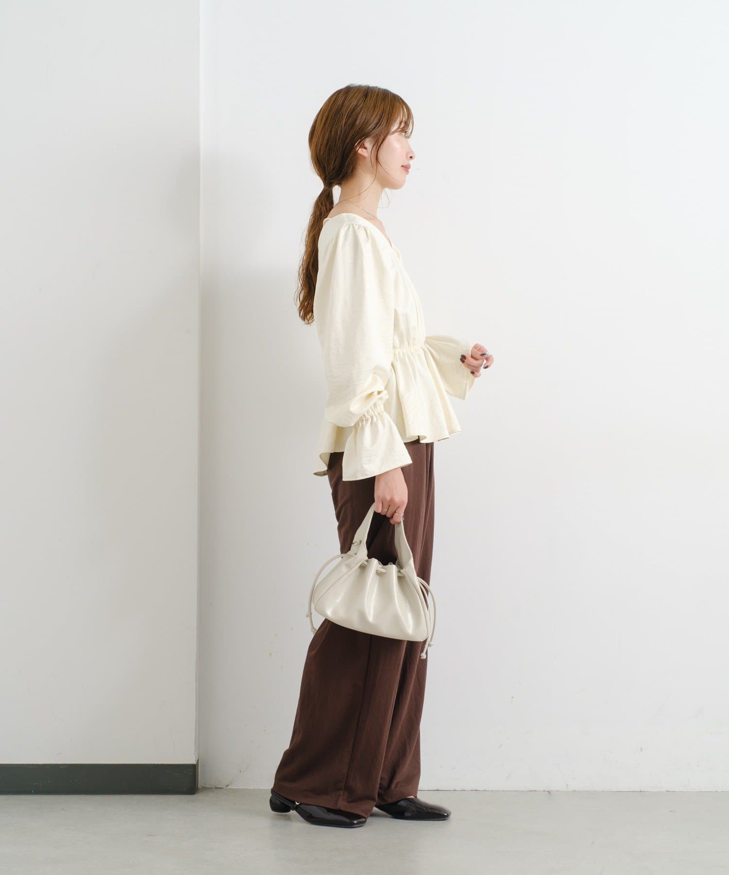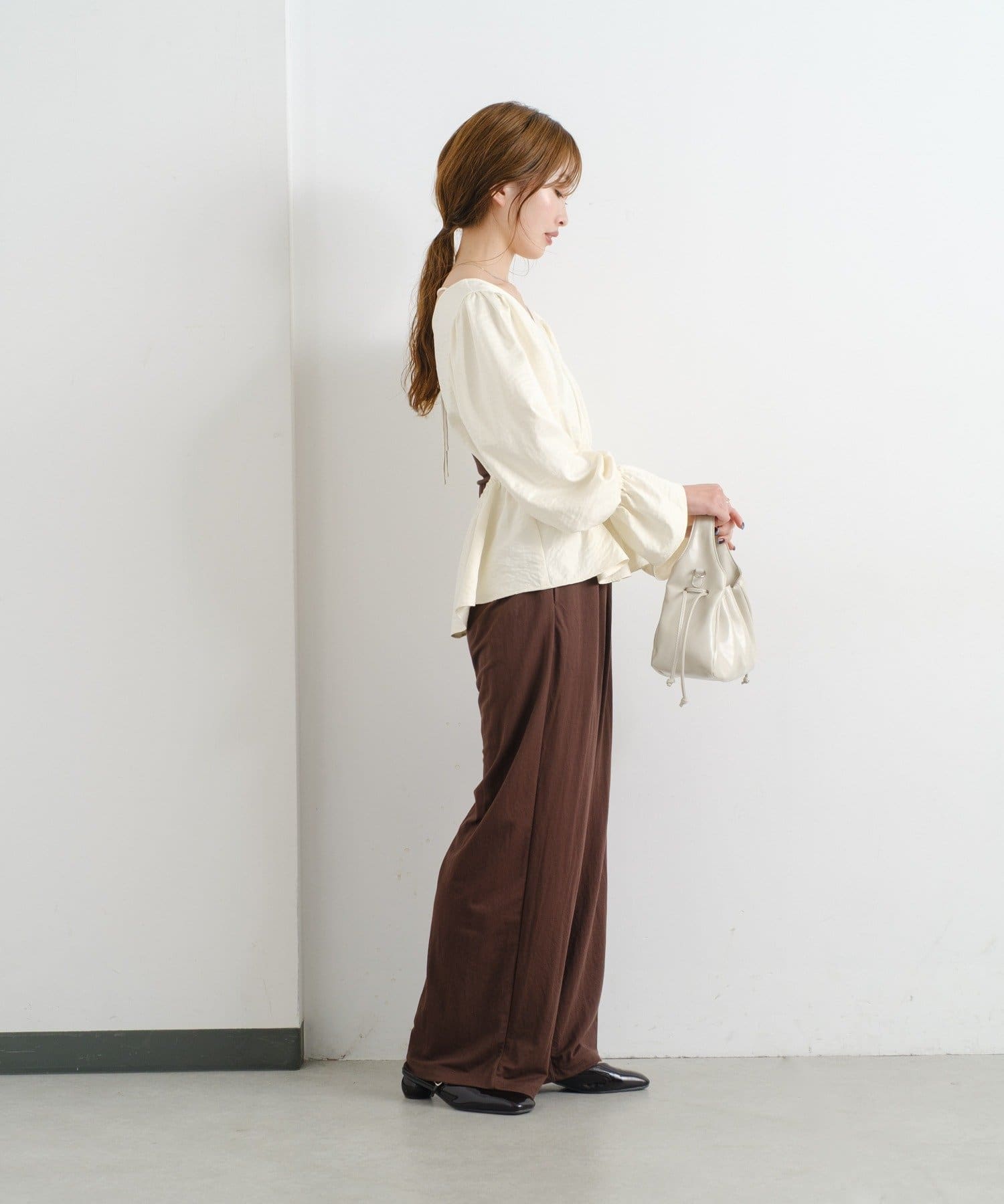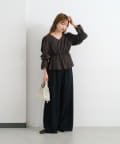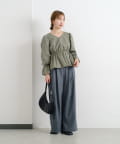 ハイウエストのパンツやスカートと合わせてウエストラインを美しく見せるスタイルに。