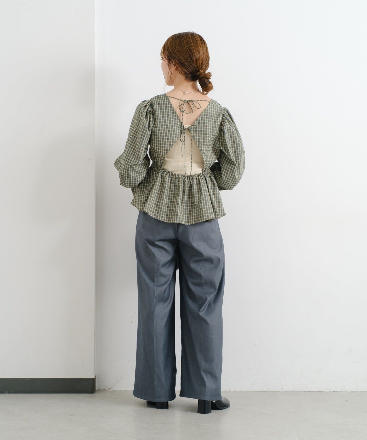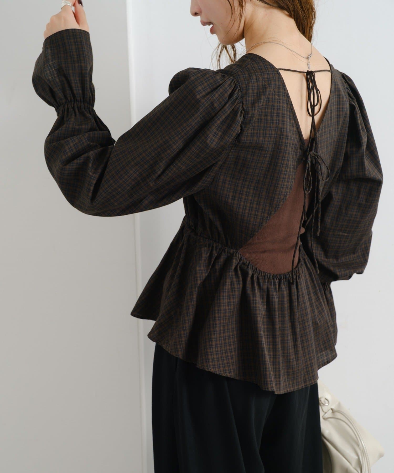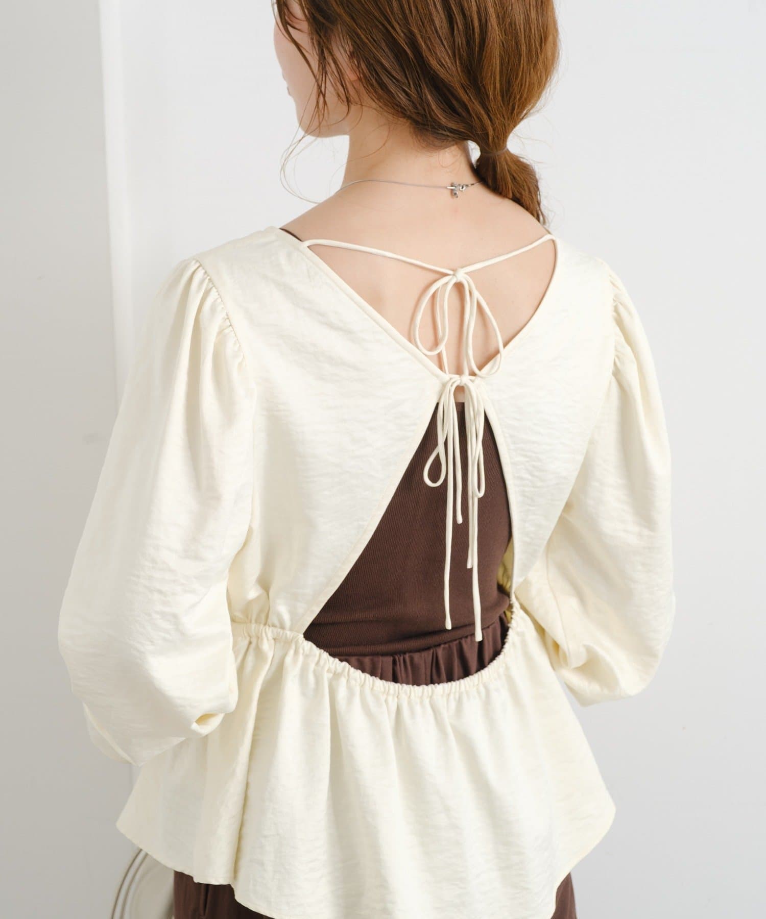 個性的なバックデザインで魅せる、フェミニンペプラムブラウス