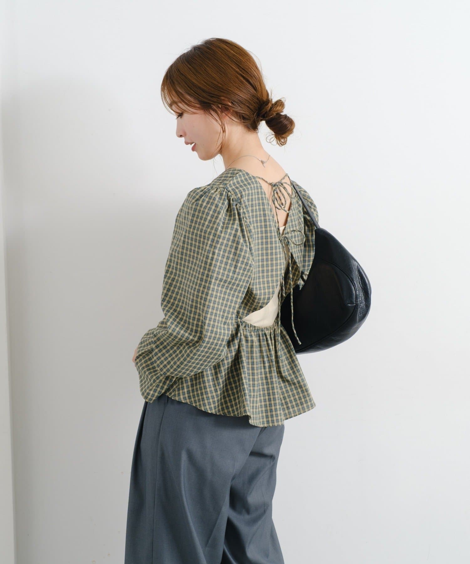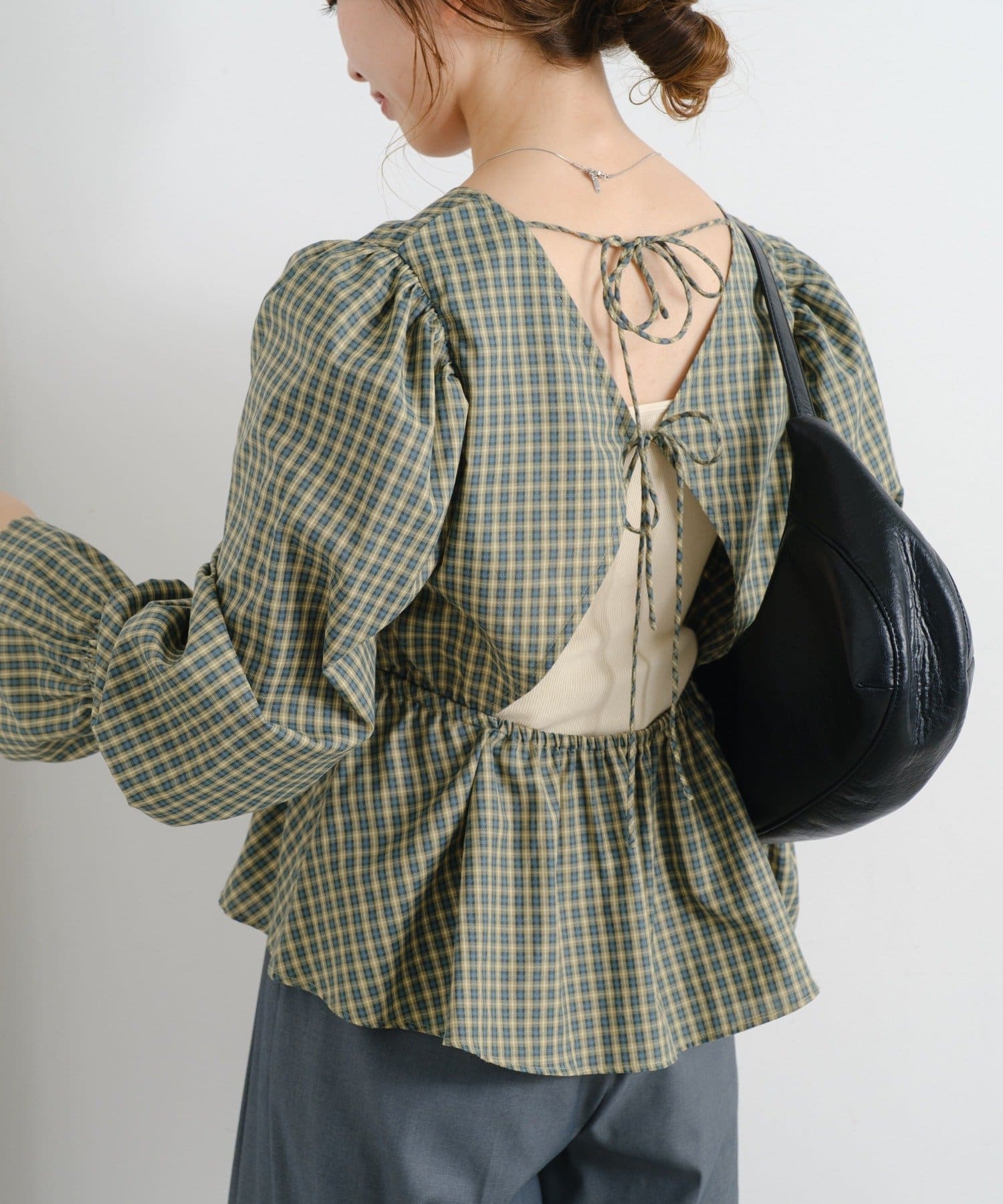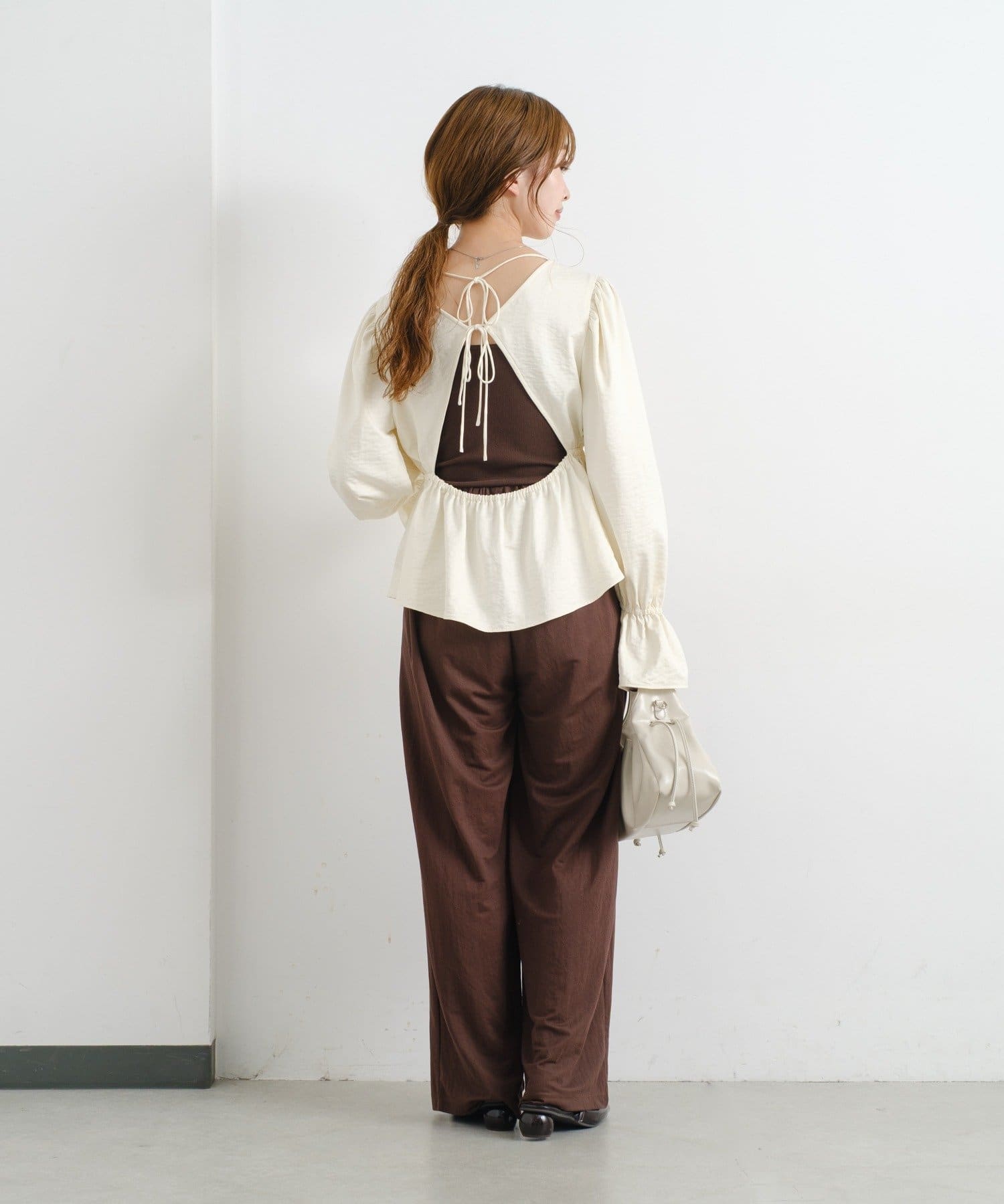 個性的なバックデザインで魅せる、フェミニンペプラムブラウス