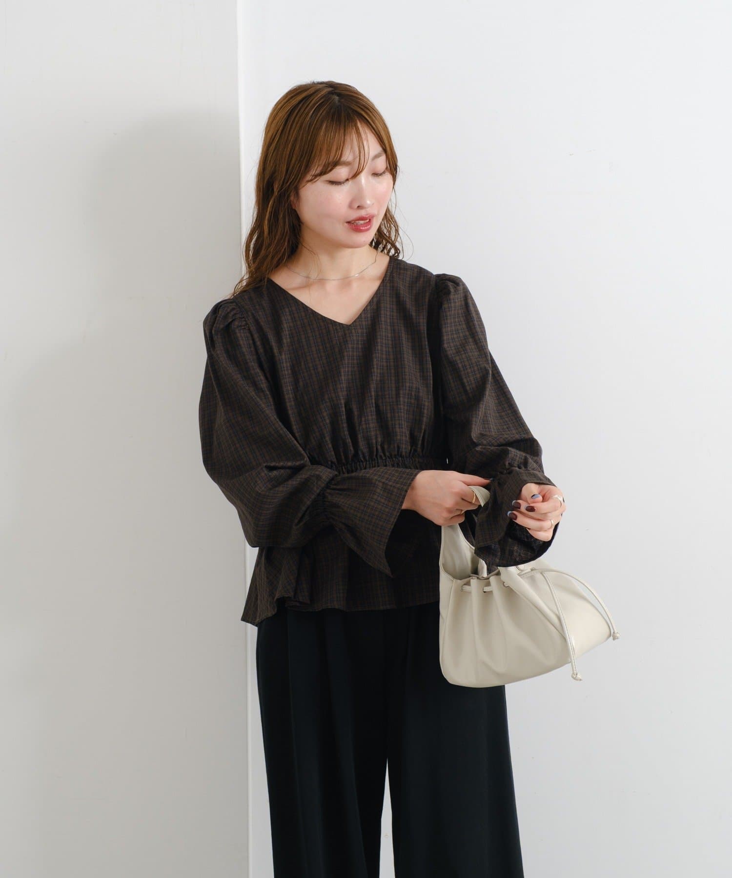 アクセサリーは控えめにして、ブラウスのデザインを際立たせても◎。