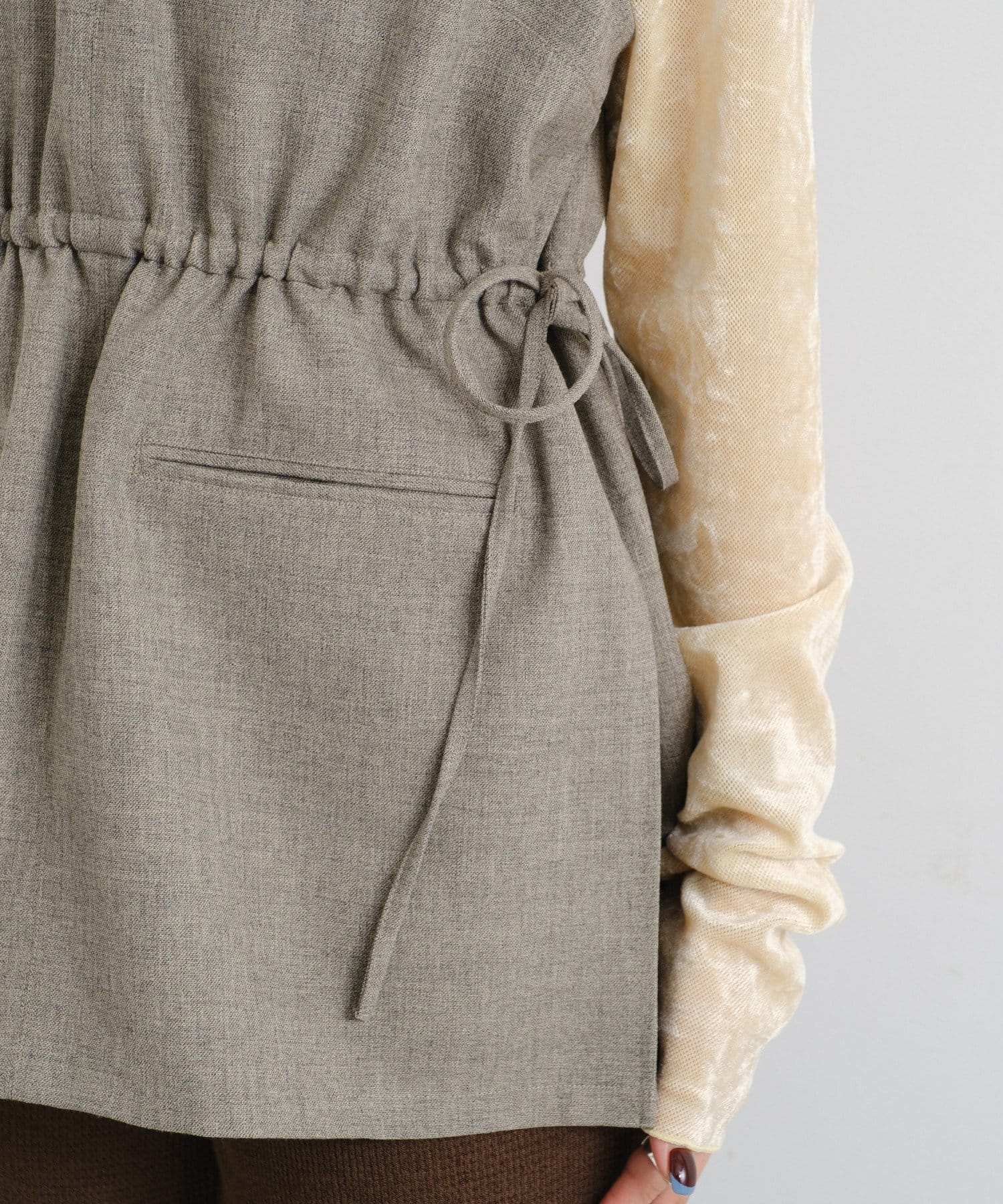 ウエストのドロスとデザインでシルエットが調節できる2WAYベスト。
