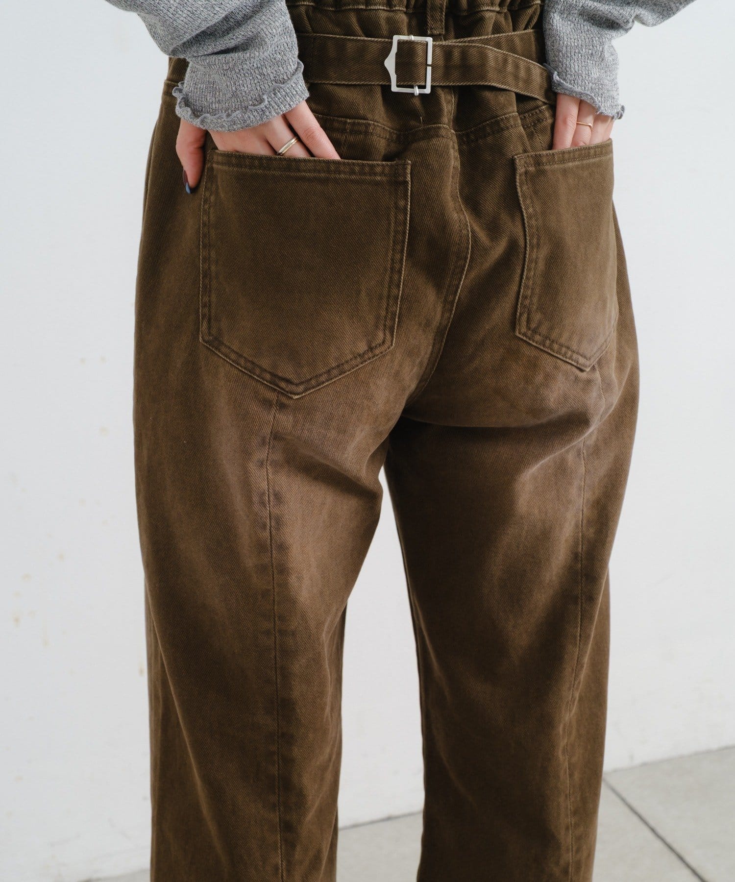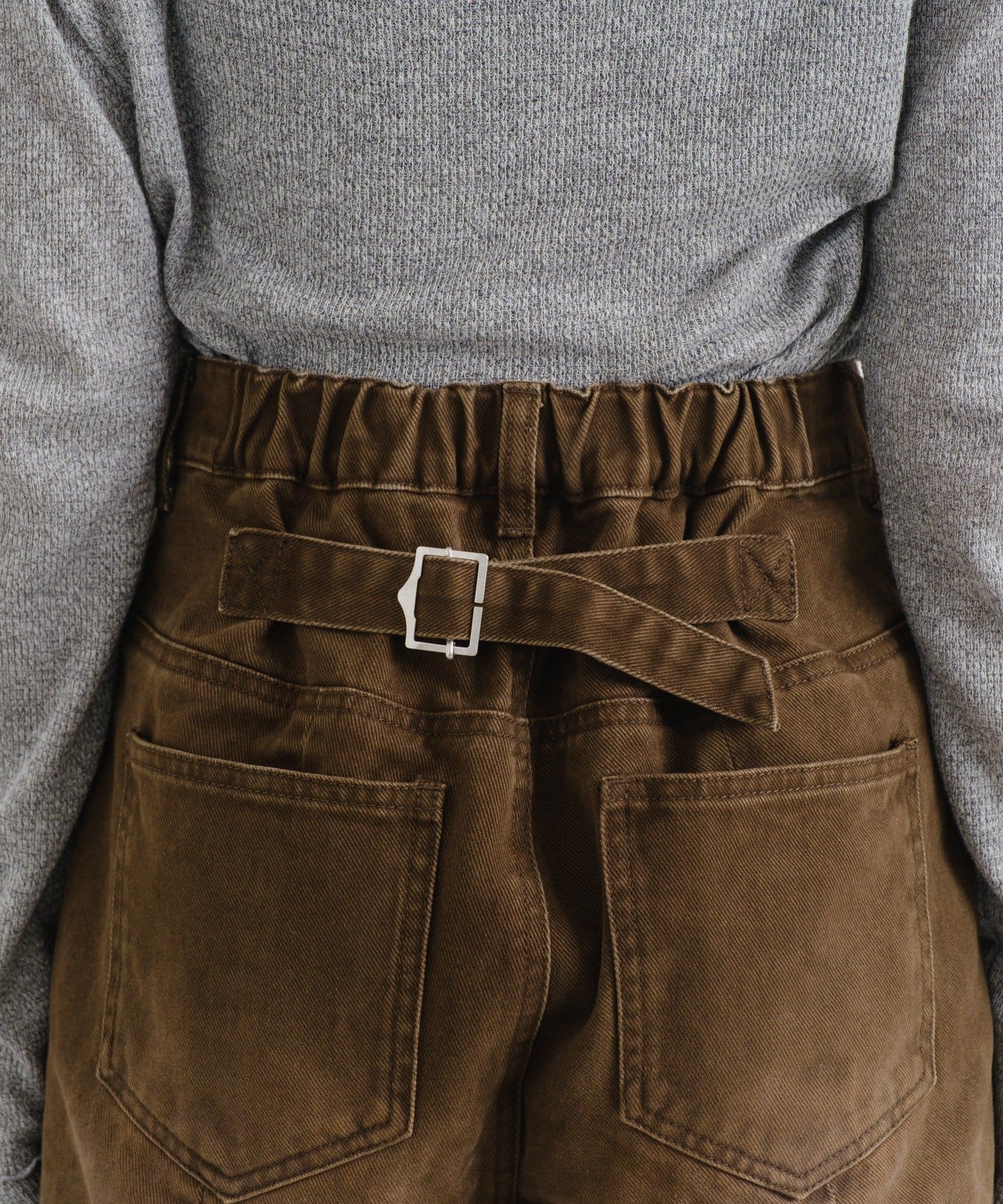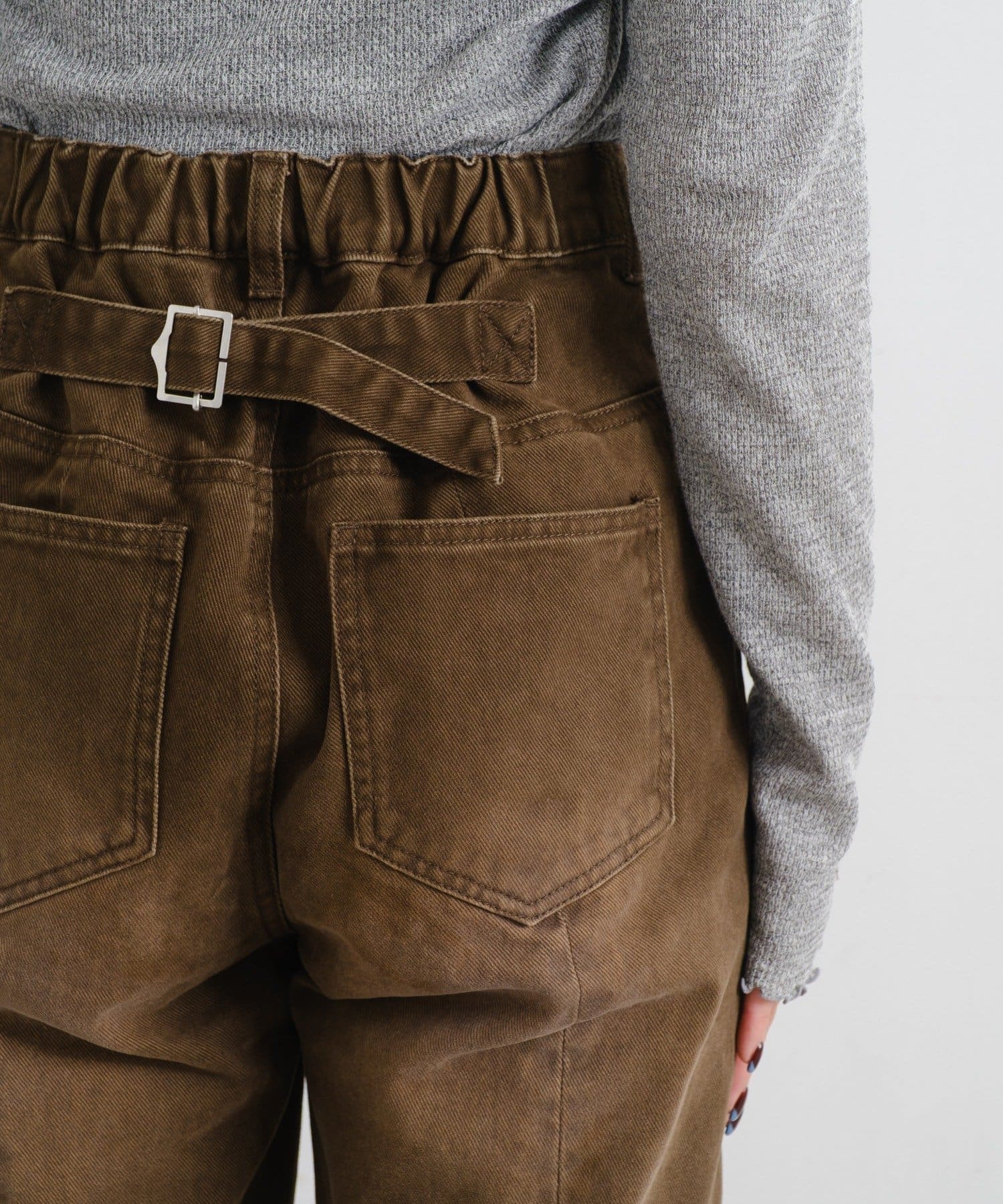 バックスタイルのベルトデザインがアクセントになったツイルストレートパンツ。