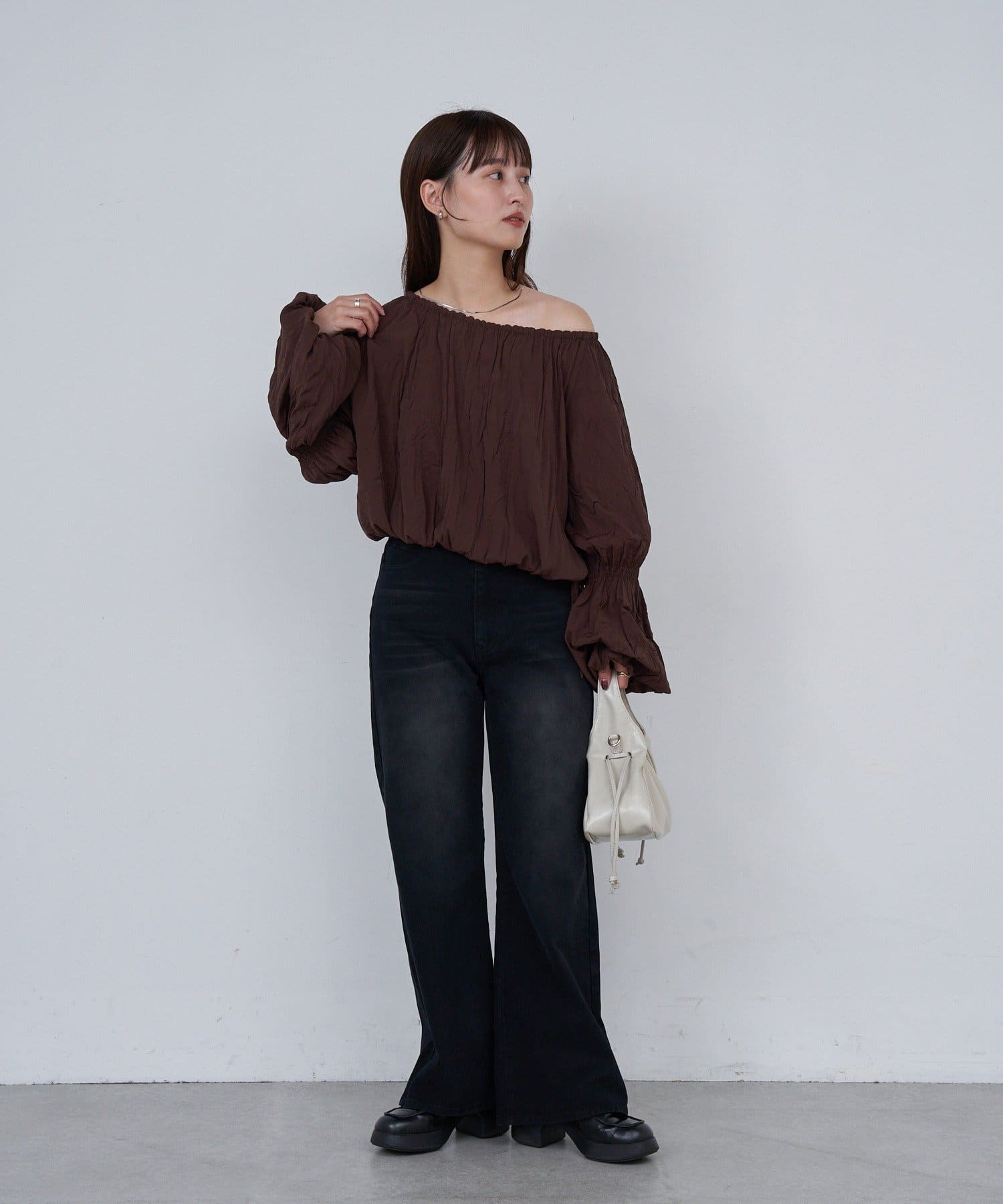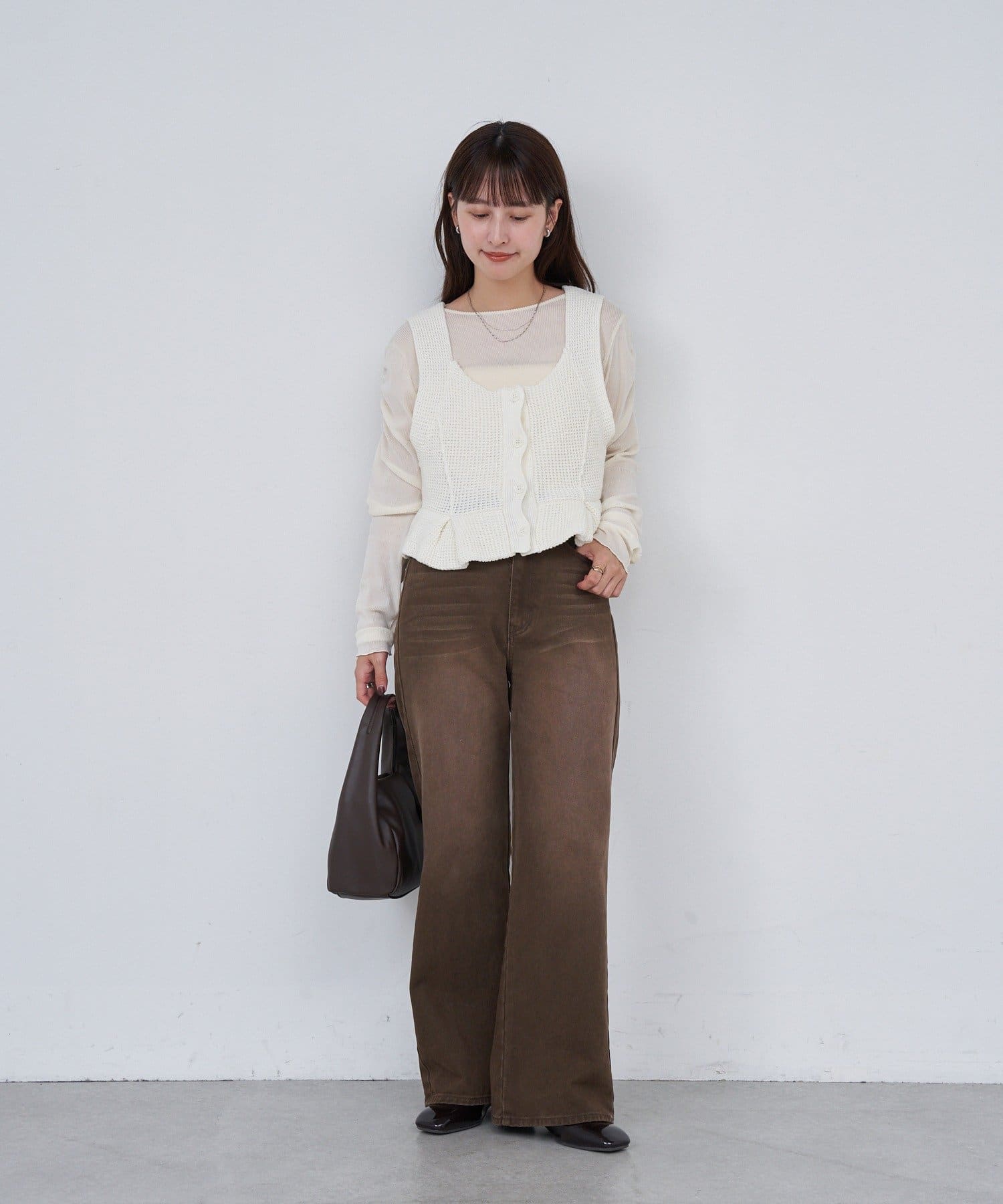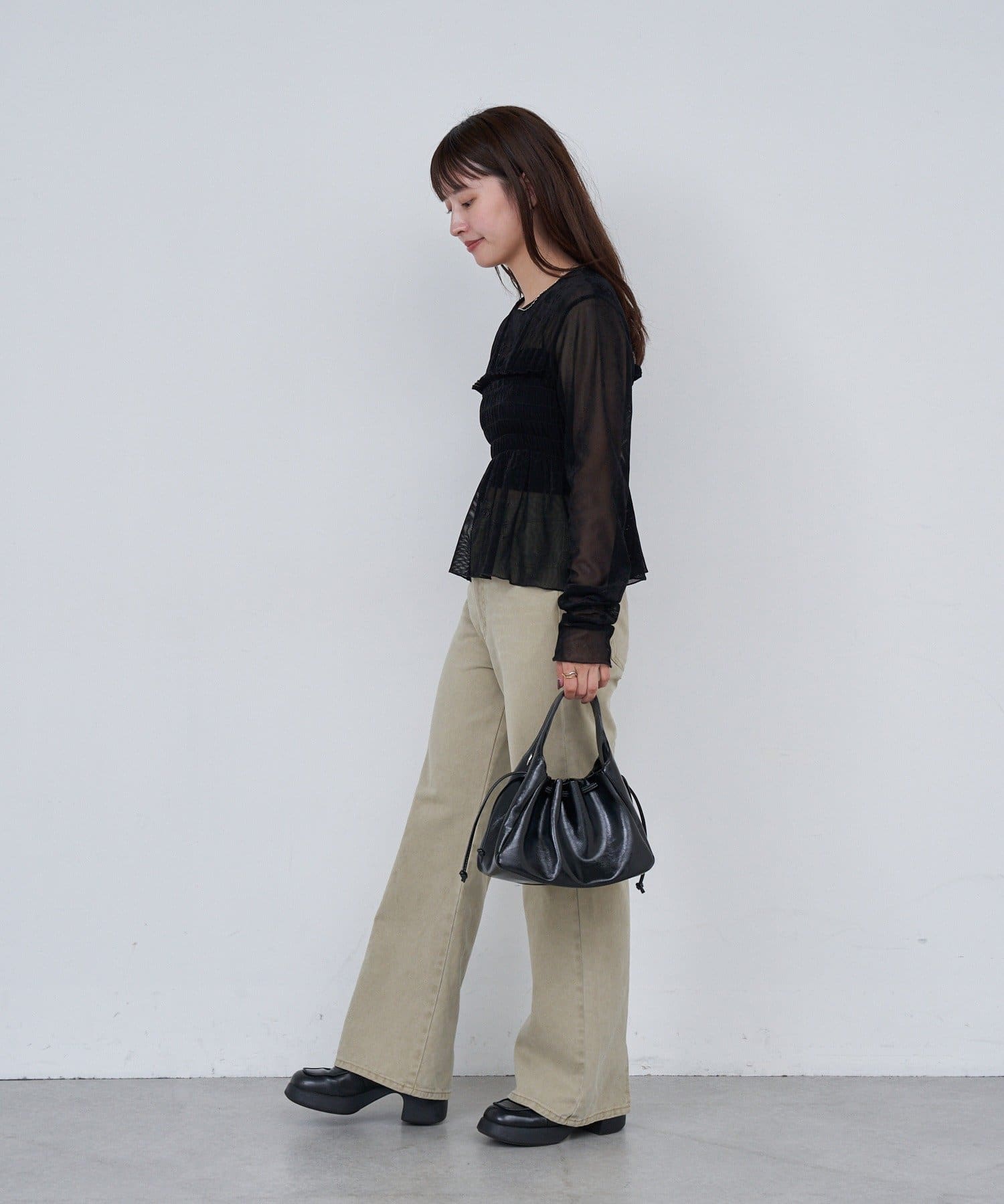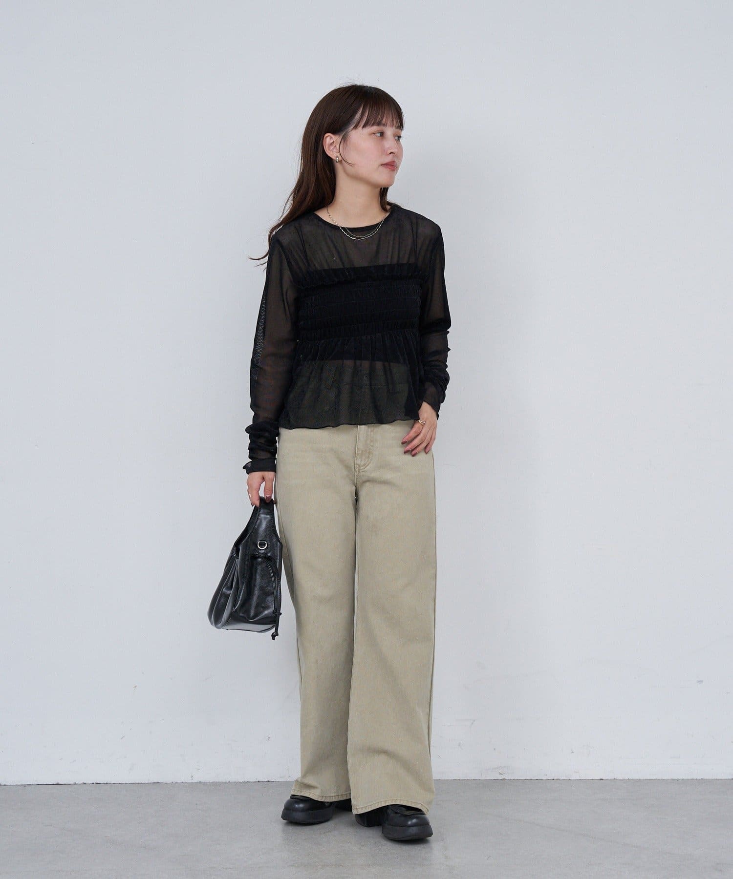 コンパクトなトップスを合わせてバランスよくすっきり見せ。