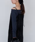 ギャザーが寄せられたネックラインと細めの肩ストラップが特徴。