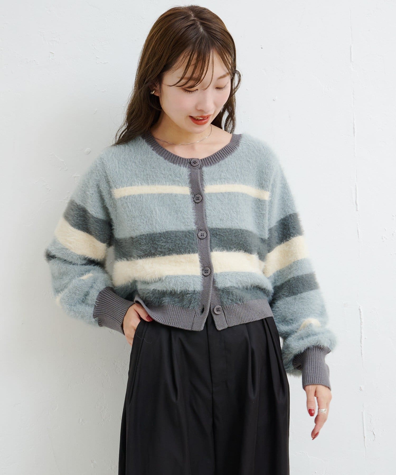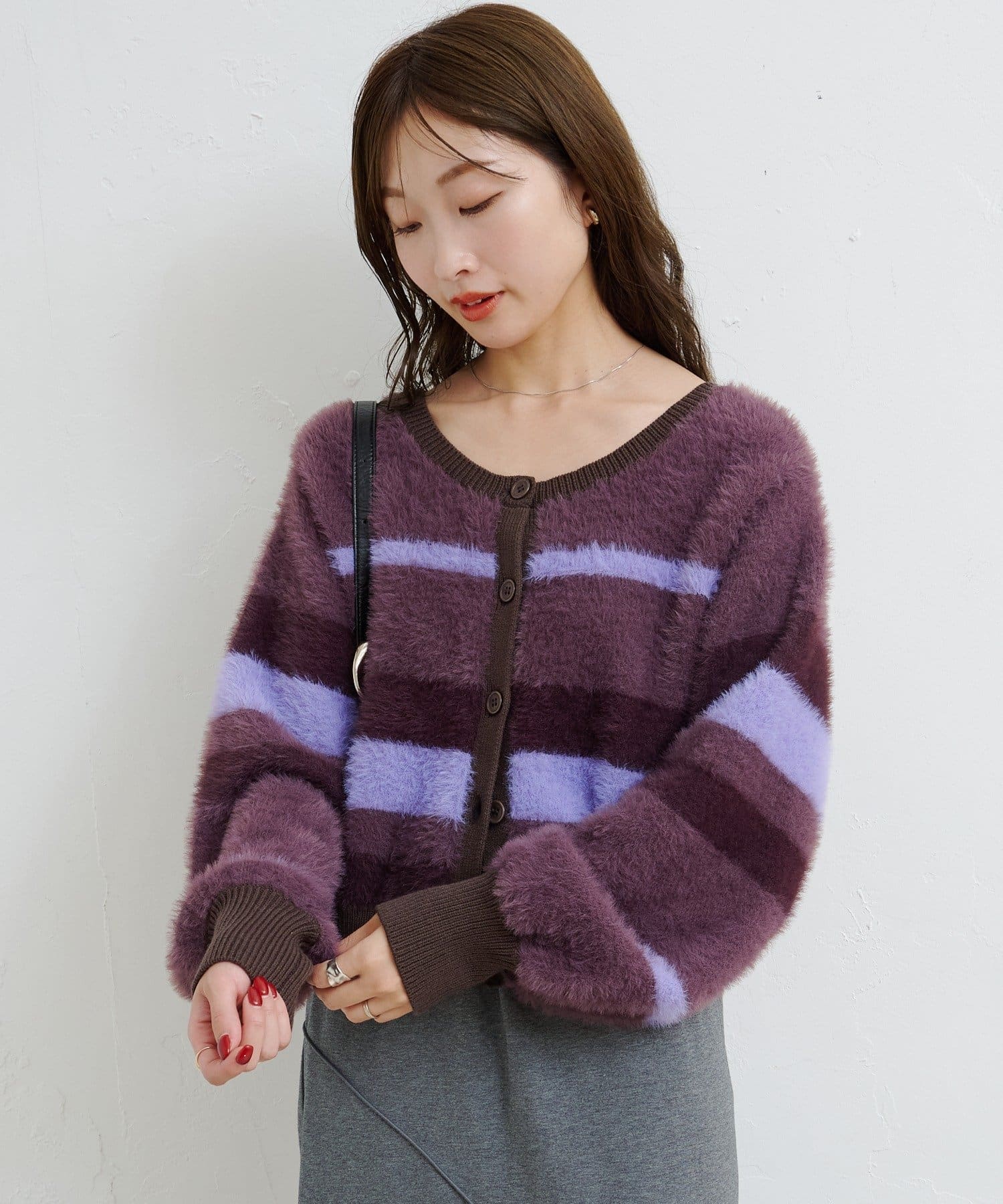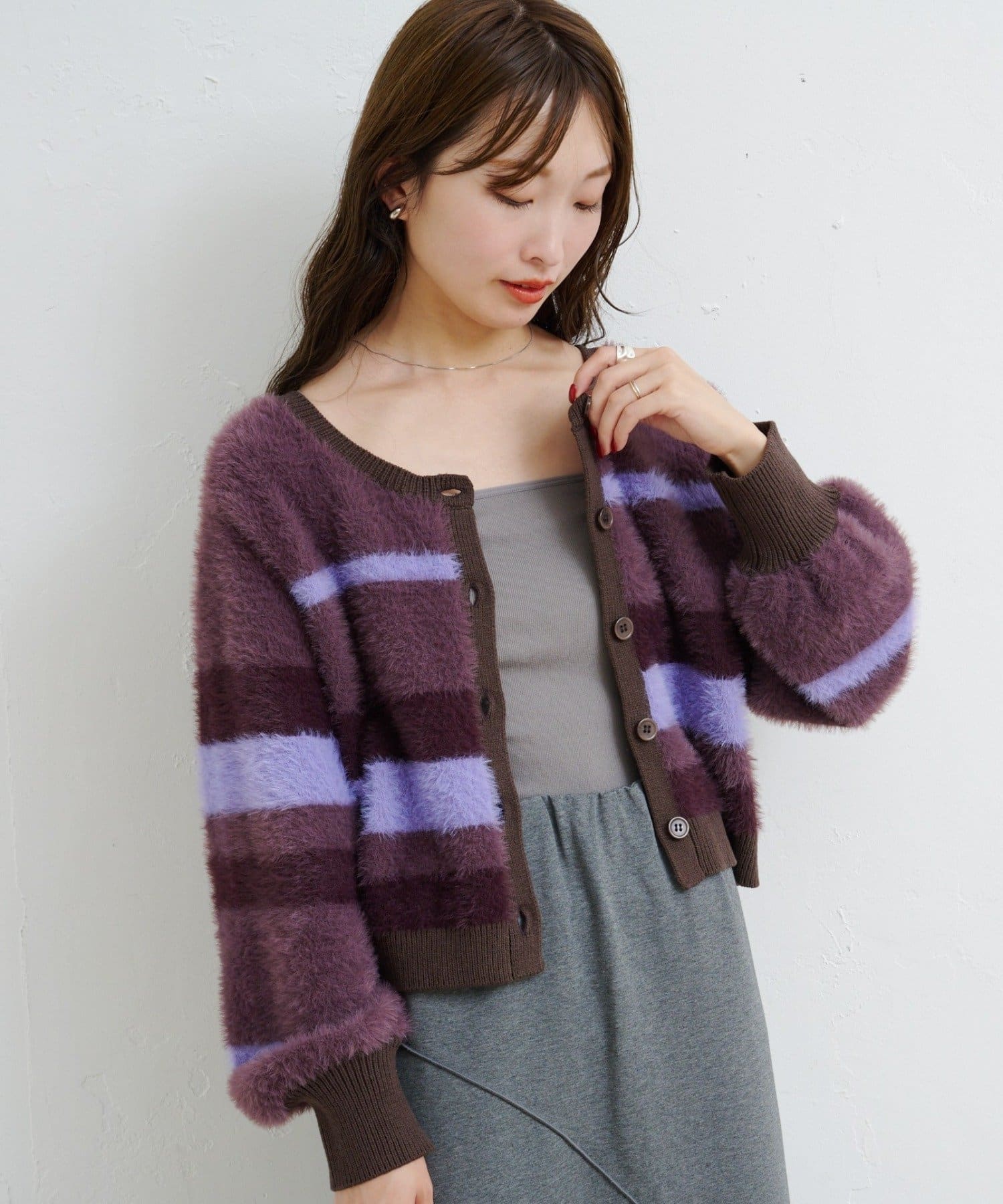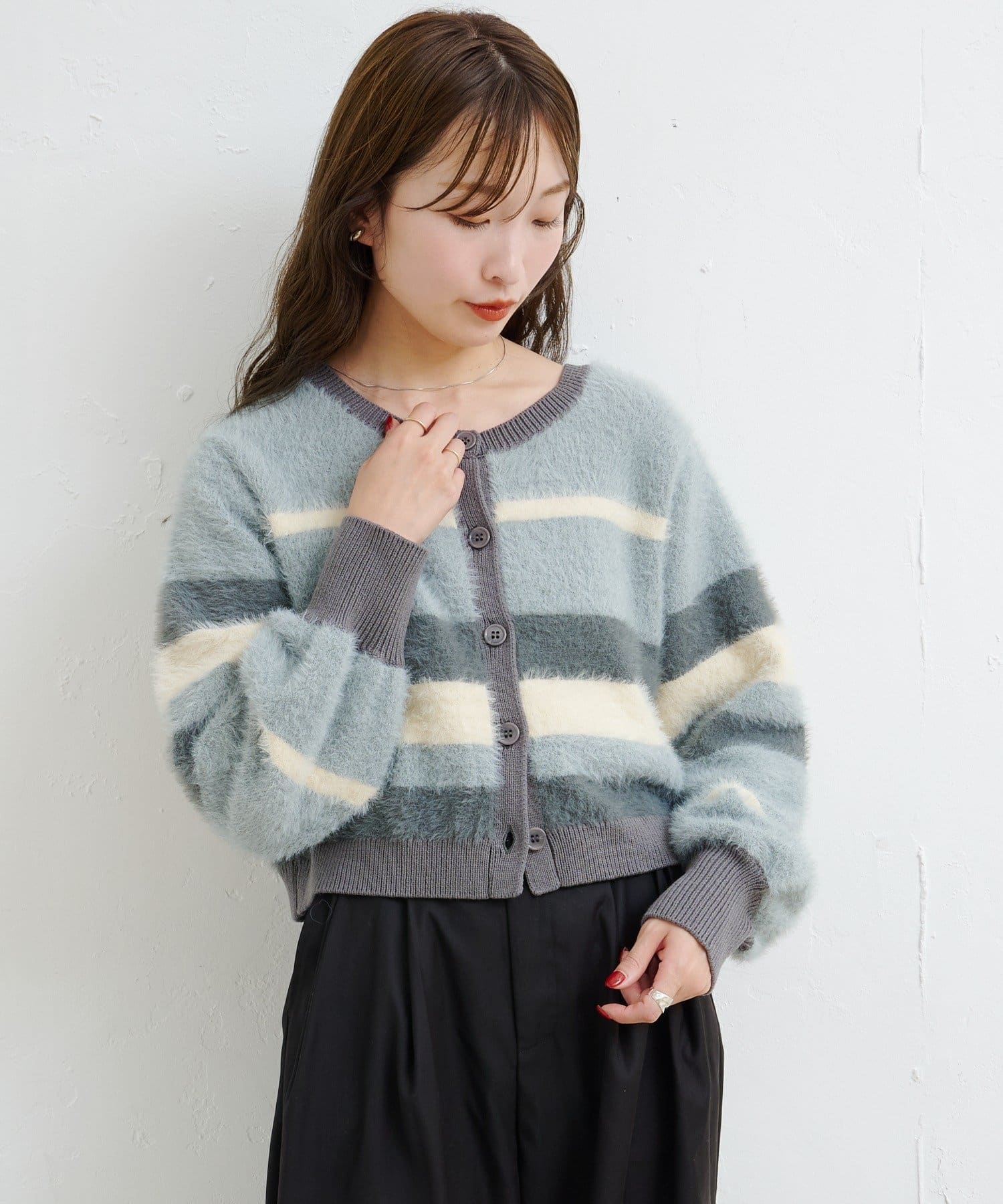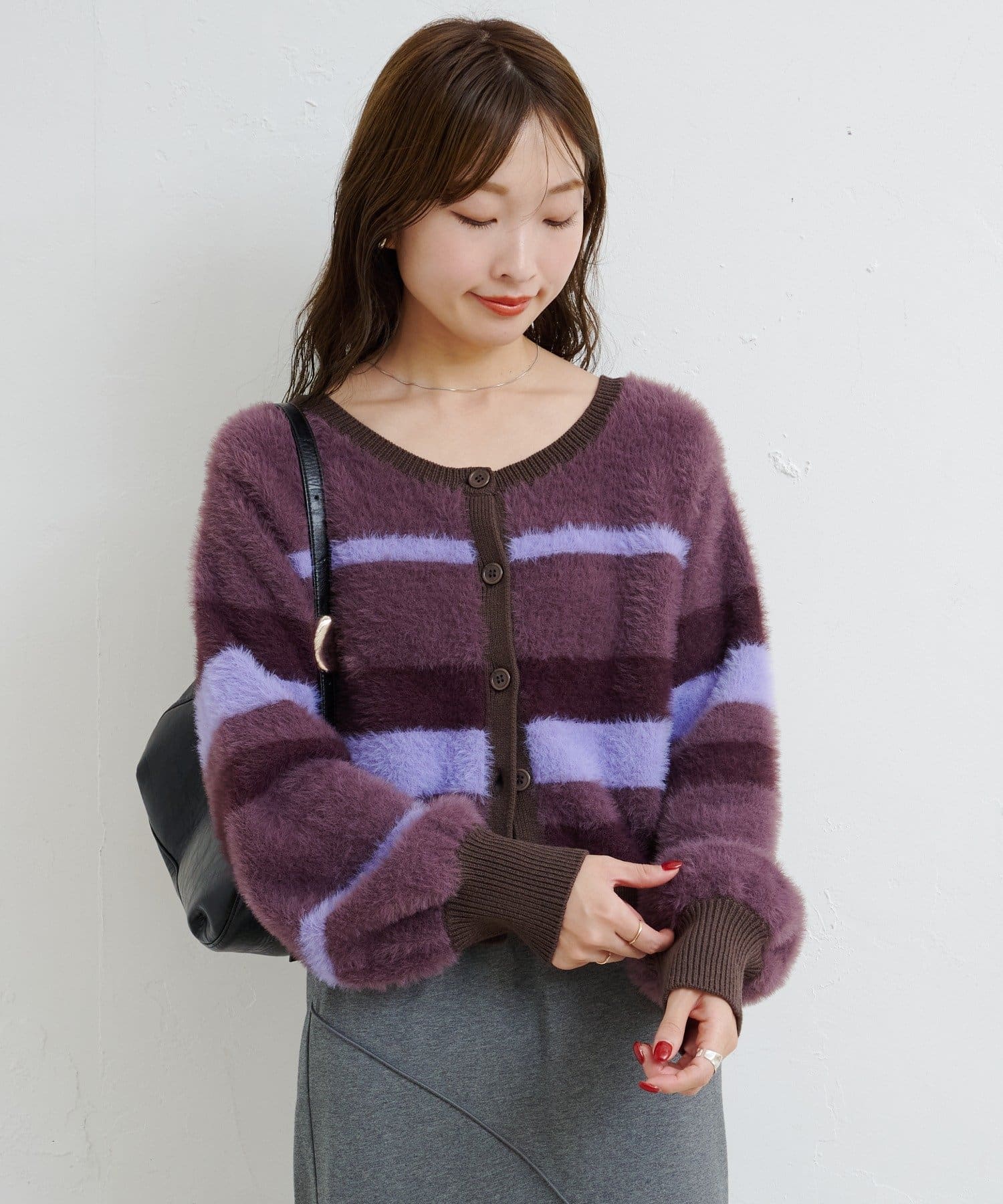ふんわりとしたシャギー素材が魅力の2WAYボーダーカーディガン。