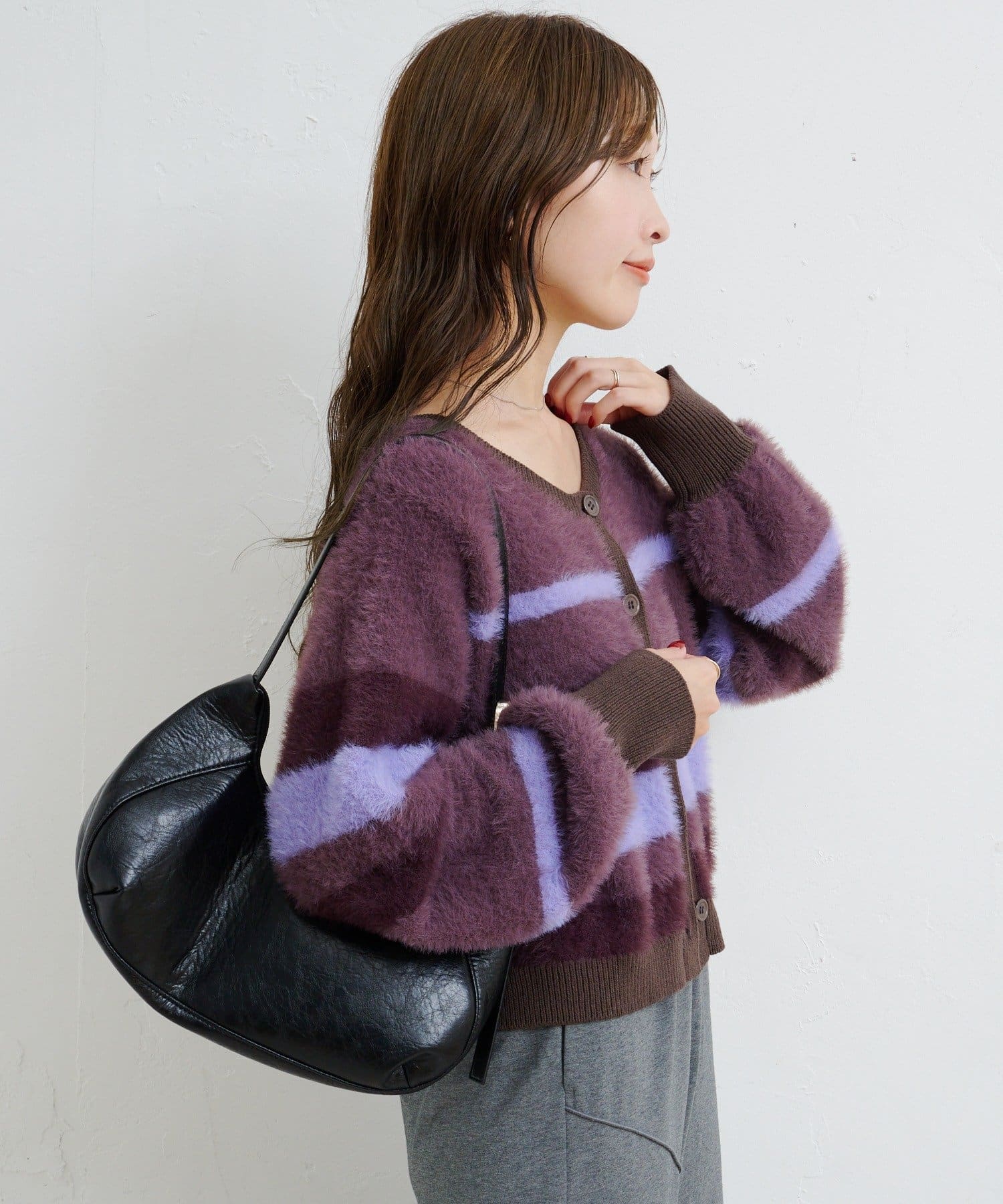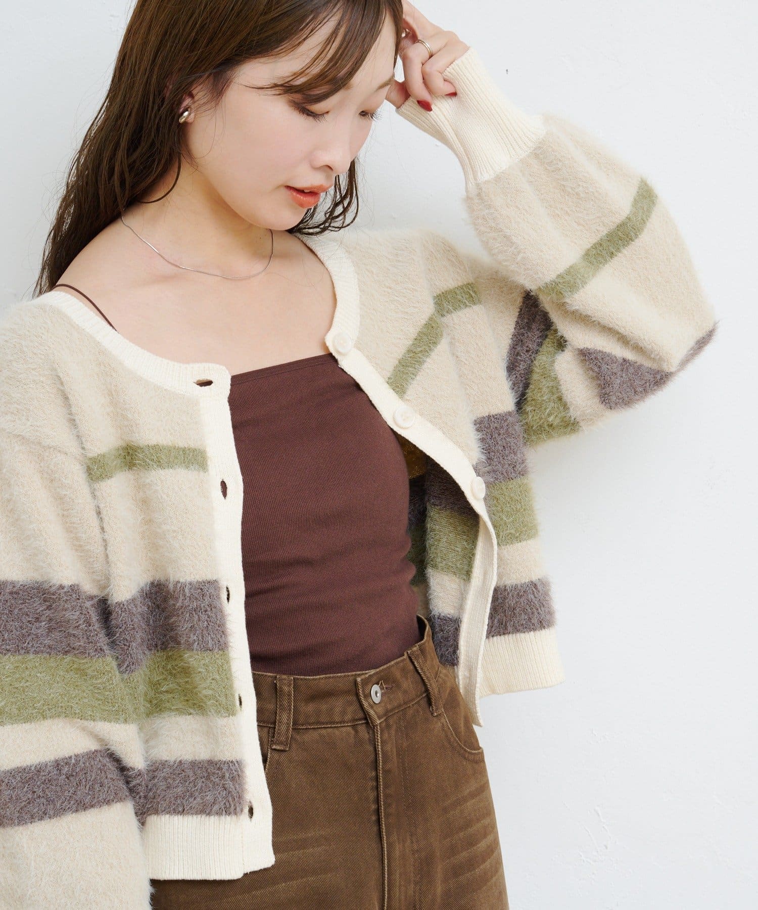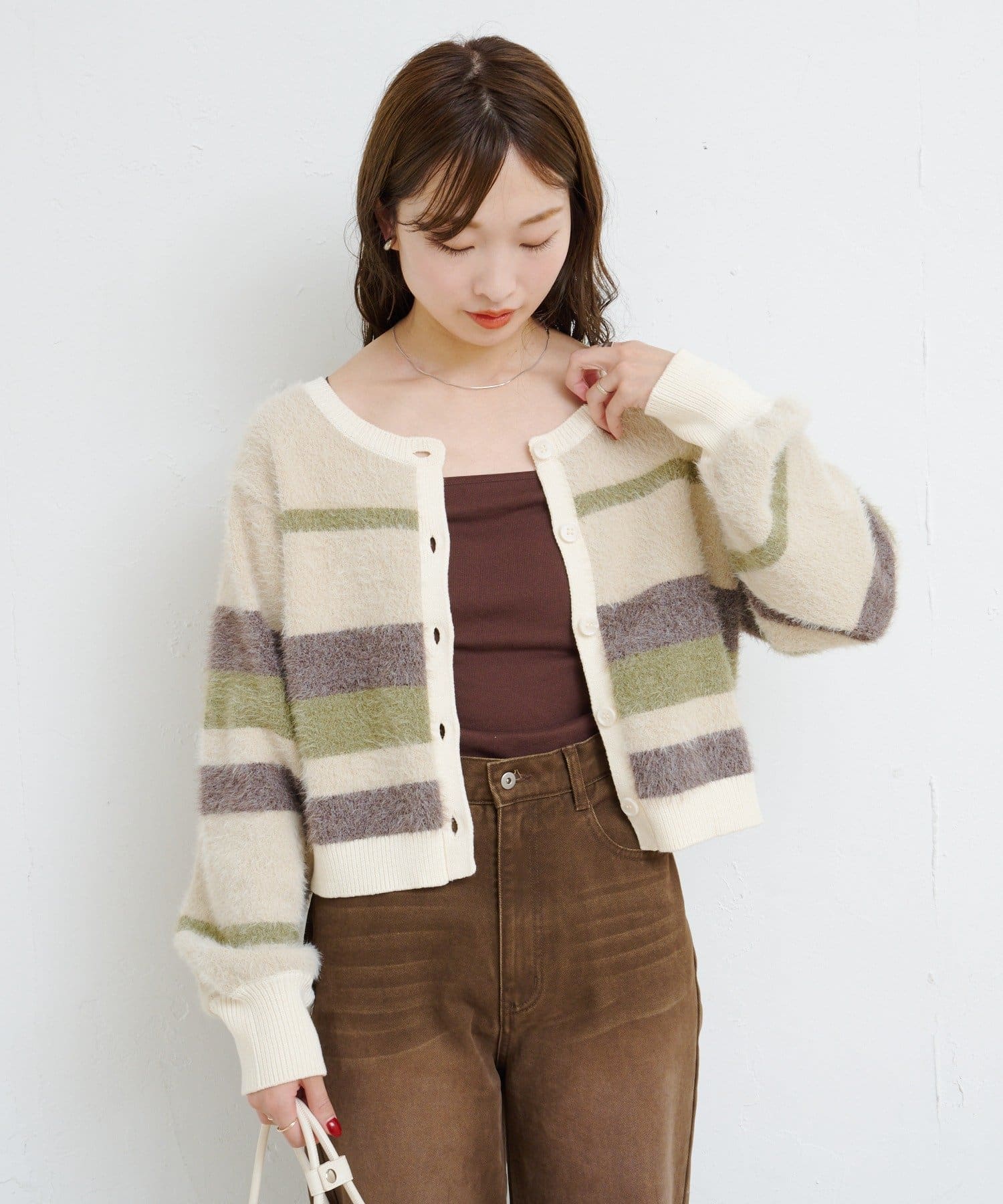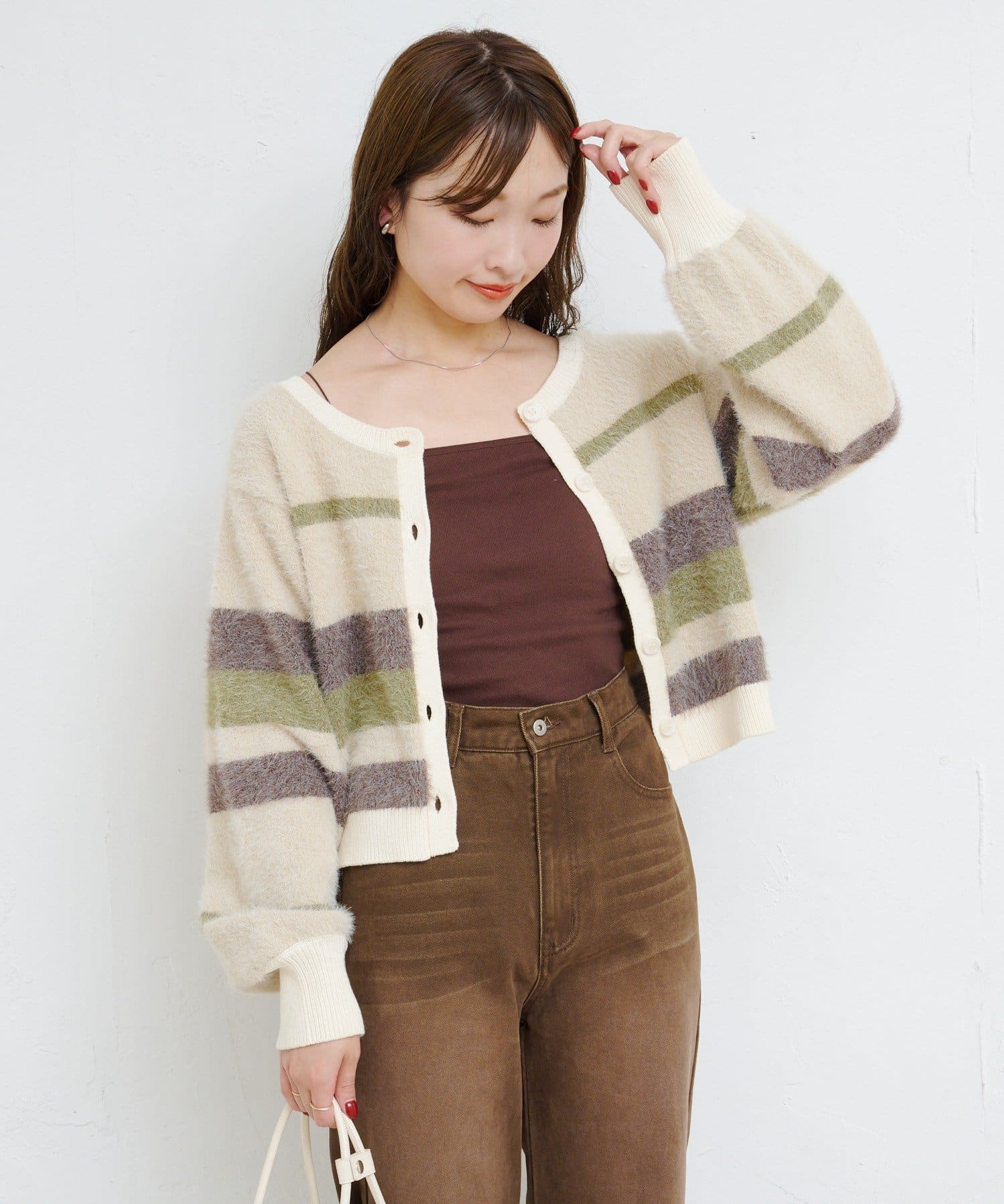 ふんわりとしたシャギー素材が魅力の2WAYボーダーカーディガン。
