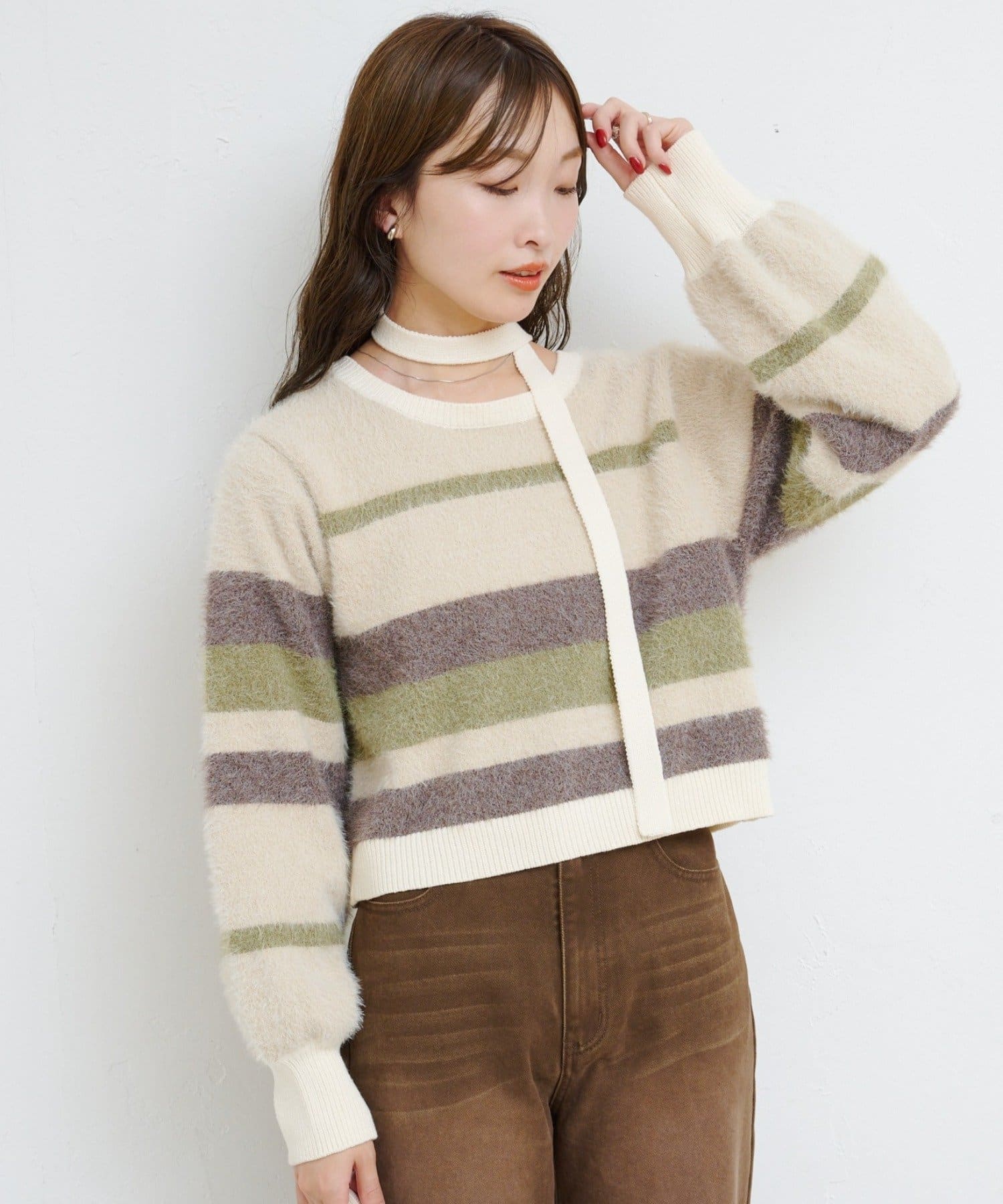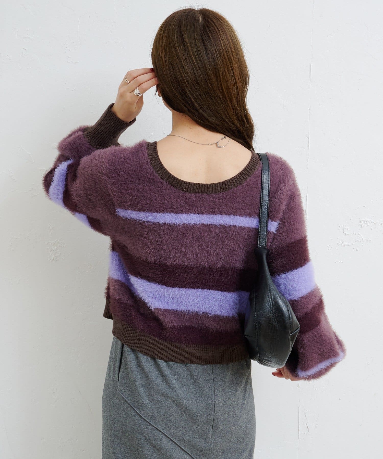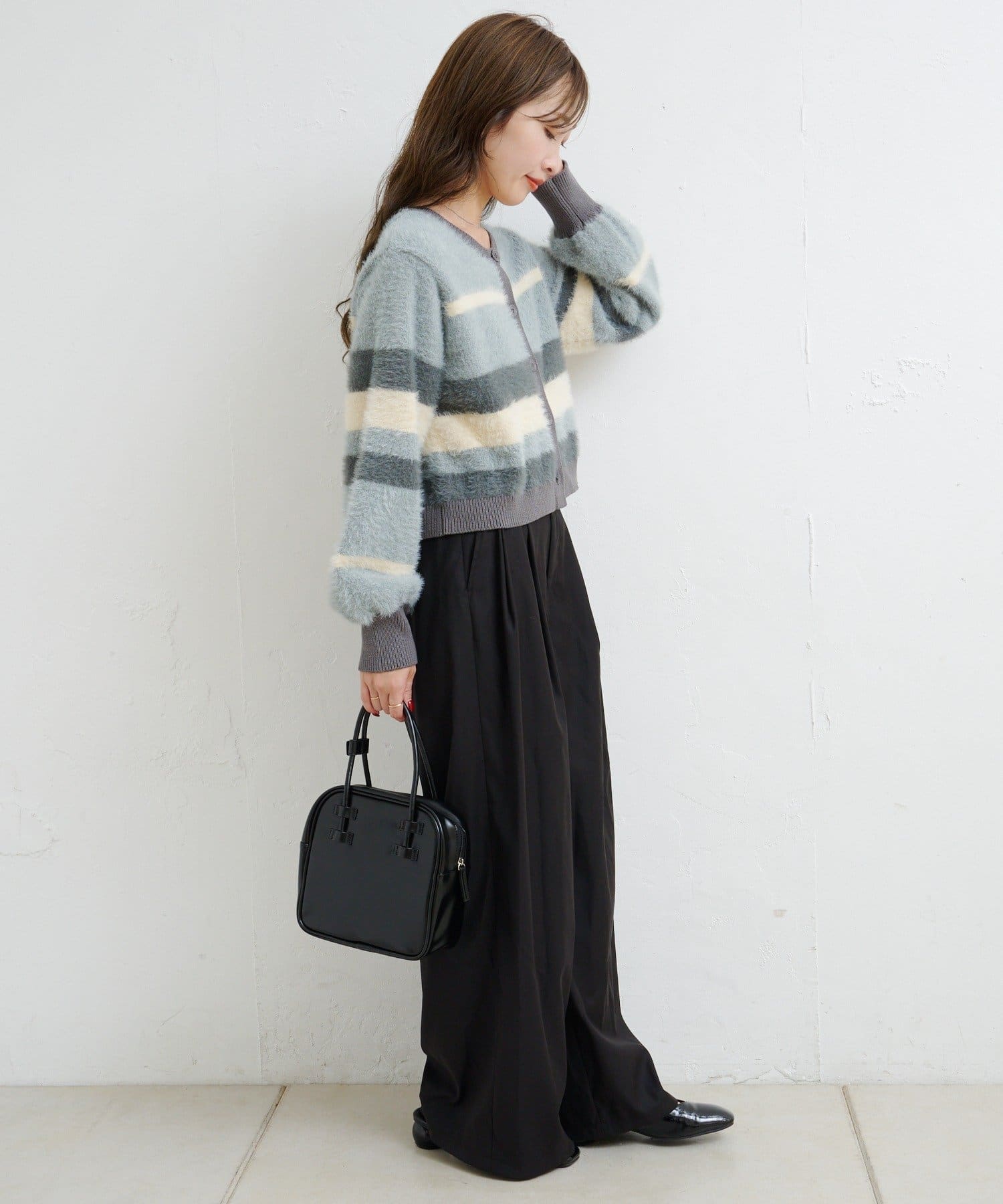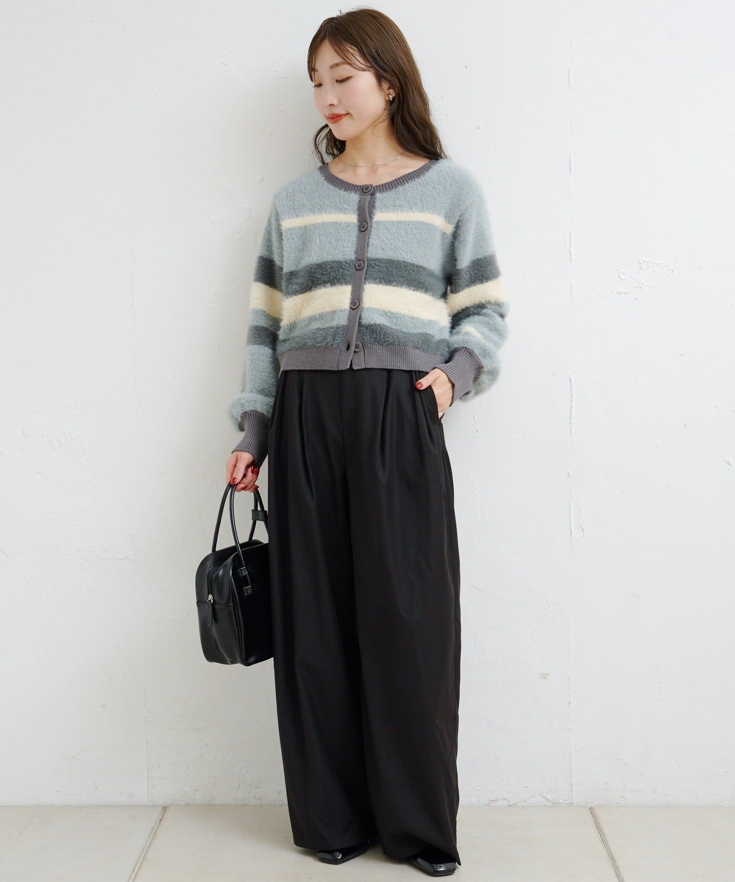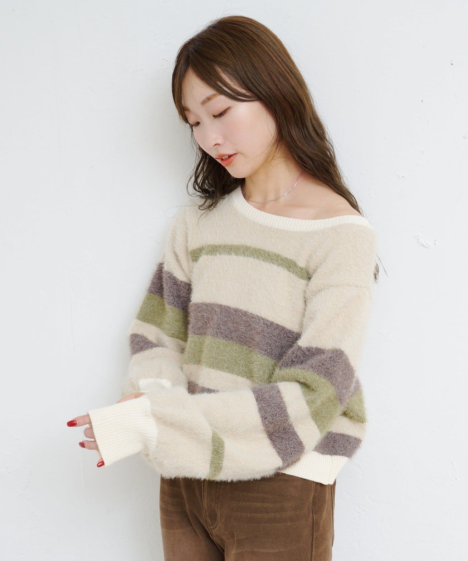 ふんわりとしたシャギー素材が魅力の2WAYボーダーカーディガン。