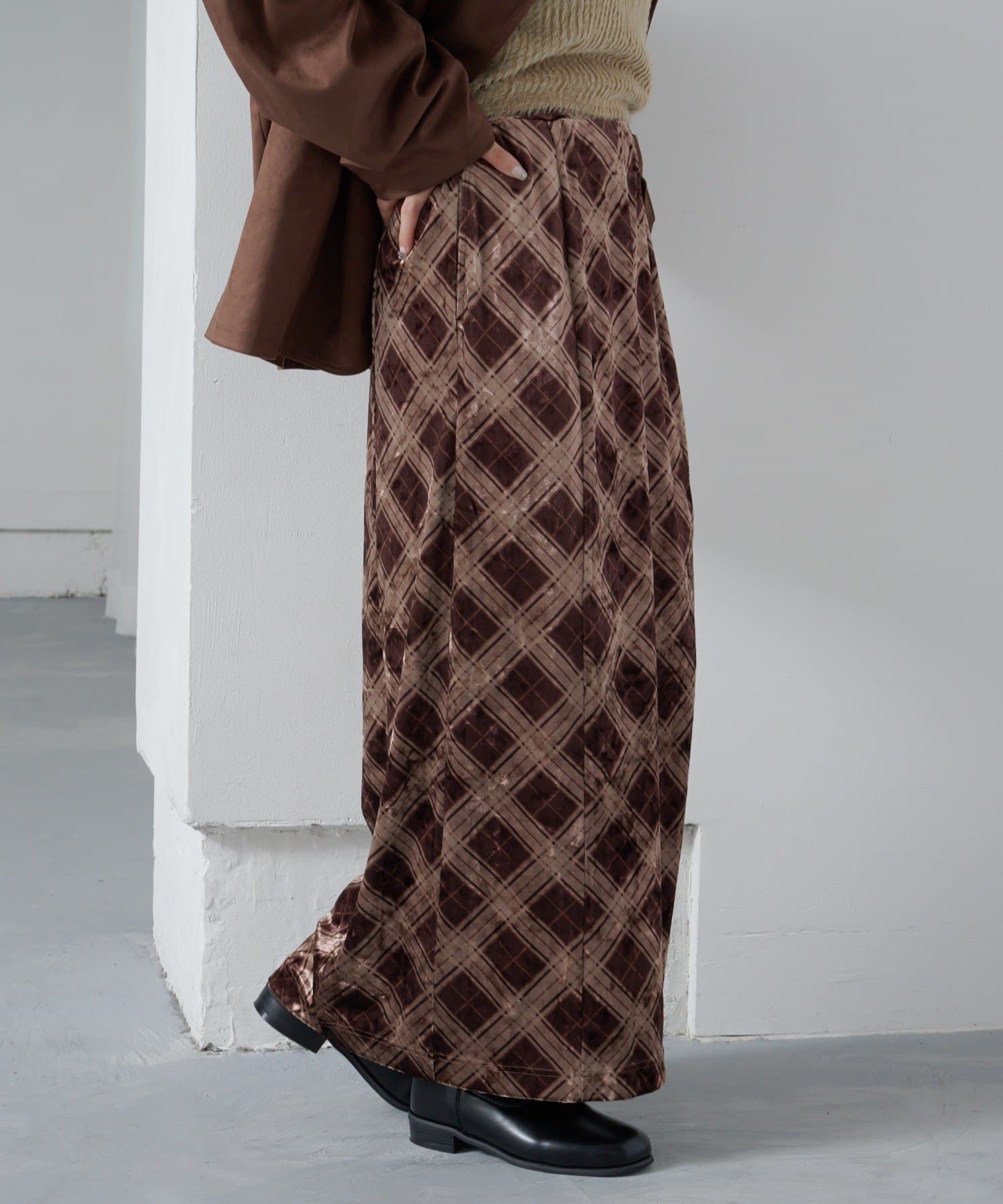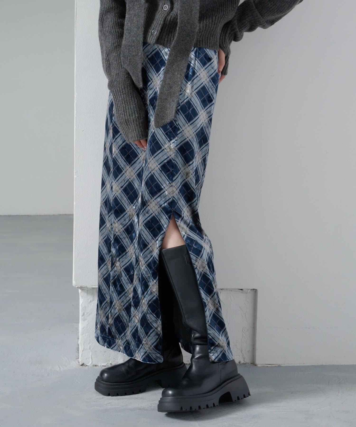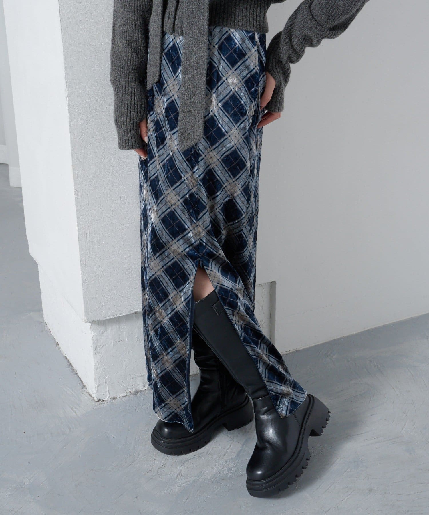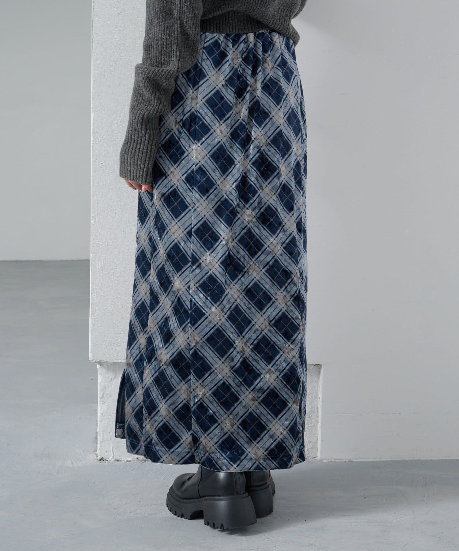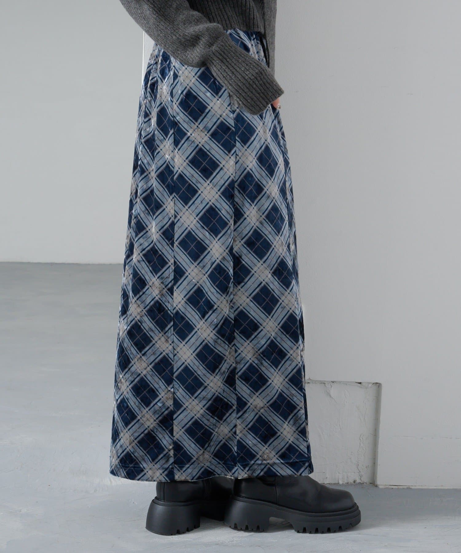 シーズンムードをぐっと高めてくれる、ベロア調素材のチェック柄スカート。