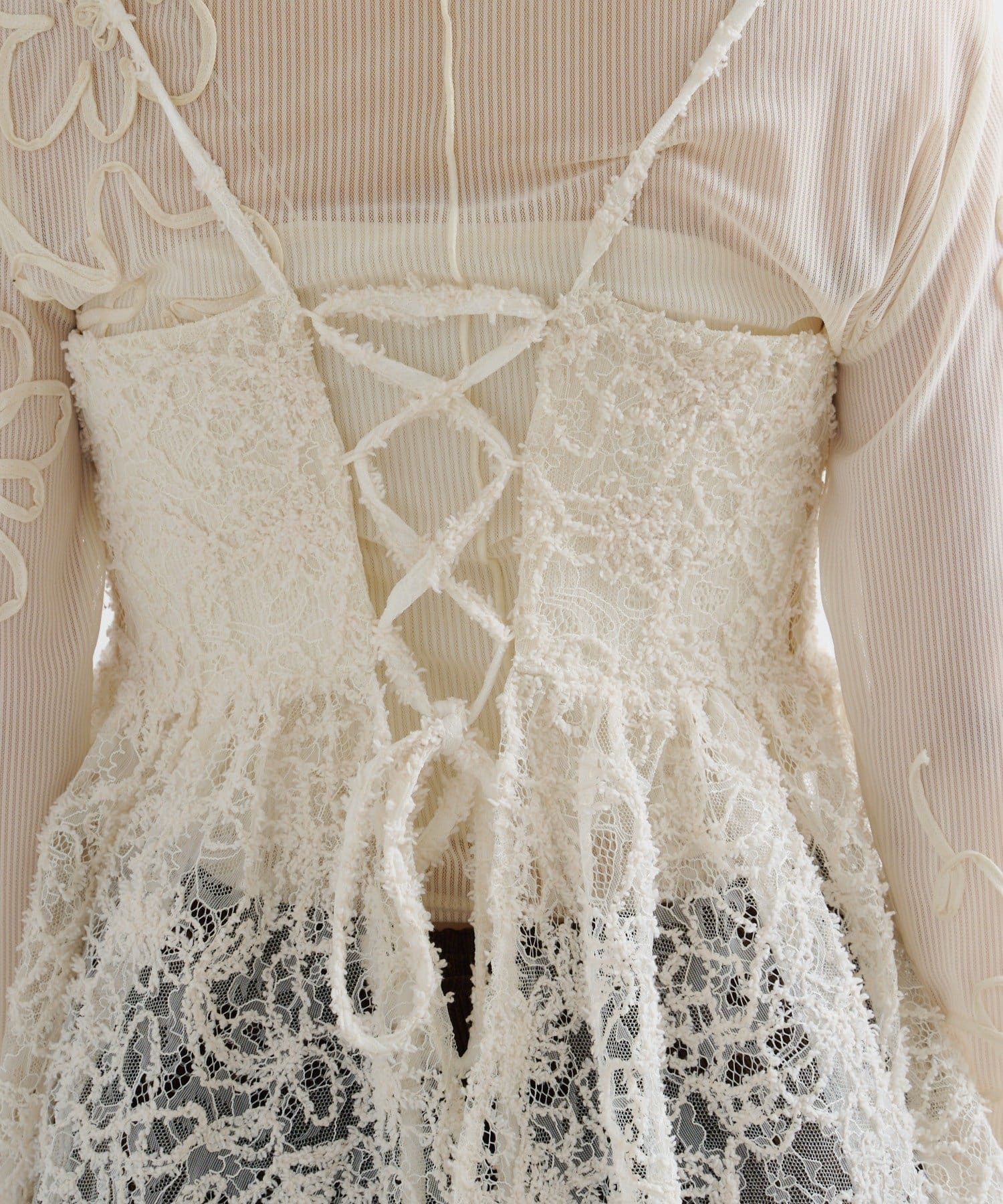 フェザーのように軽やかなレース素材を使用したショートビスチェ。