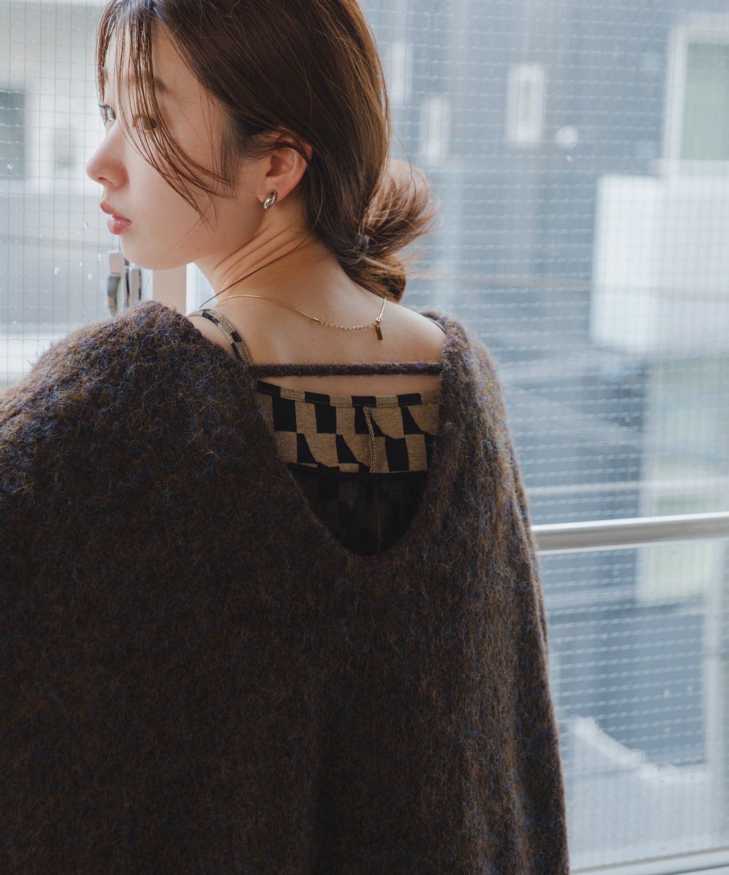 メランジ糸で仕立てたVネックニットは、前後どちらでも着用できる2WAY仕様。