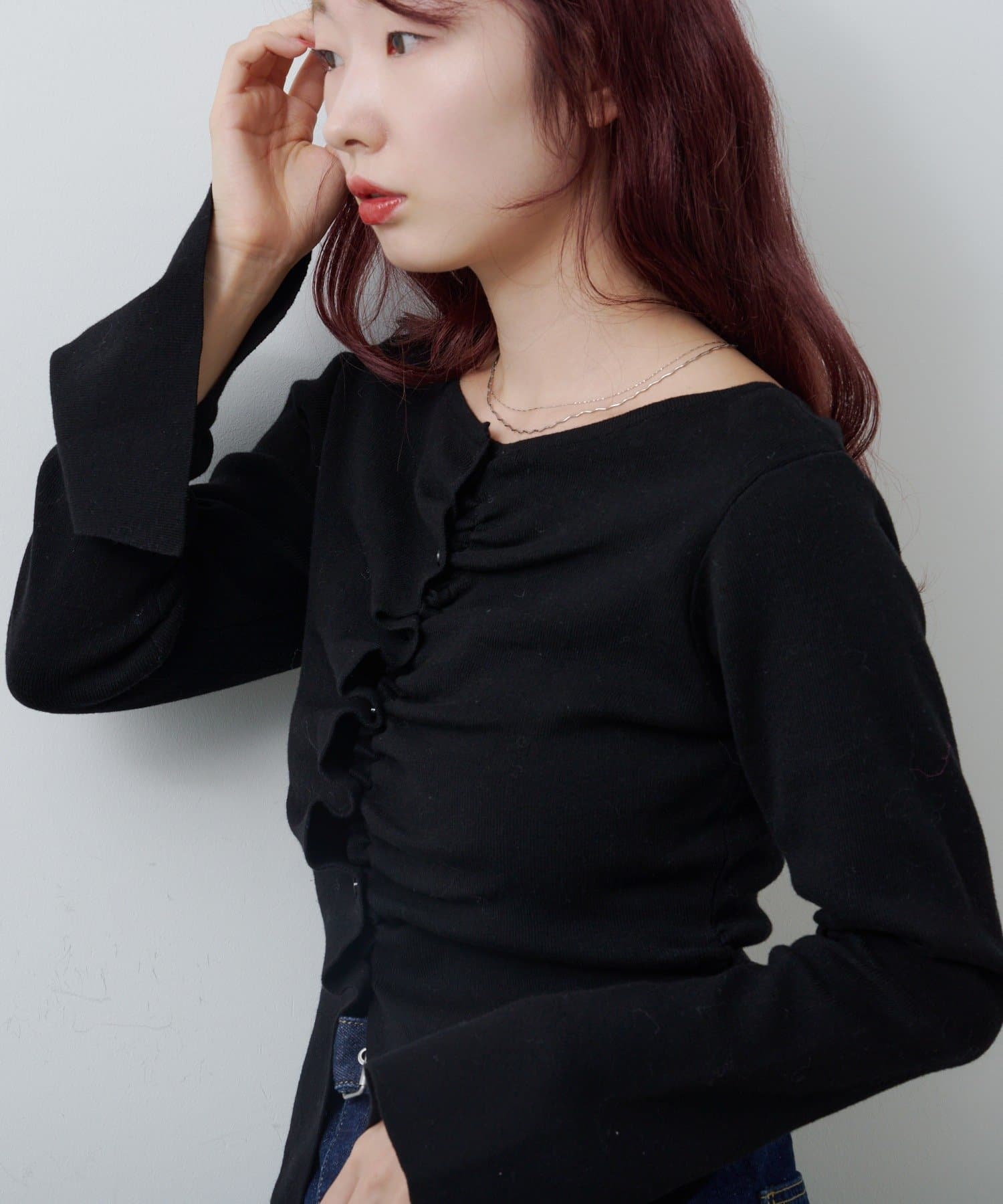 立体的なフロントギャザーがポイントのニットカーディガン。