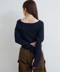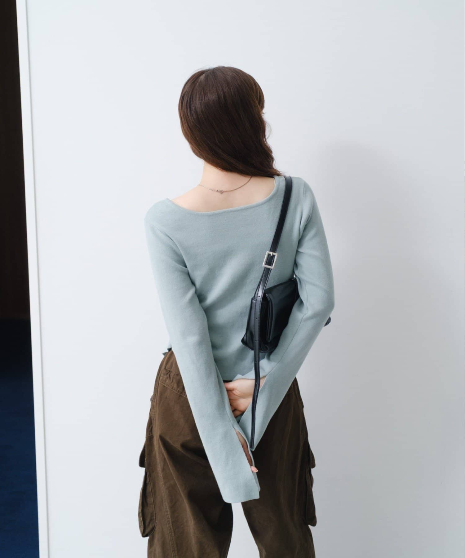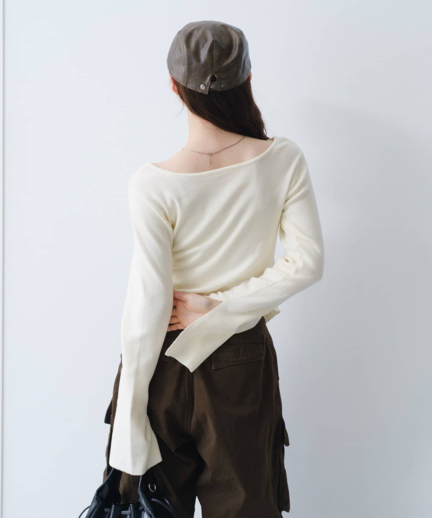 すっきりと開いたネックラインが顔まわりを華やかに見せ、ほどよくフィットするシルエットで着痩せが叶うトップス。
