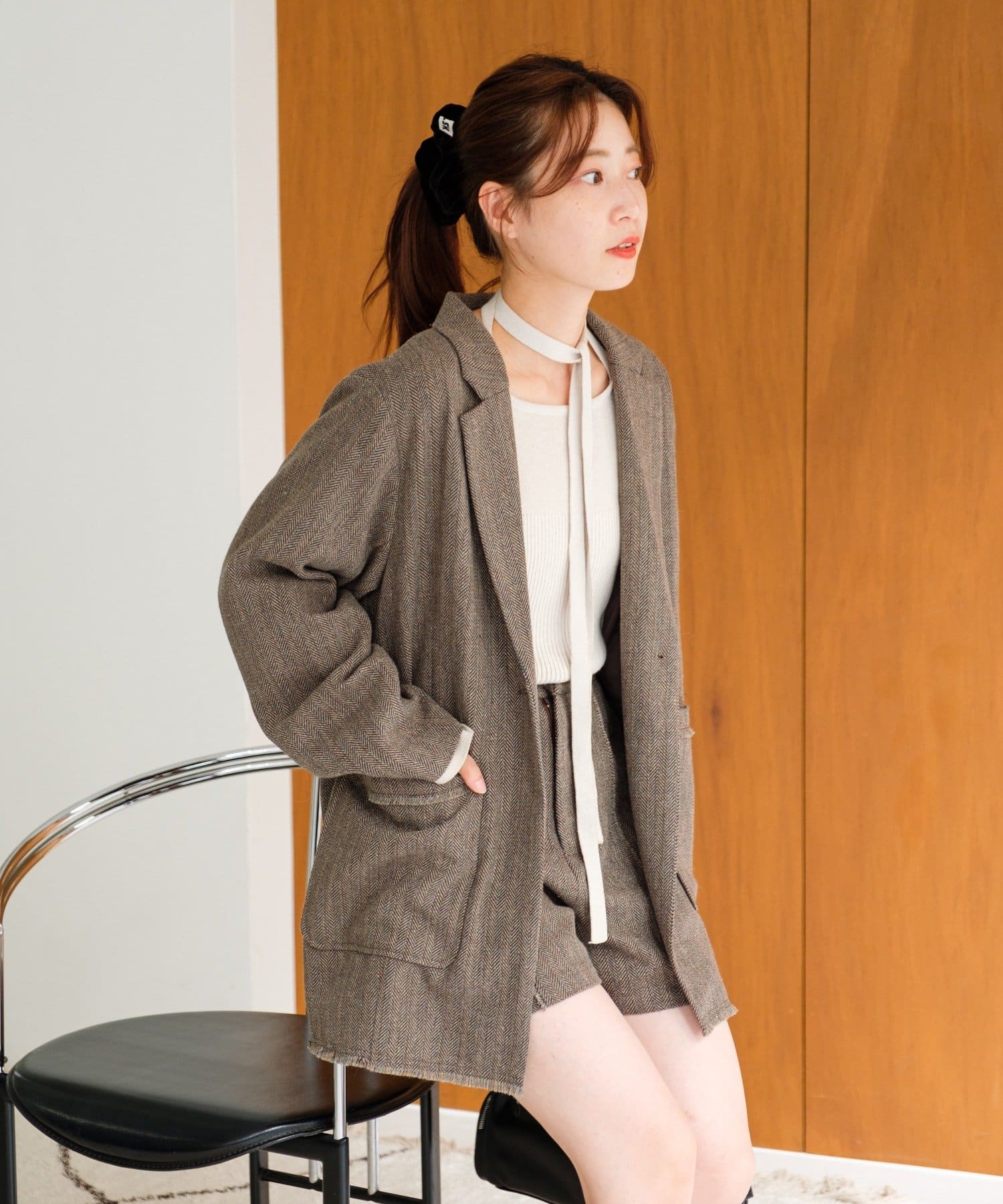 長めのリボンが首元にアクセントを加え、女性らしい印象を演出します。