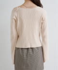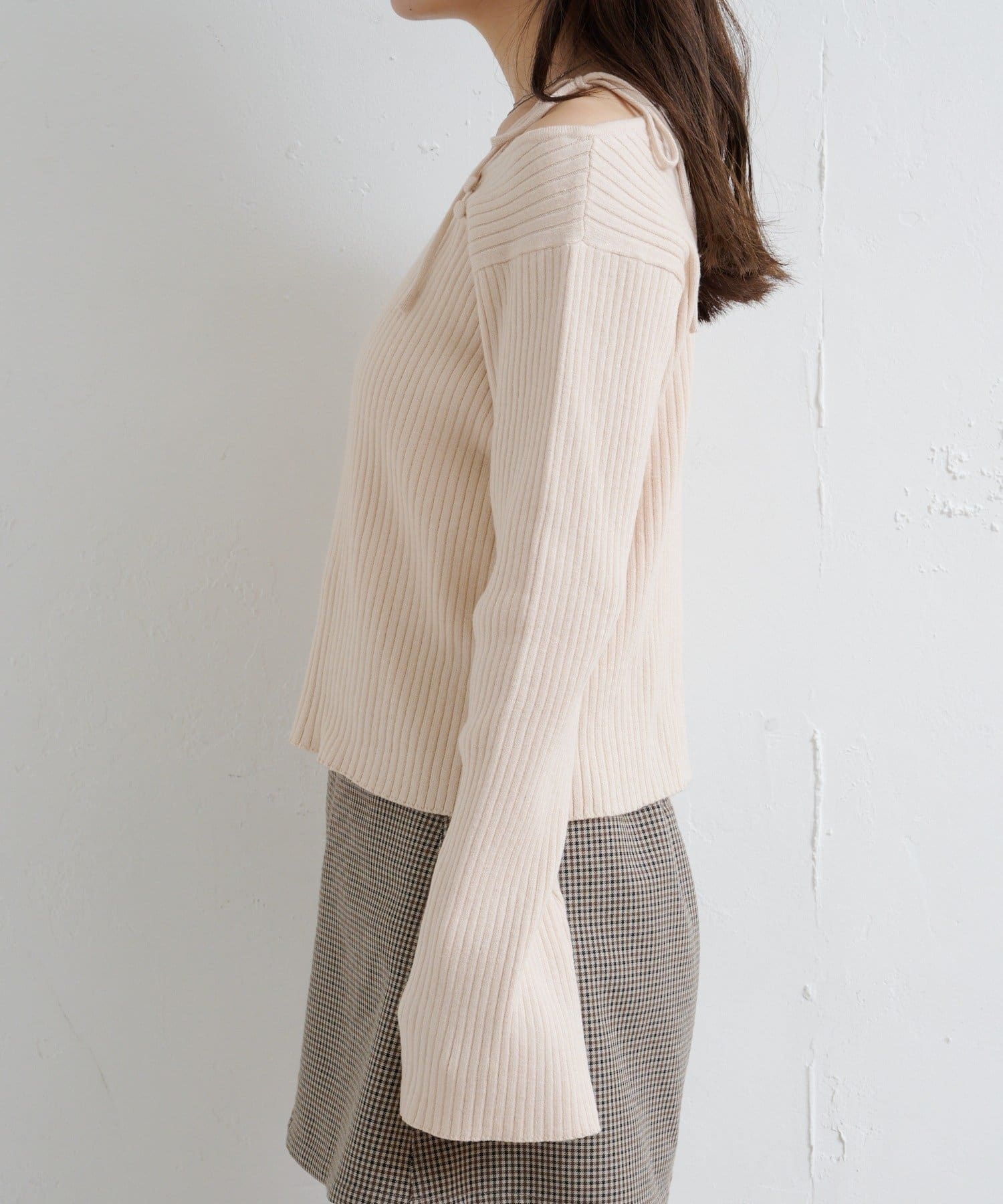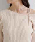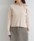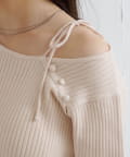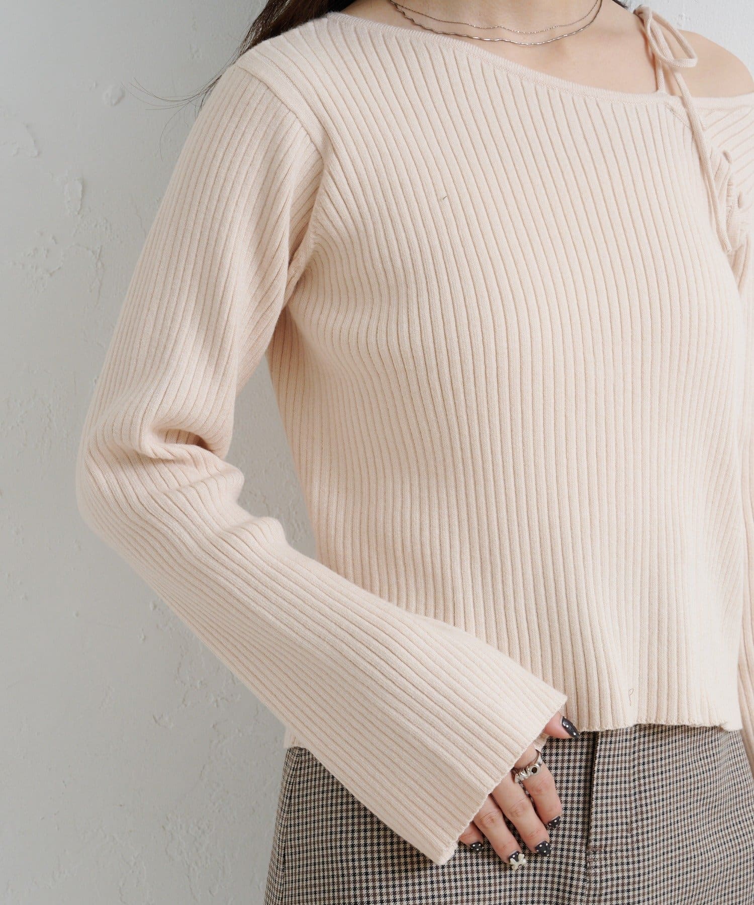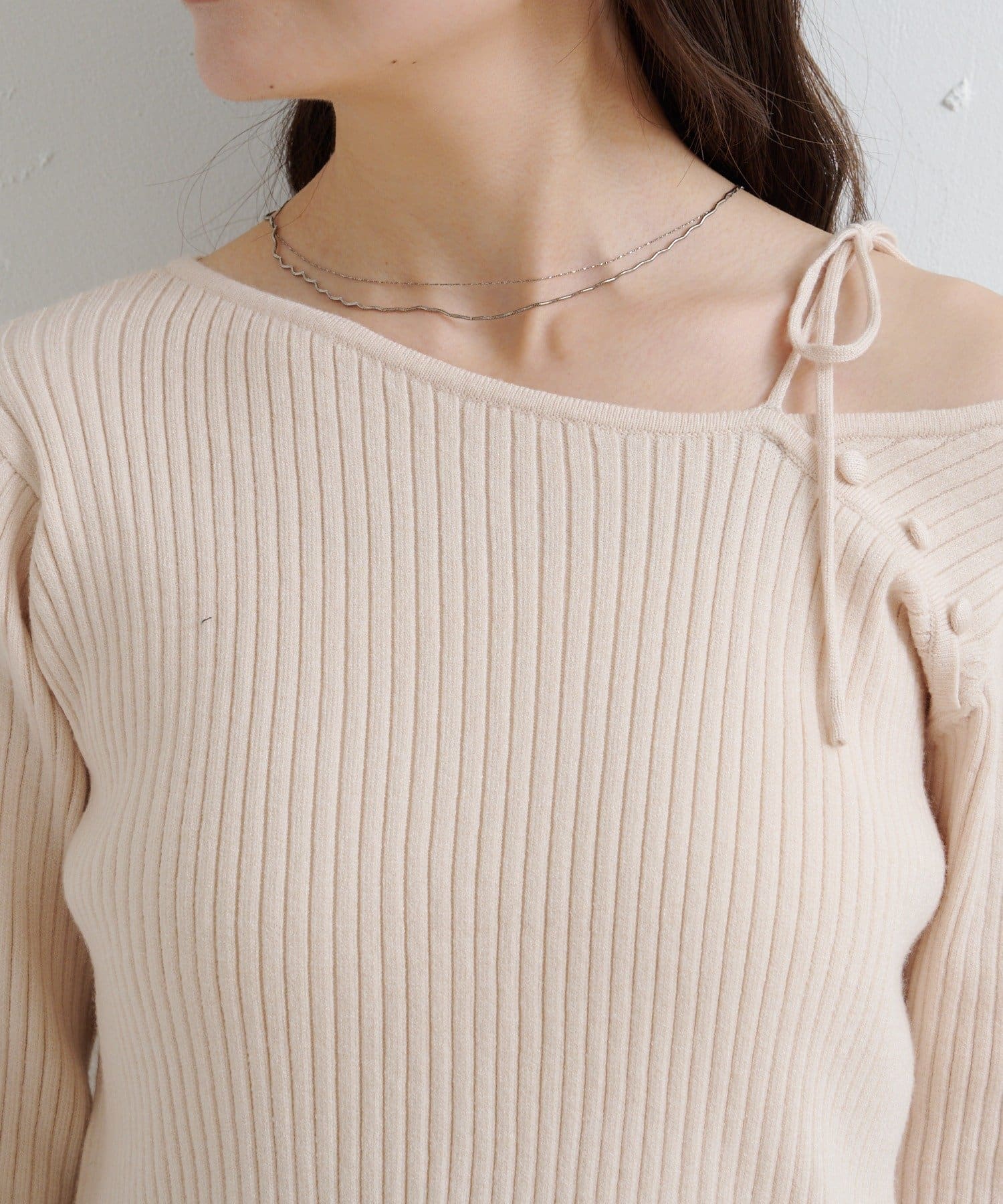 アシンメトリーなネックラインと肩のリボンデザインが印象的なリブニット。