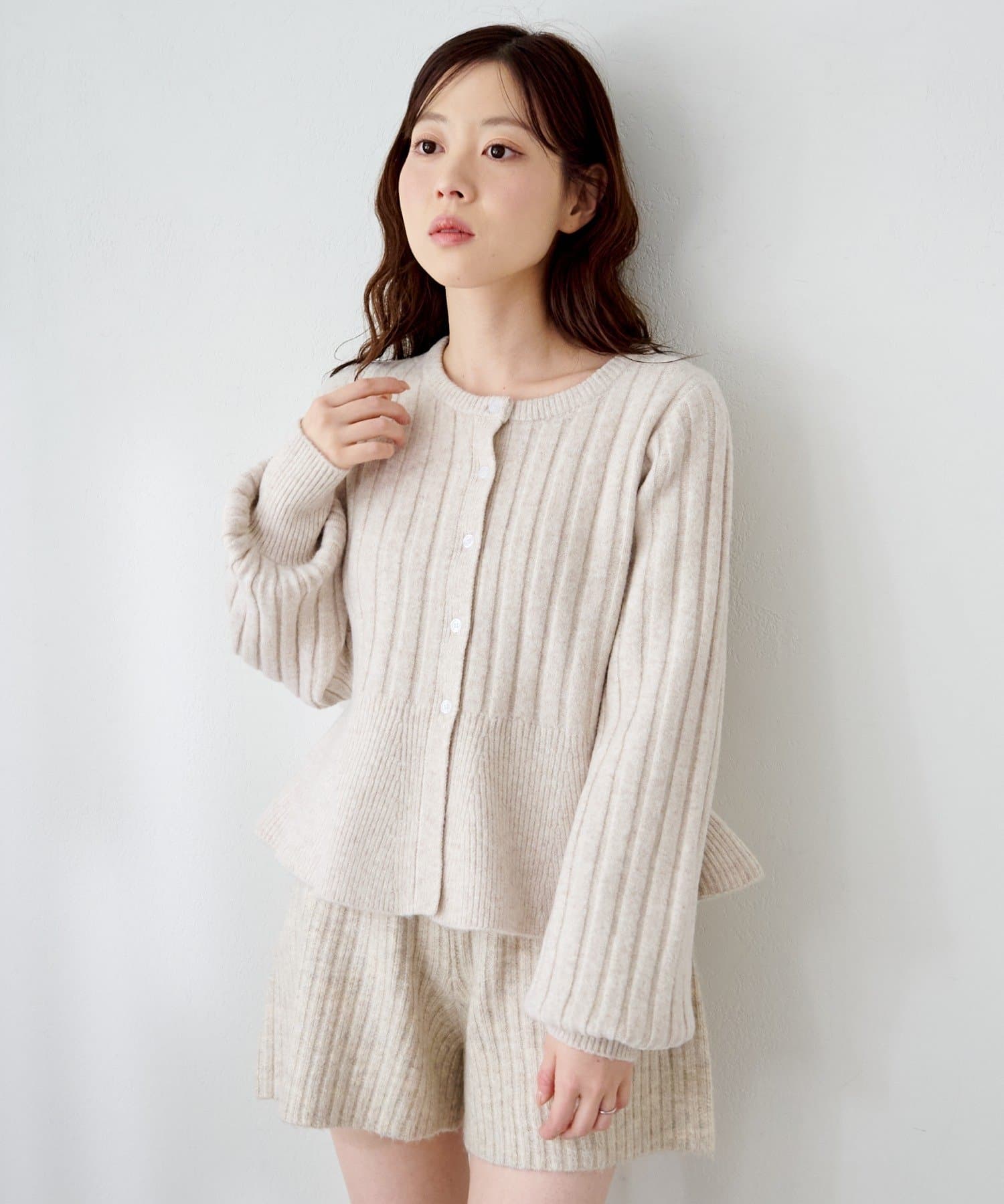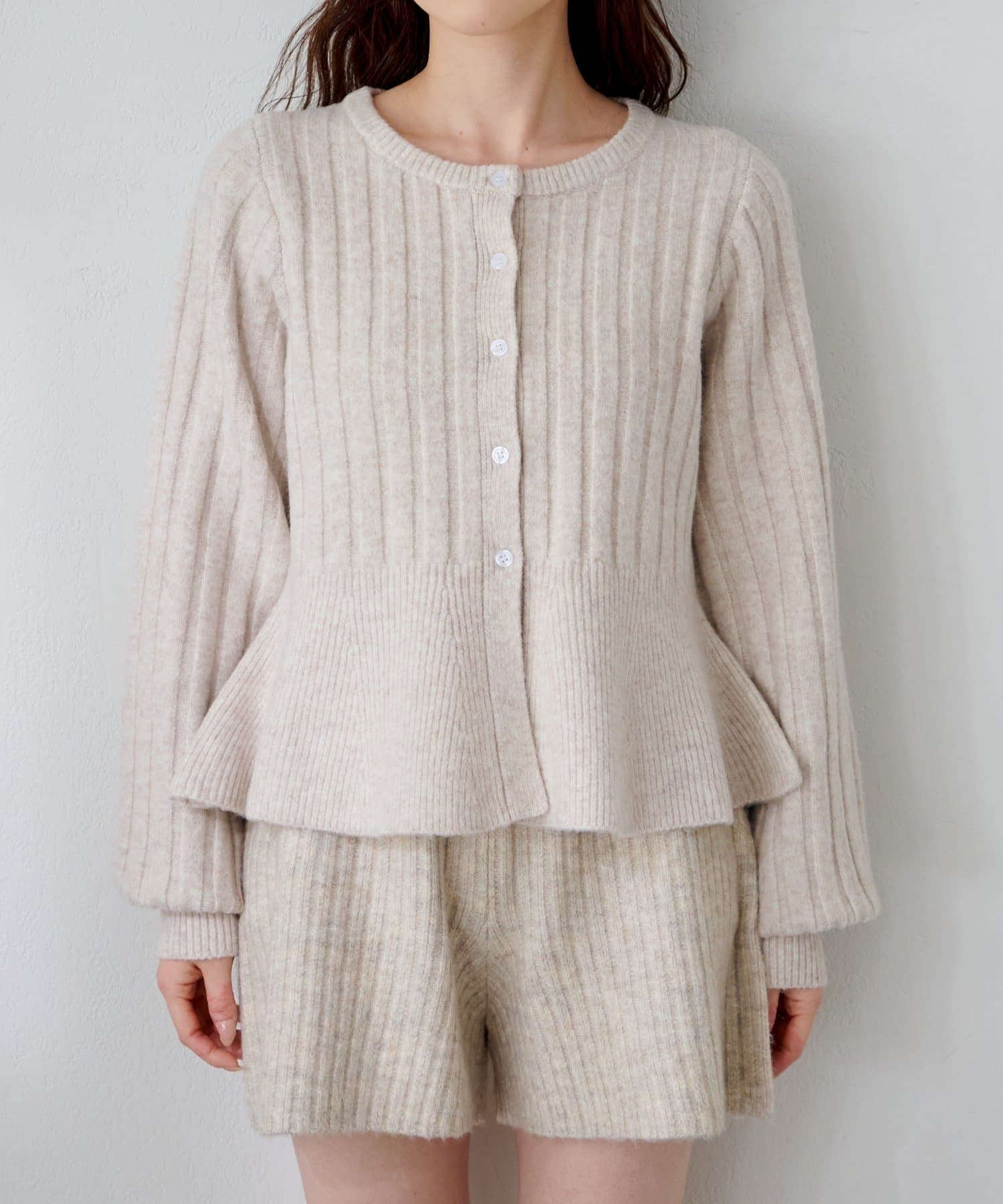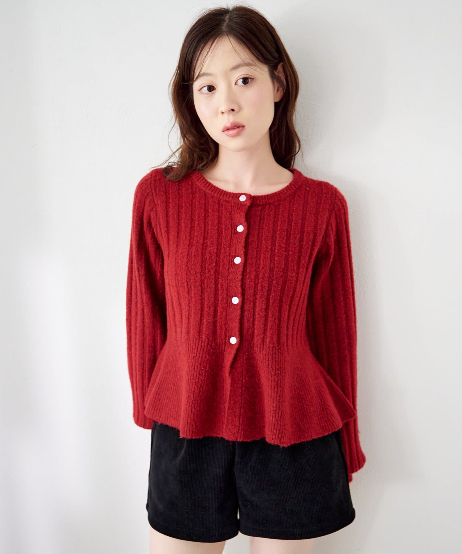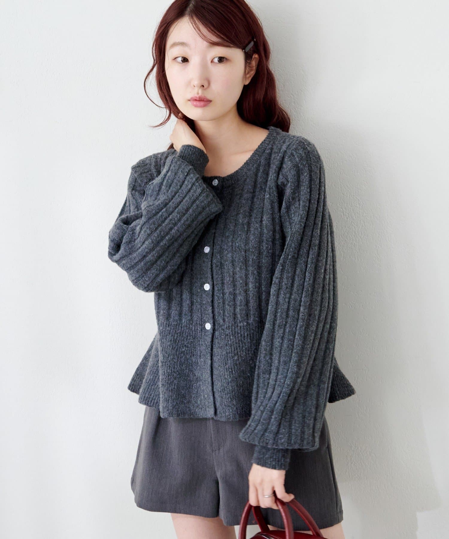 ウエスト部分にふんわり広がるペプラムシルエットが女性らしい印象を演出するリブニットカーディガン。