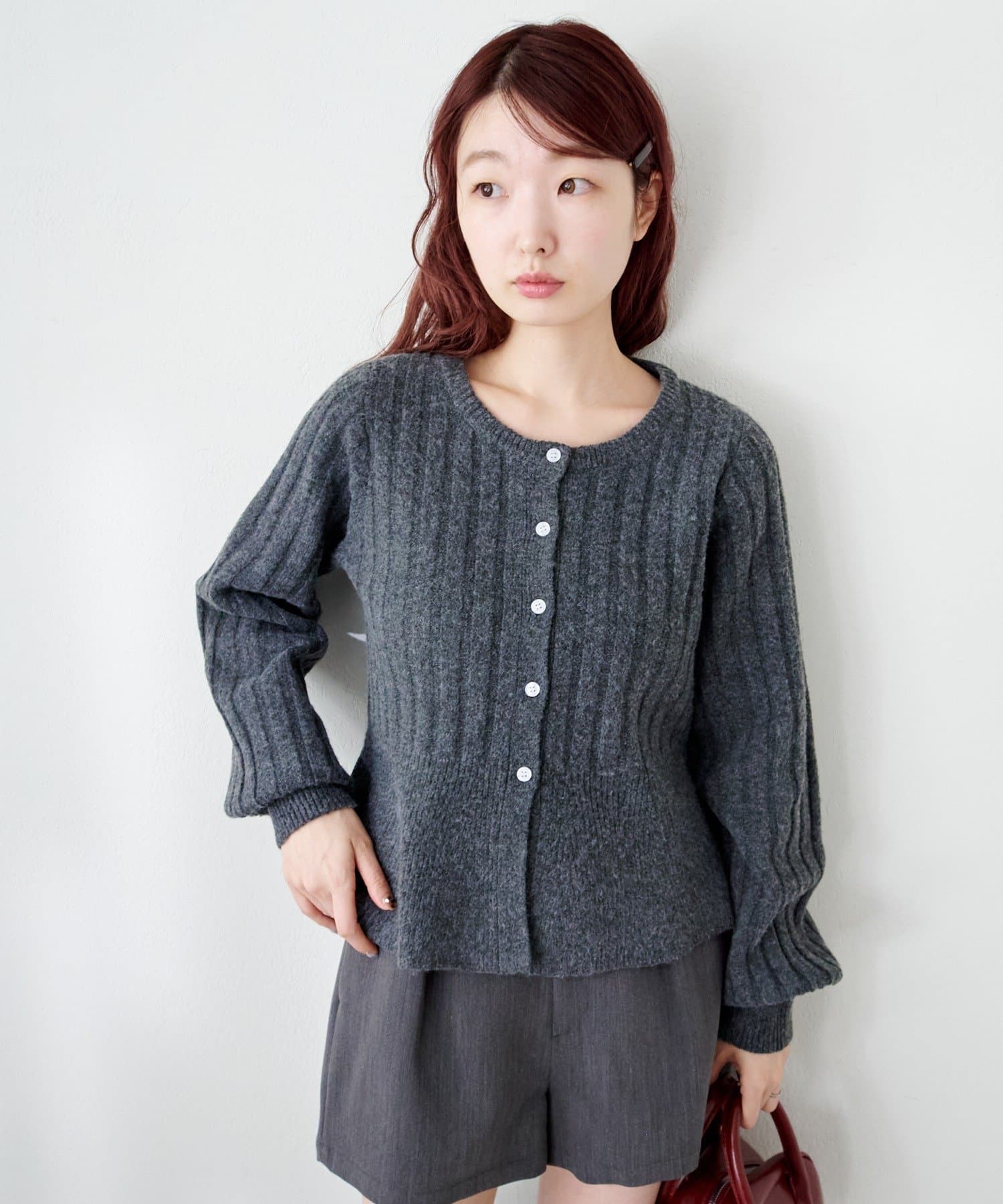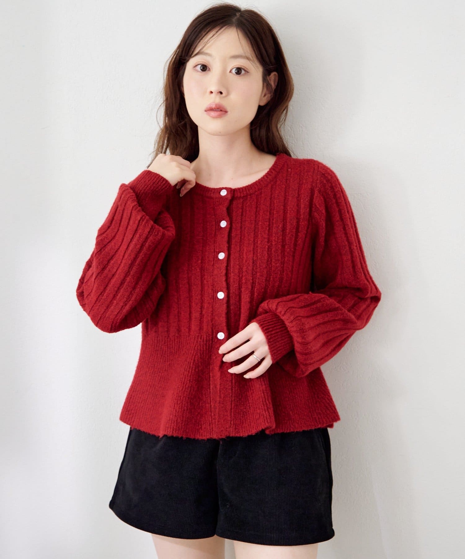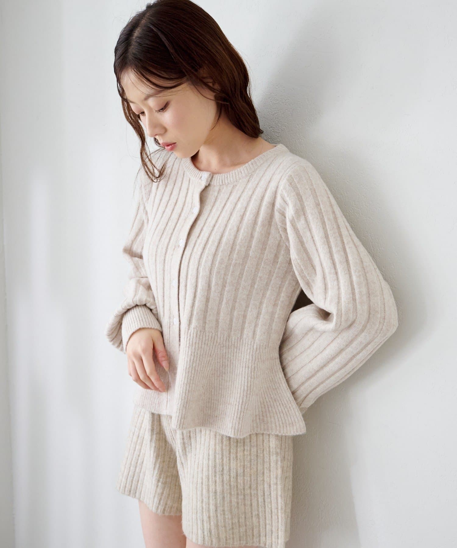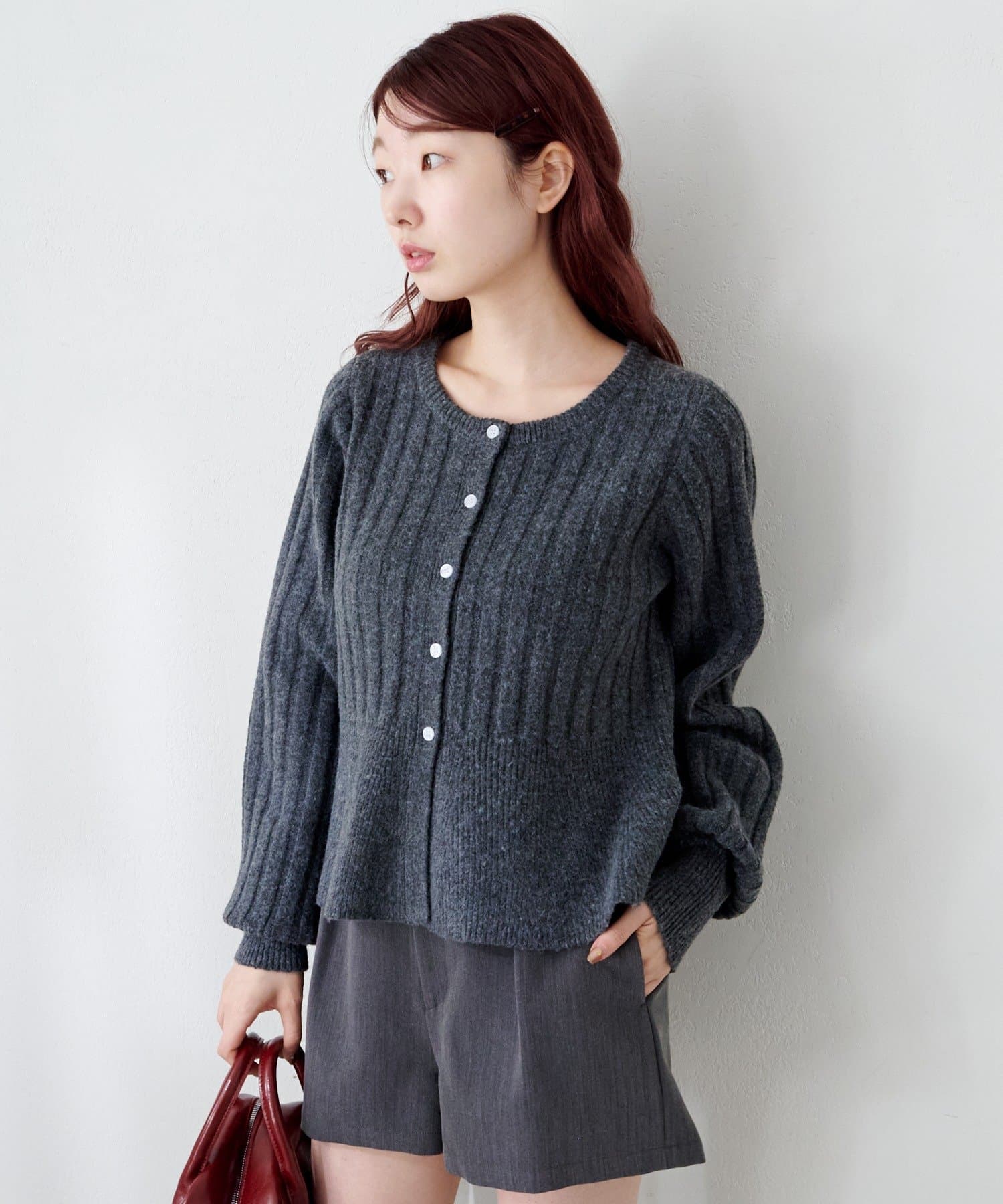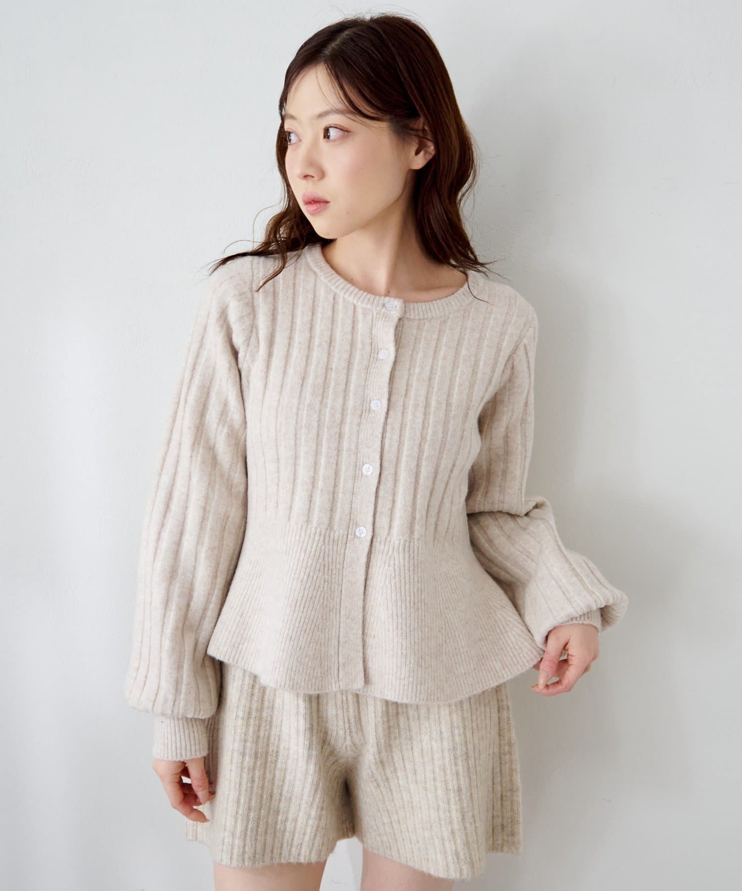 ウエスト部分にふんわり広がるペプラムシルエットが女性らしい印象を演出するリブニットカーディガン。