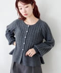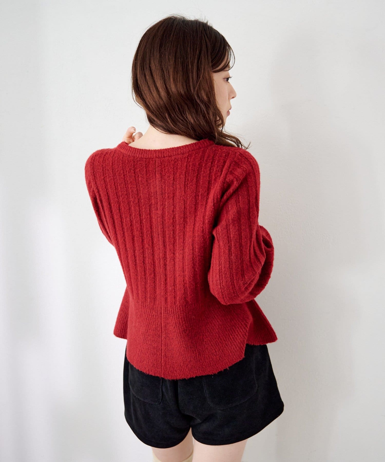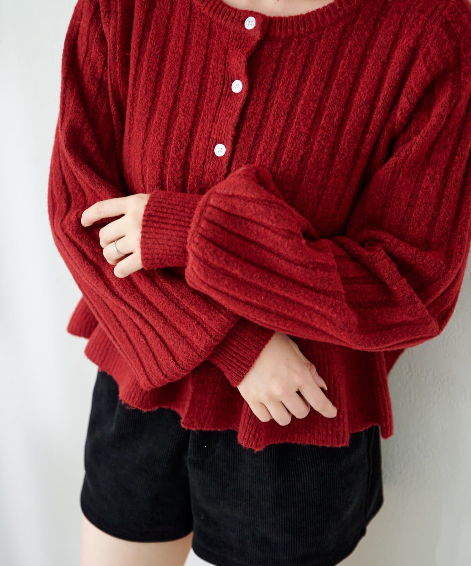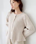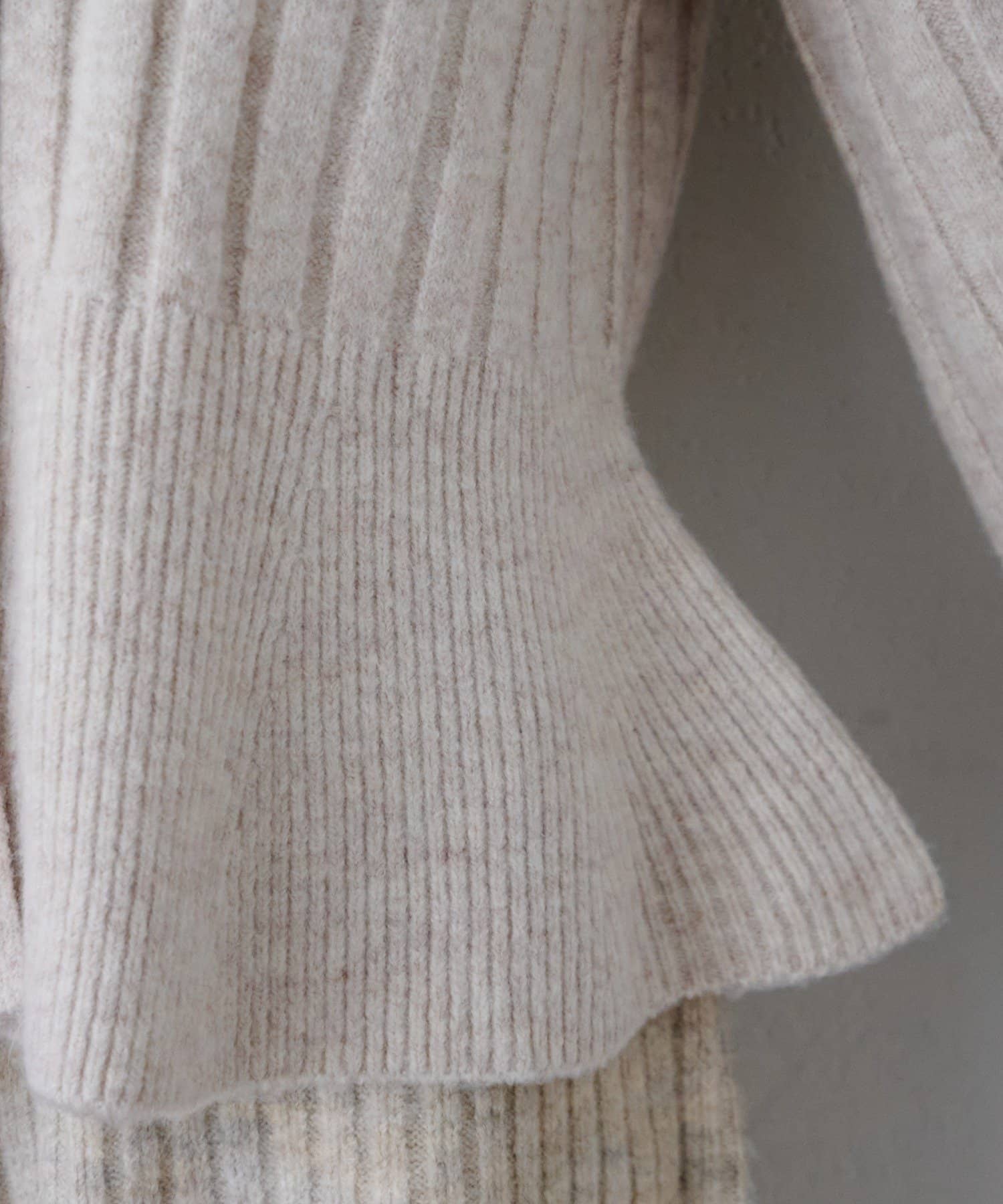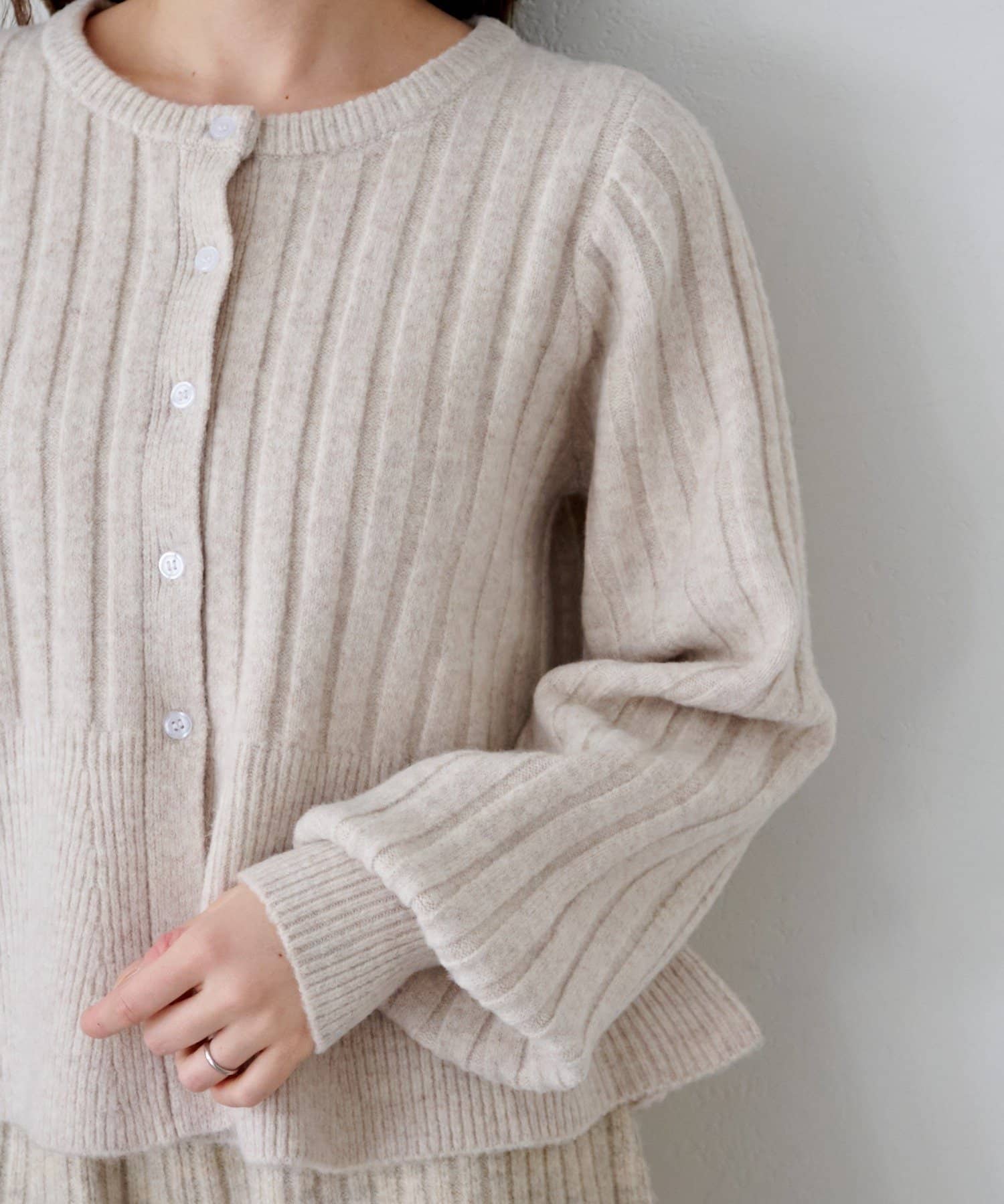 ウエスト部分にふんわり広がるペプラムシルエットが女性らしい印象を演出するリブニットカーディガン。