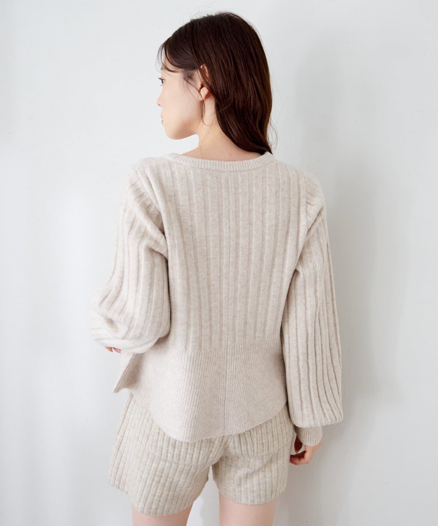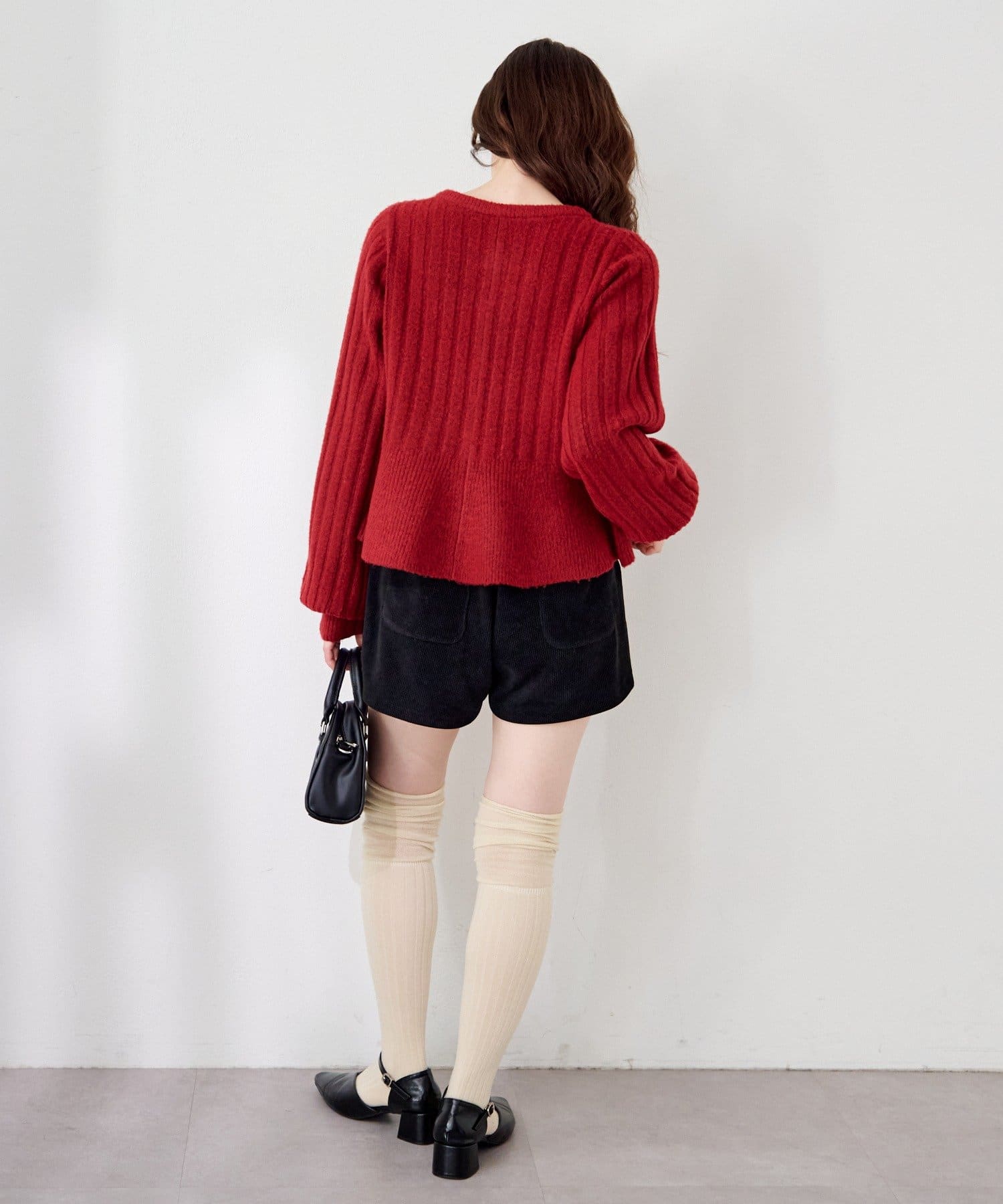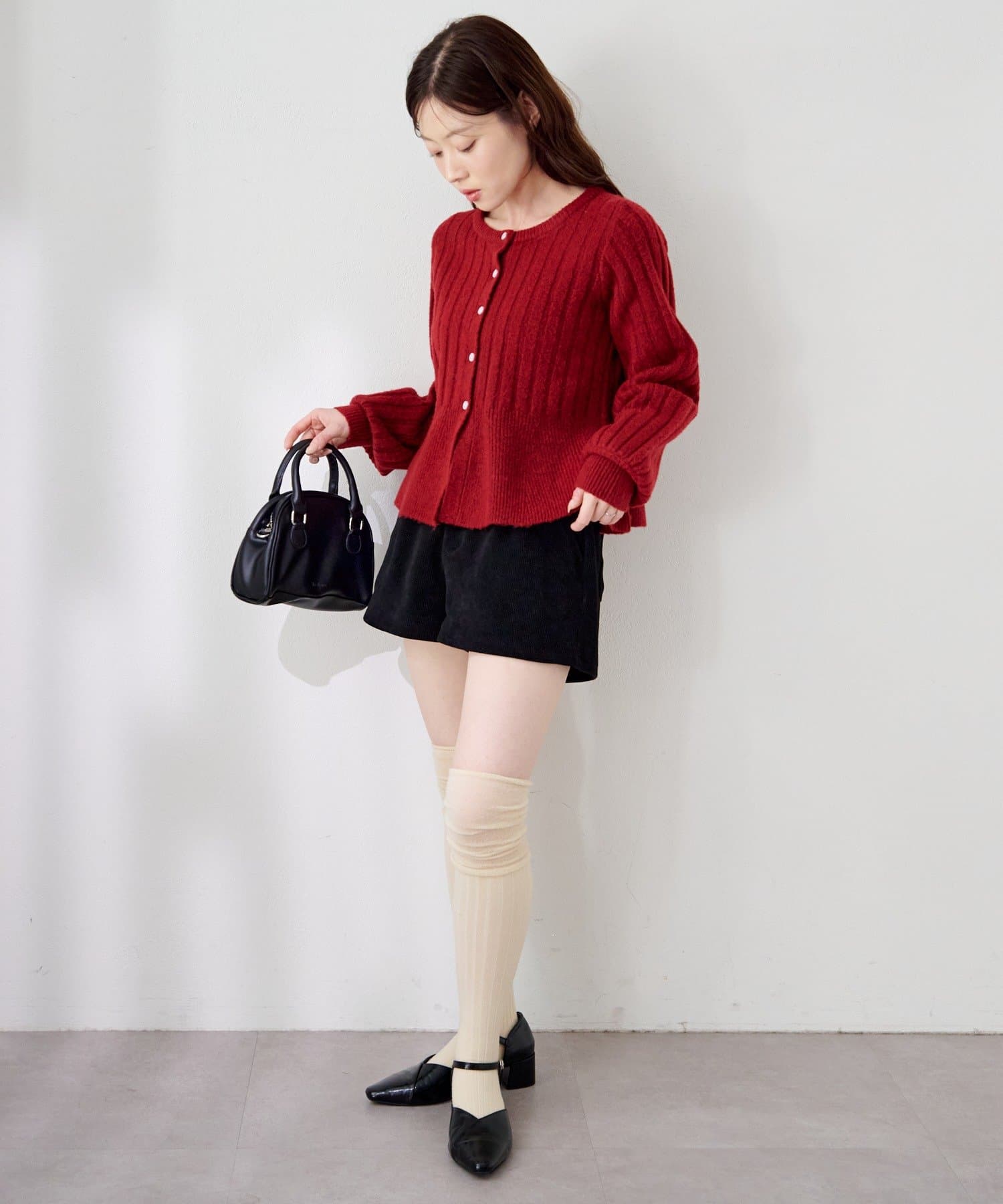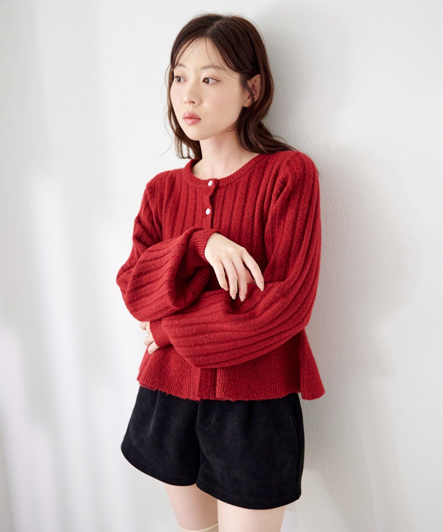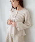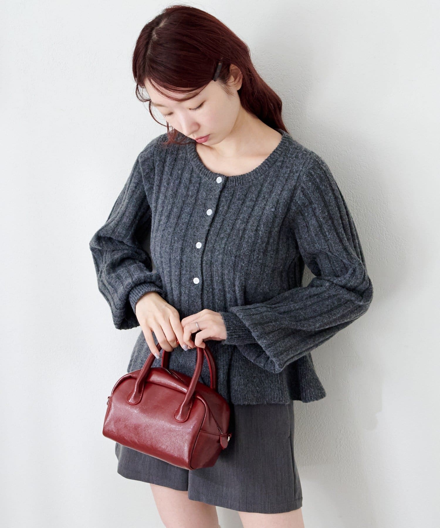 ウエスト部分にふんわり広がるペプラムシルエットが女性らしい印象を演出するリブニットカーディガン。
