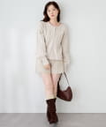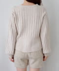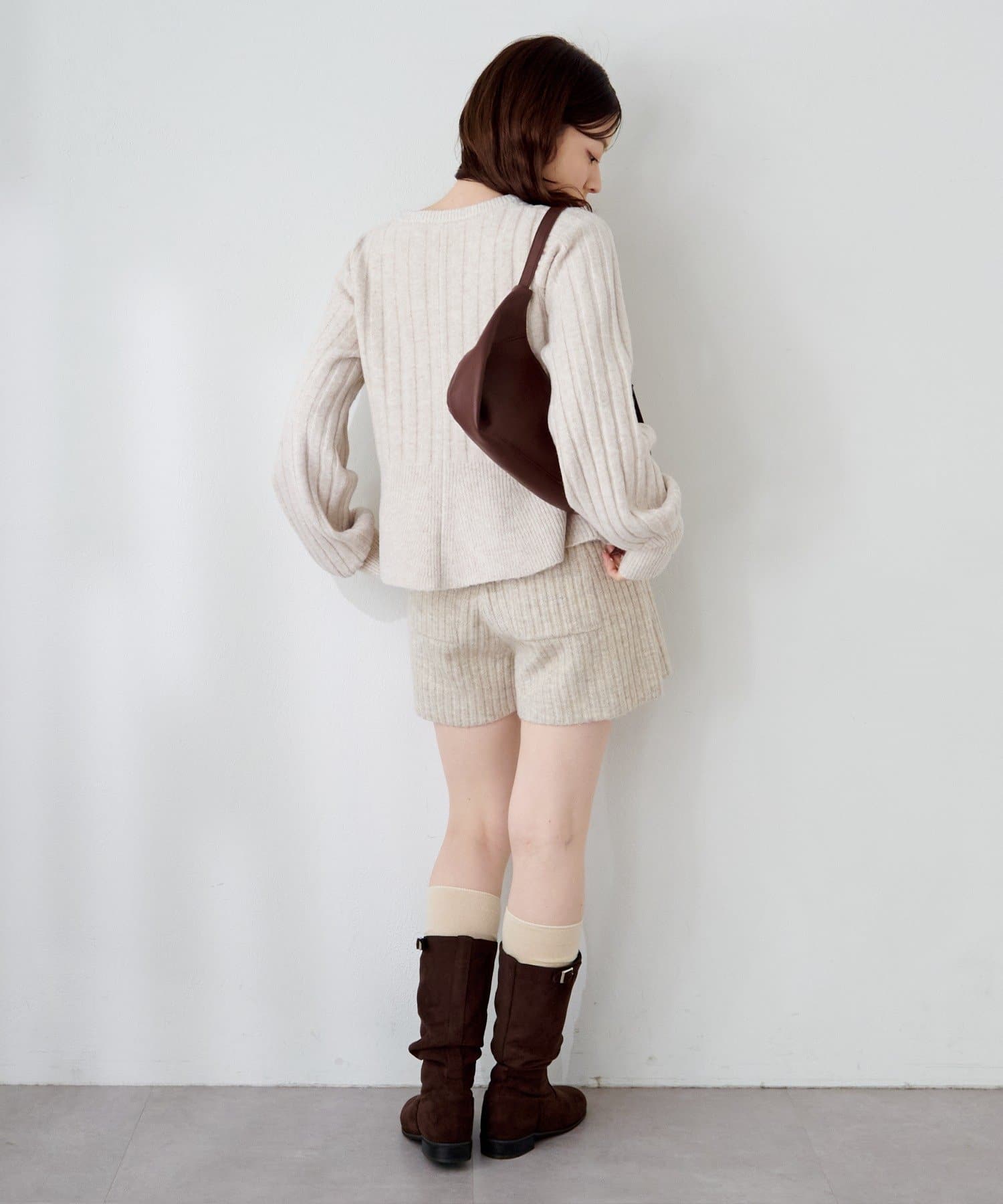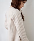 縦ラインを強調するリブ編みで、コンパクトに見えつつ体型を拾いにくいのが魅力。