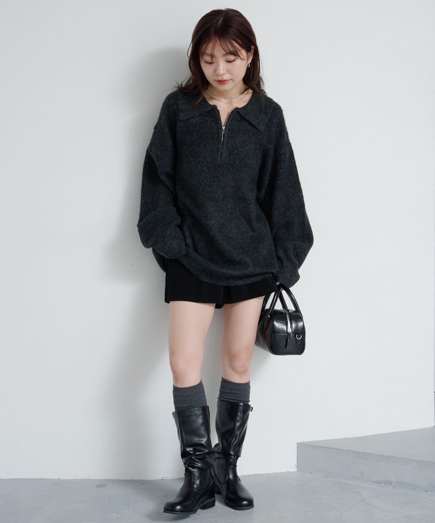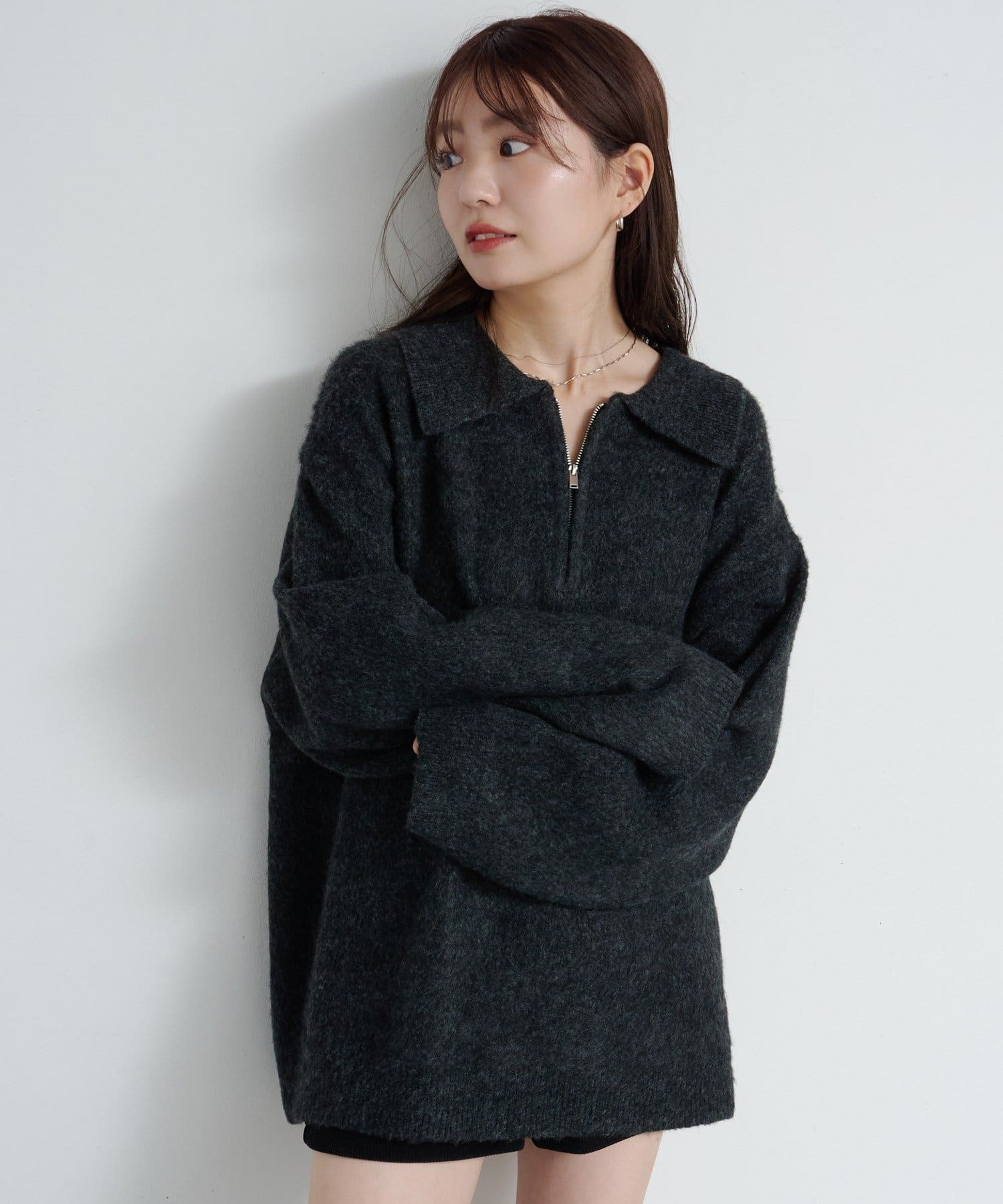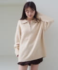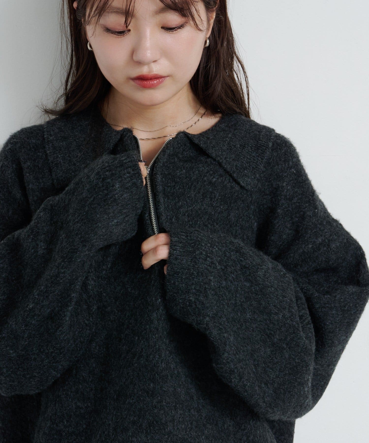 ハーフジップデザインで襟元の開き具合を調整でき、一枚での着用はもちろん、インナーとのレイヤードも楽しめます。