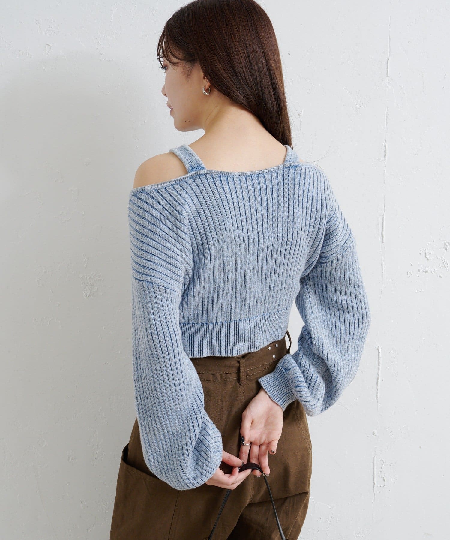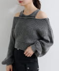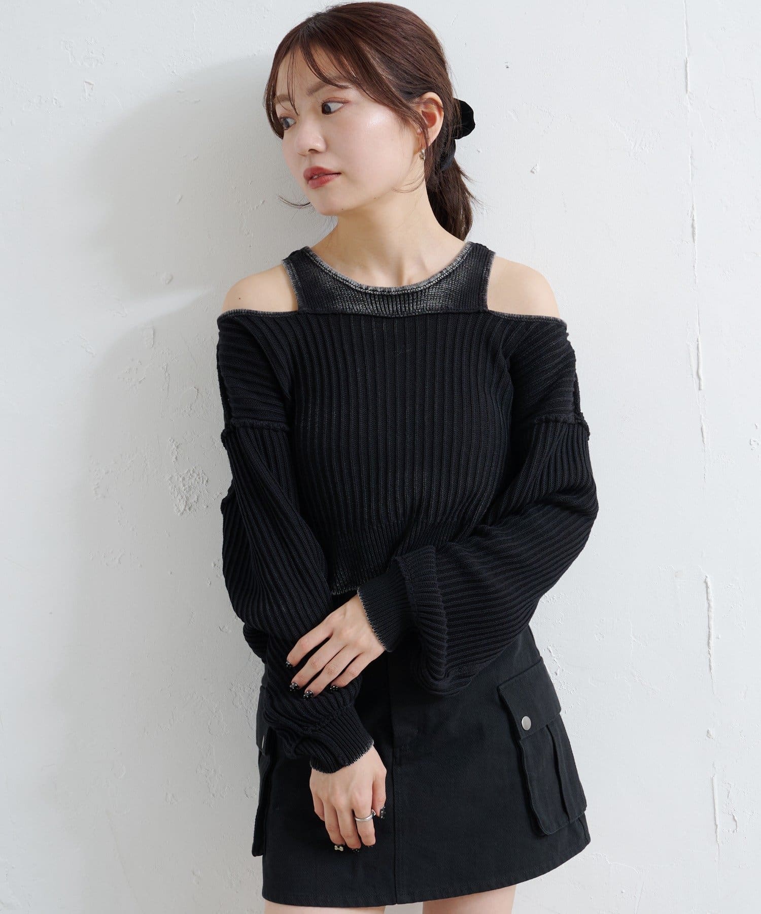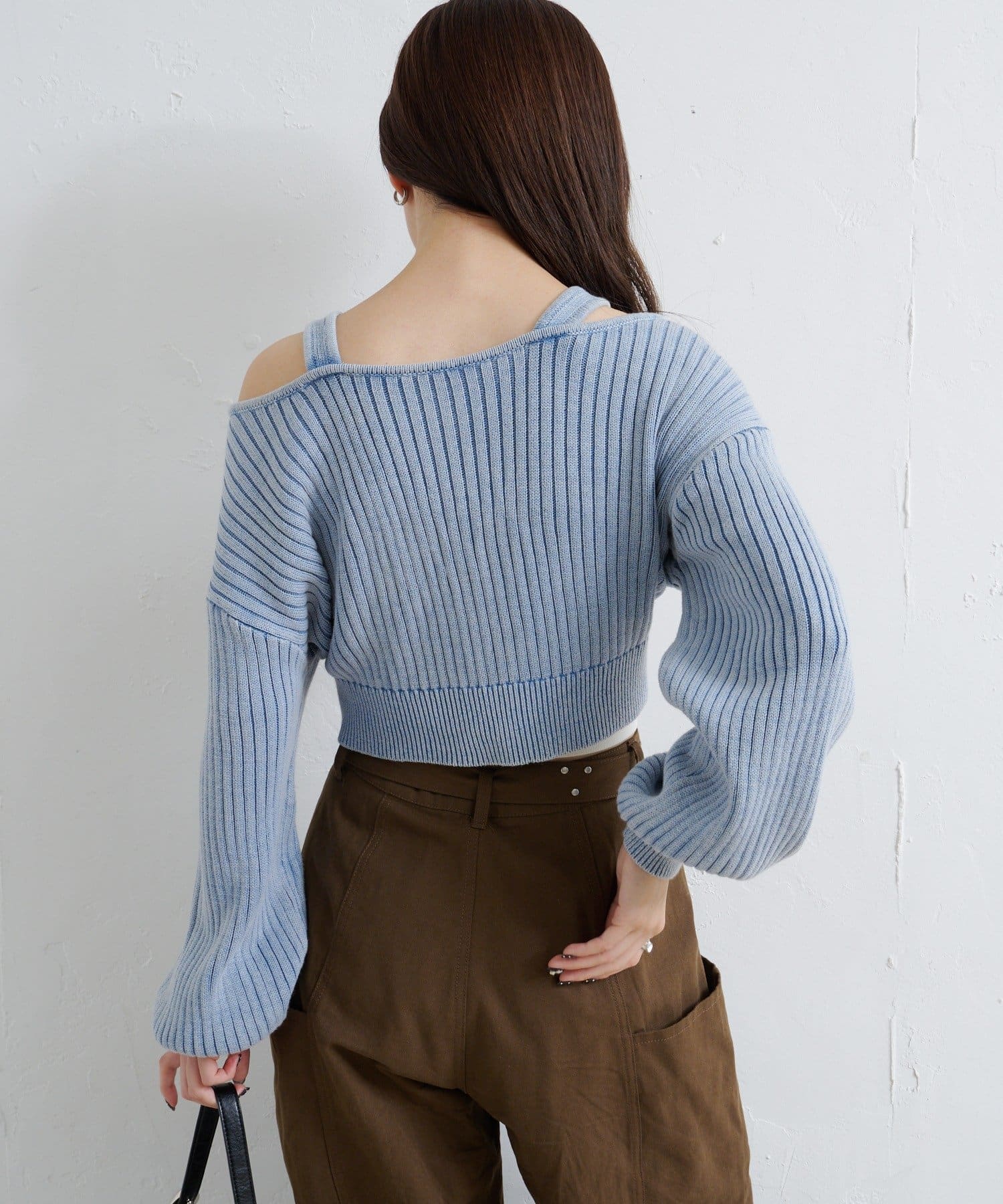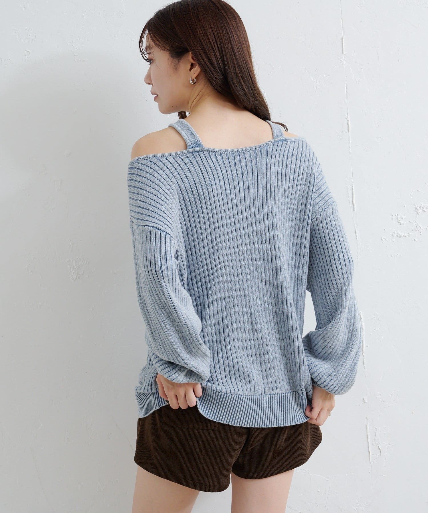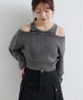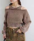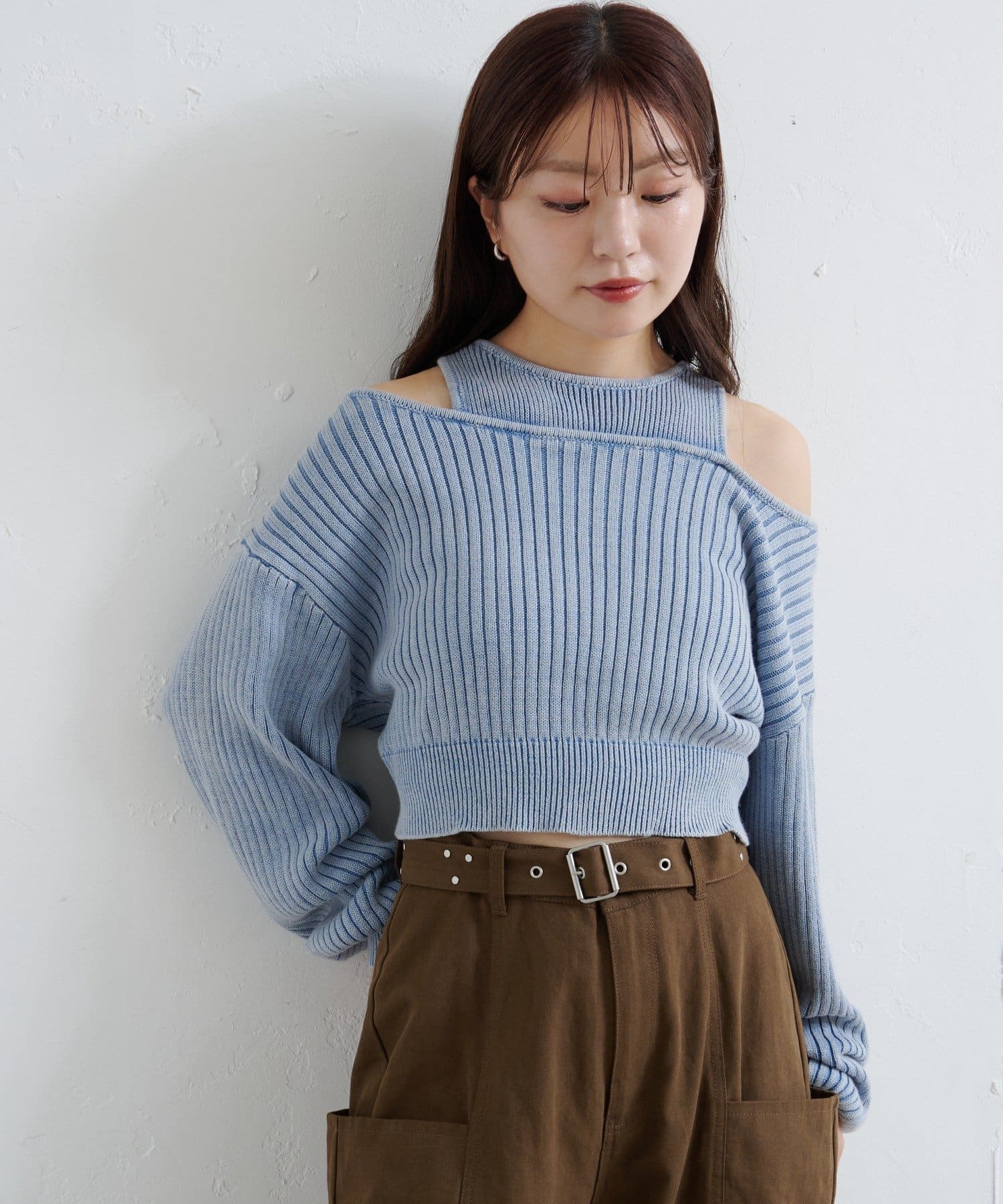 ショート丈とロング丈のオフショルニットとタンクトップがセットになったデザインで、リバーシブルでも着まわせる万能アイテム。