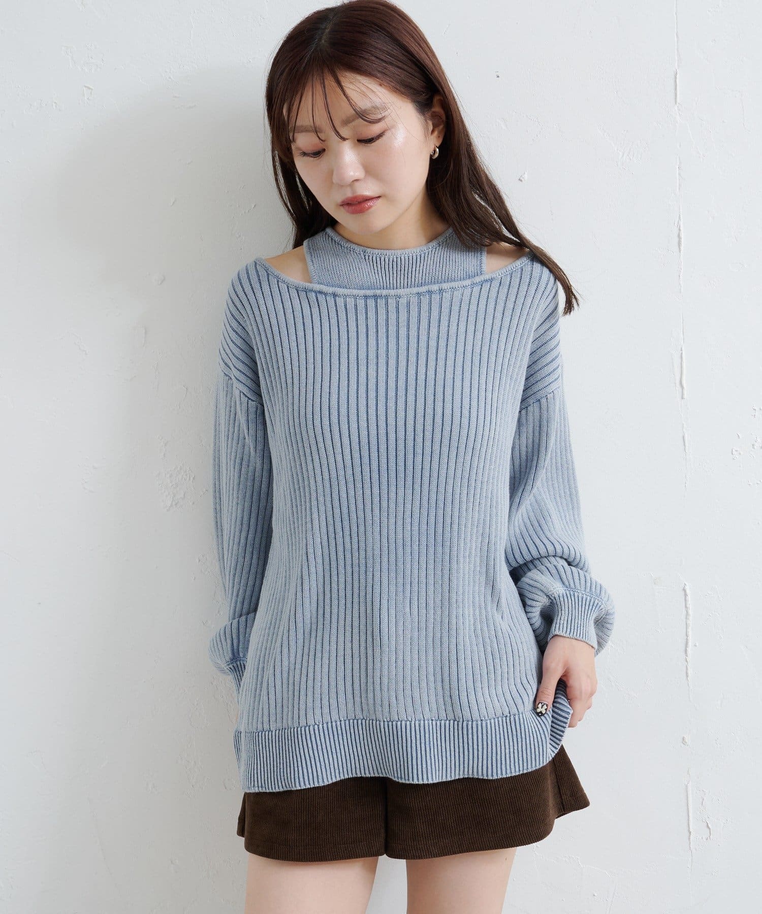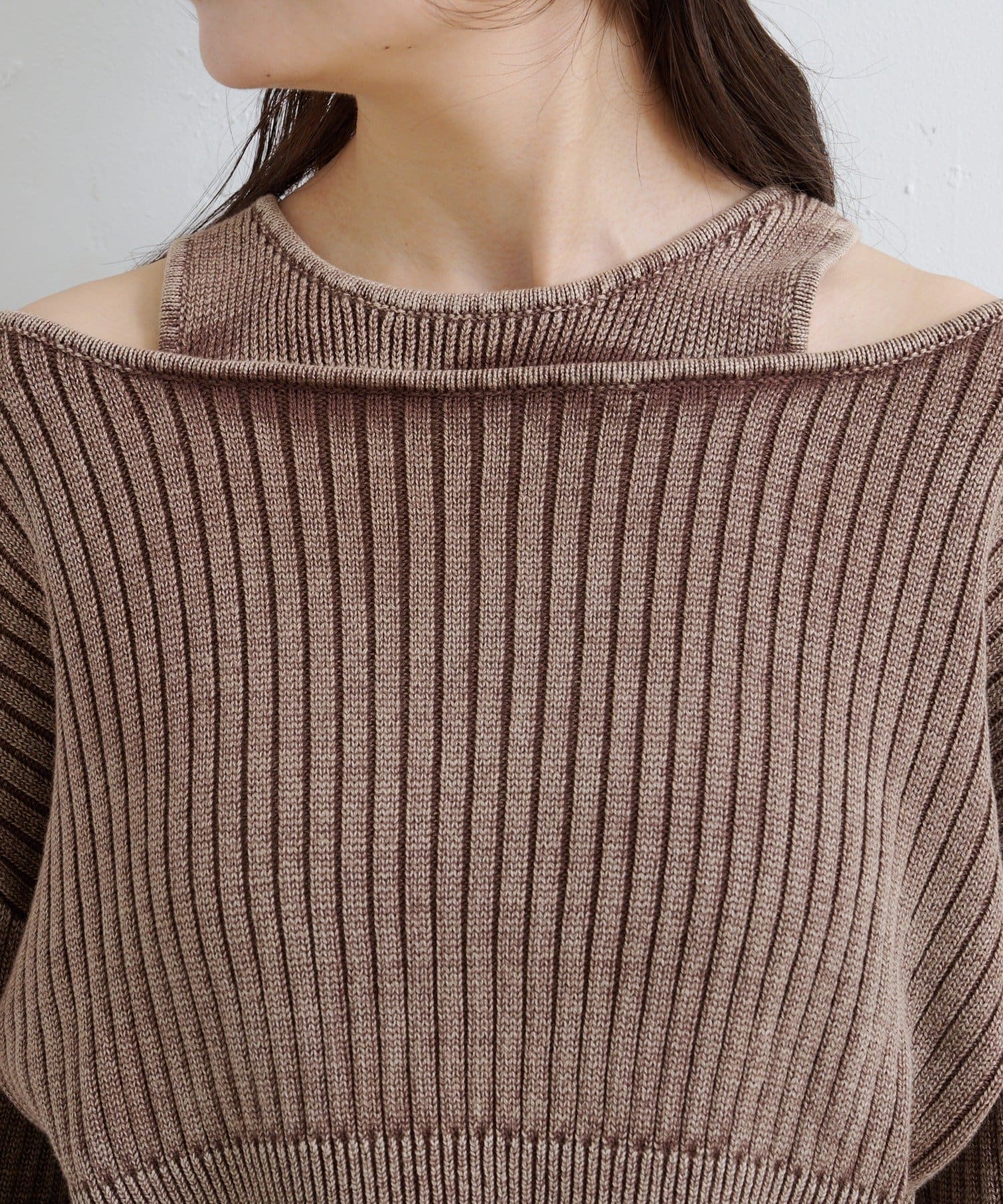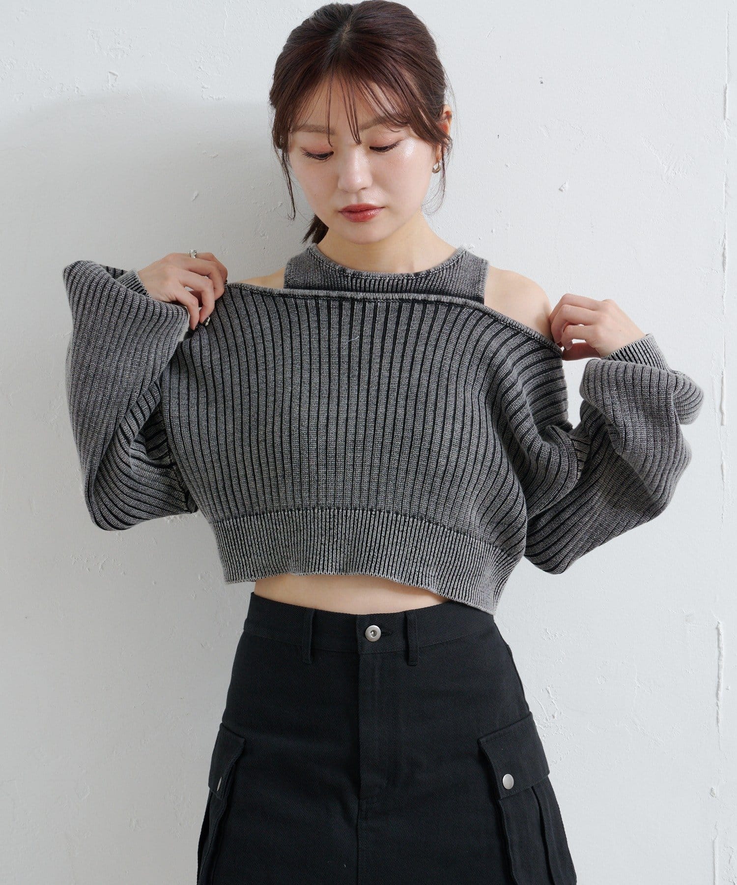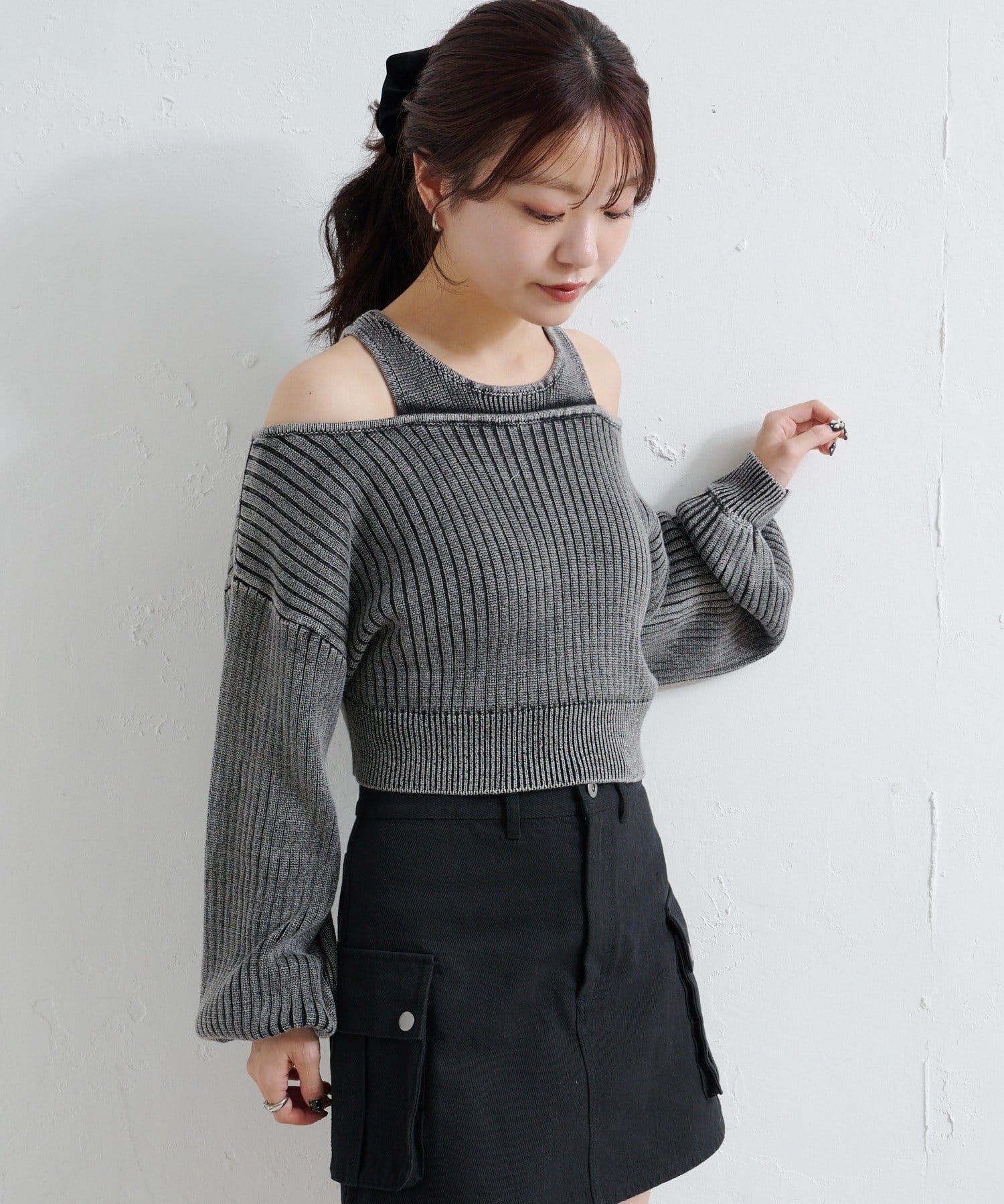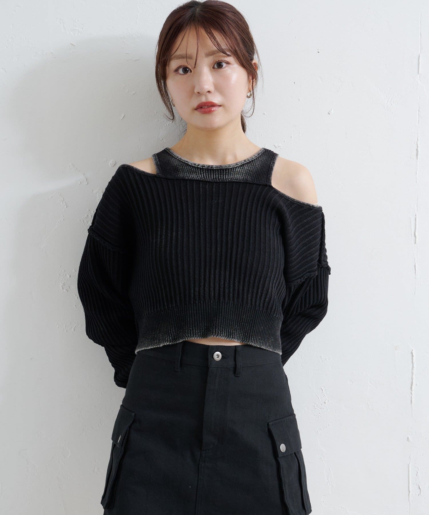 ショート丈とロング丈のオフショルニットとタンクトップがセットになったデザインで、リバーシブルでも着まわせる万能アイテム。