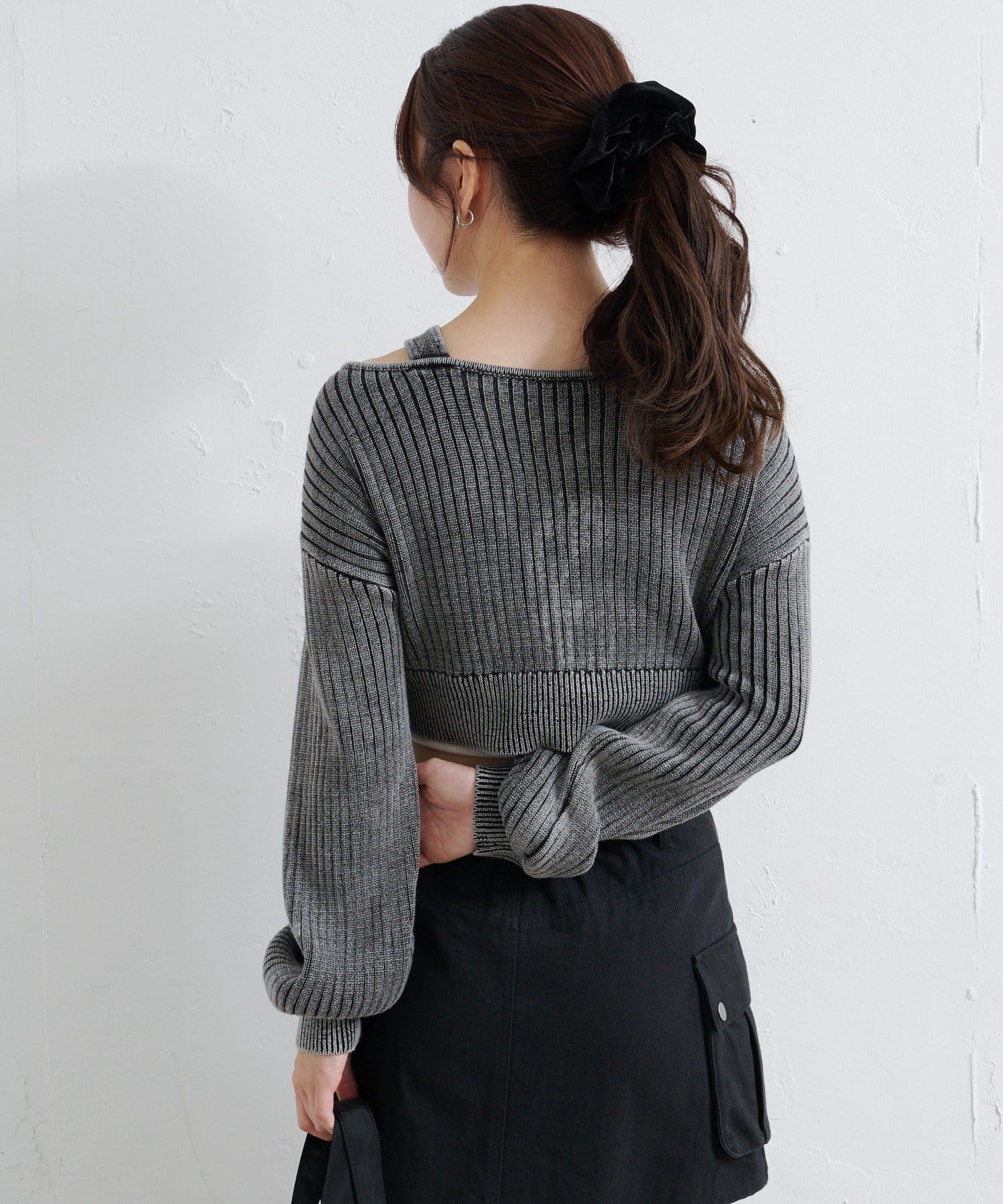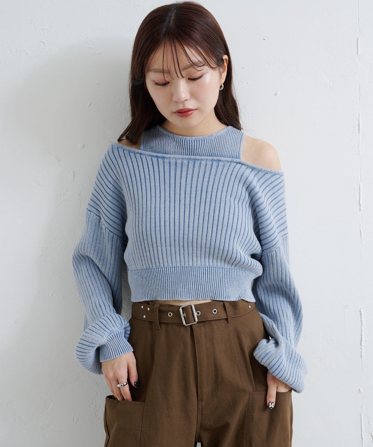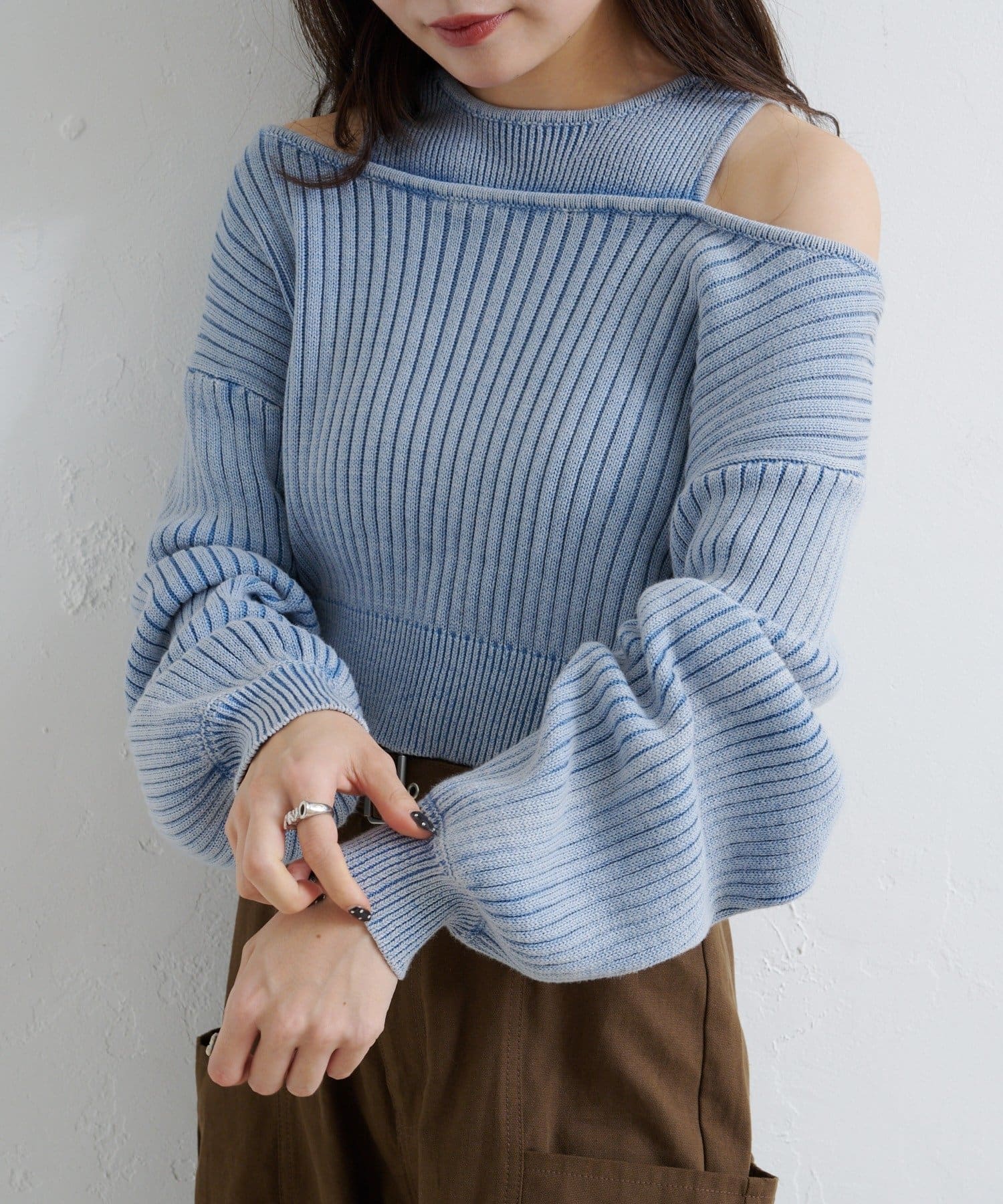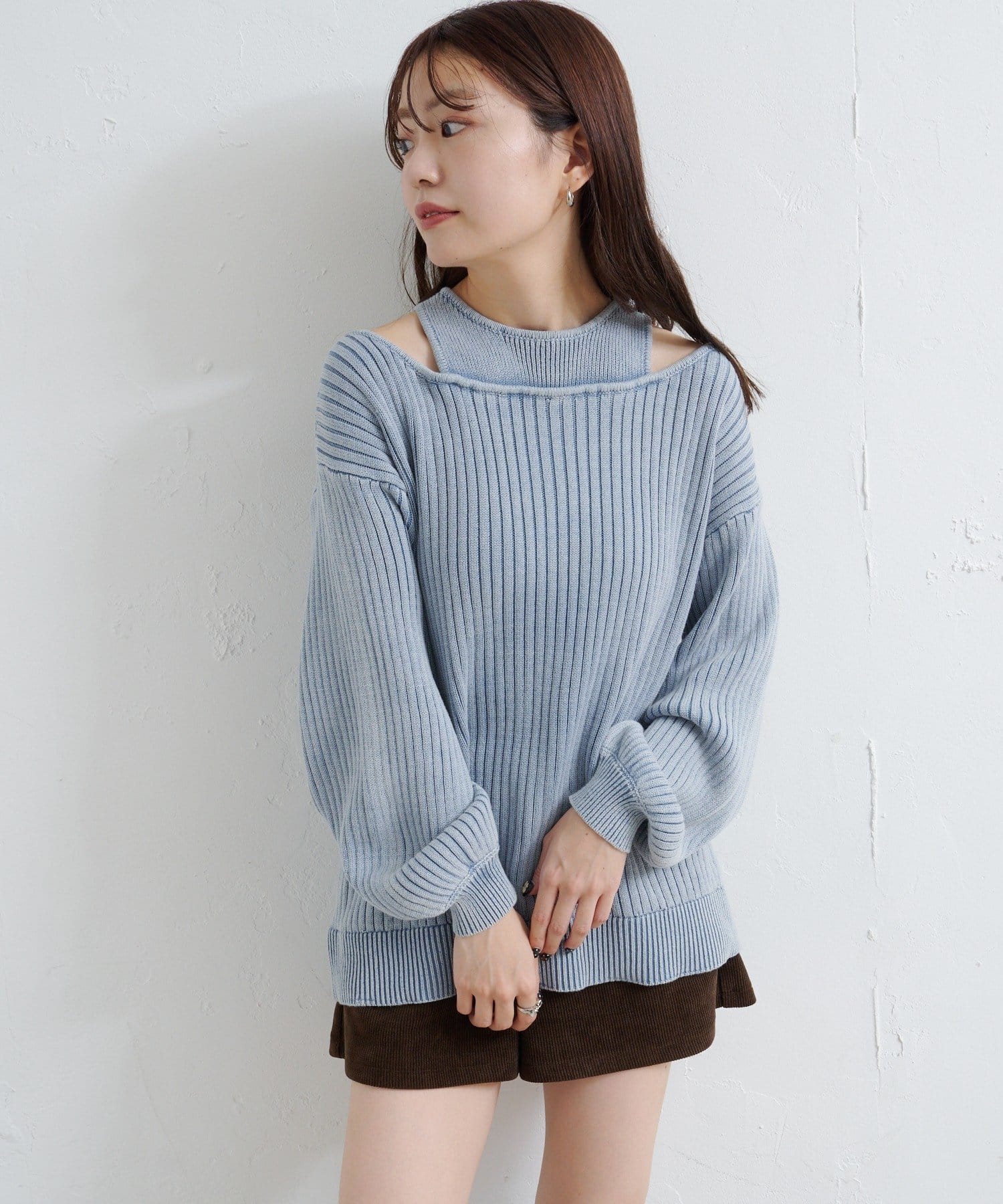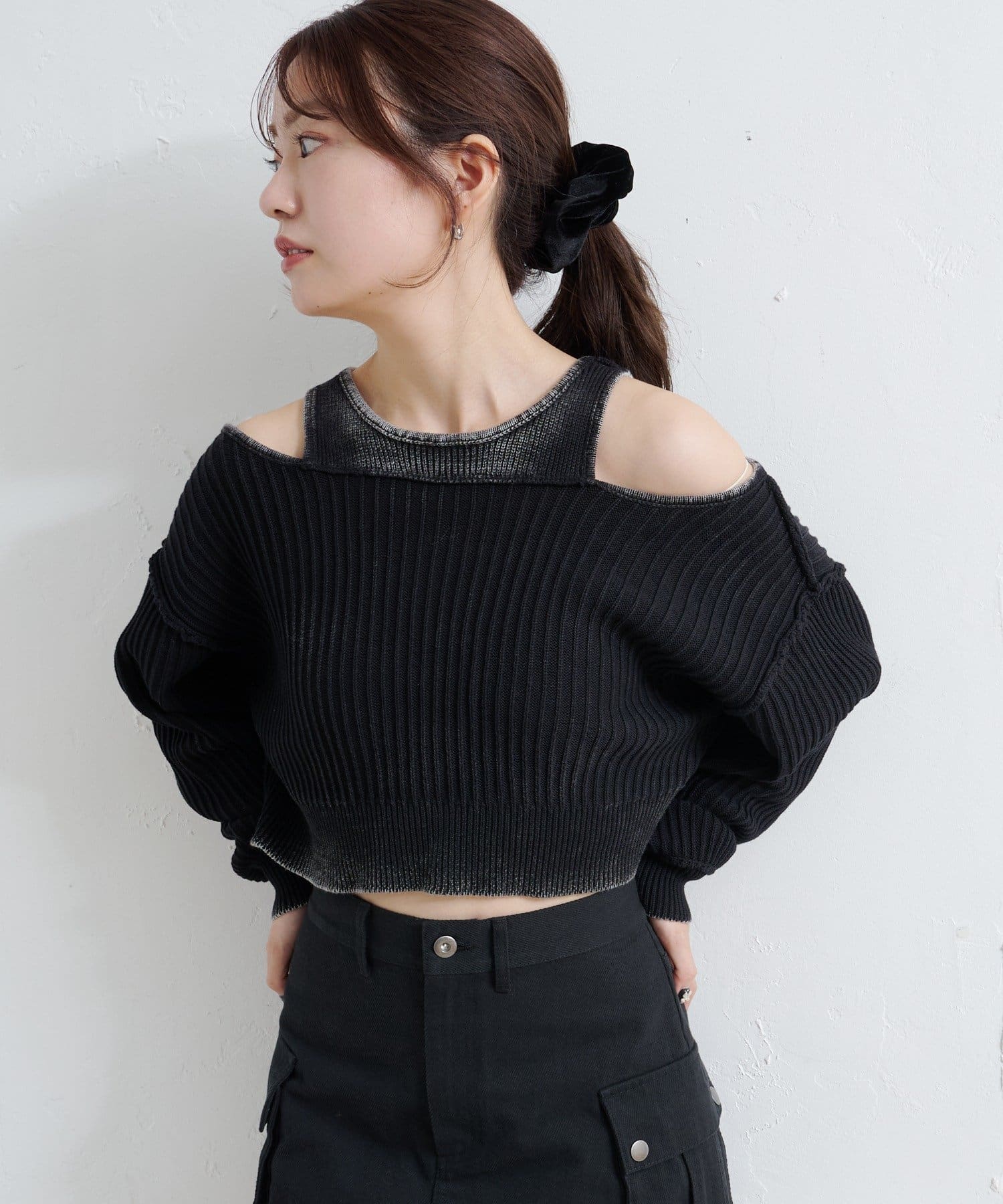 ショート丈とロング丈のオフショルニットとタンクトップがセットになったデザインで、リバーシブルでも着まわせる万能アイテム。