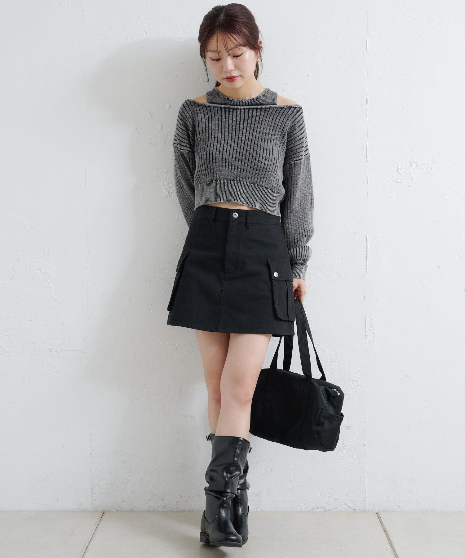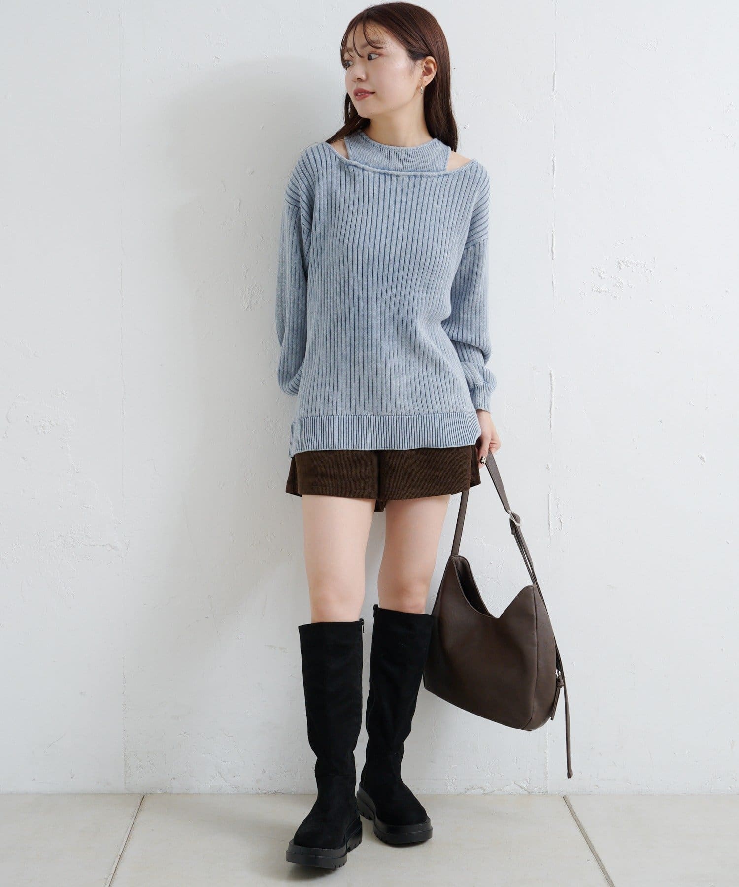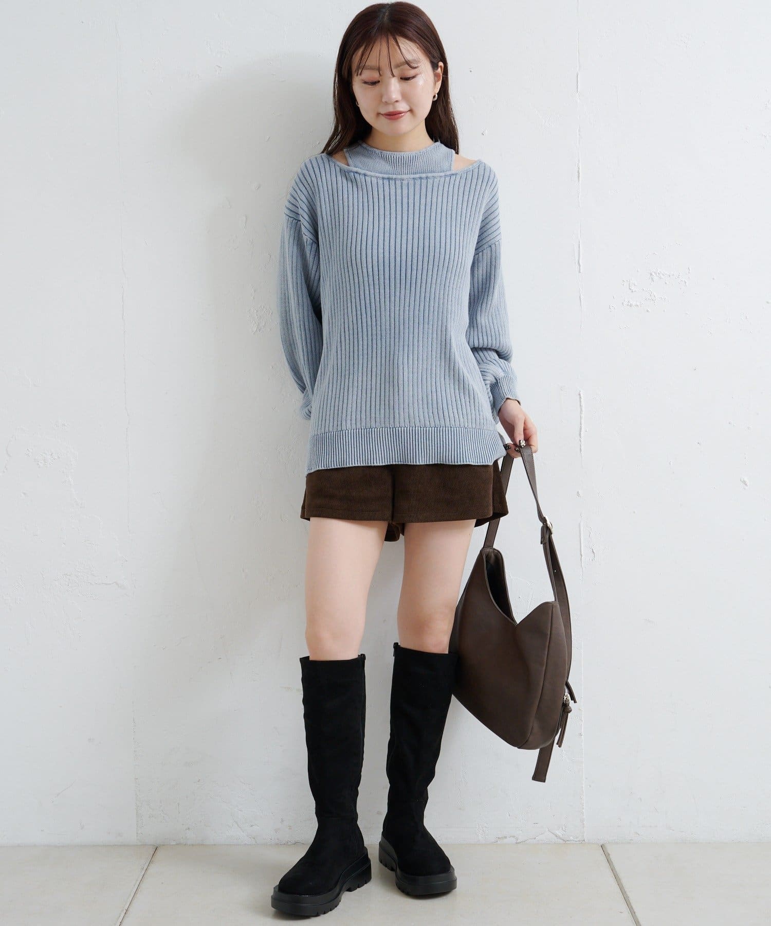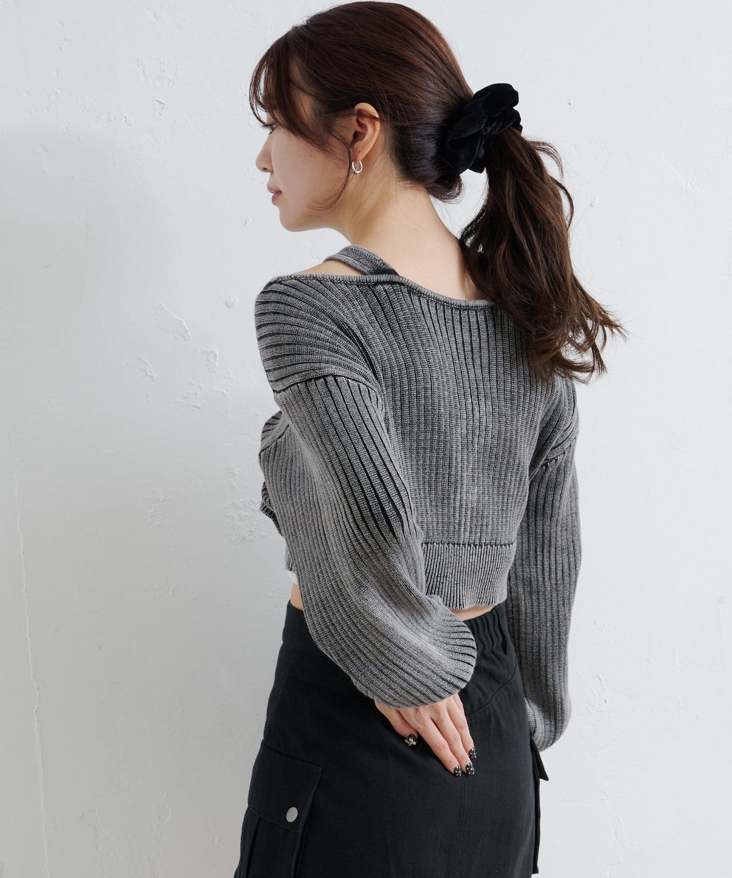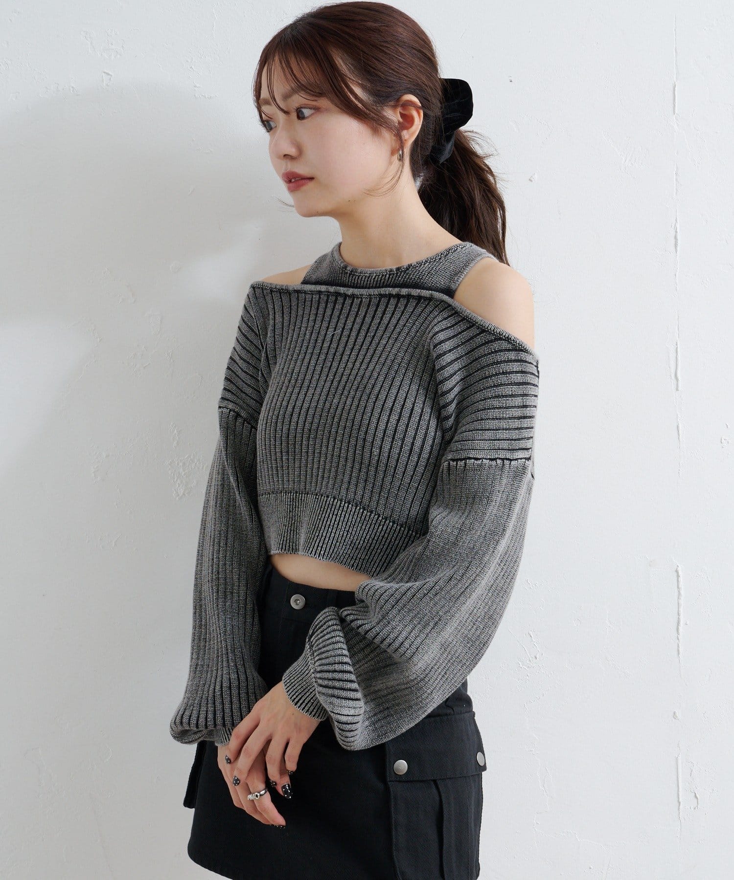 ショート丈とロング丈のオフショルニットとタンクトップがセットになったデザインで、リバーシブルでも着まわせる万能アイテム。