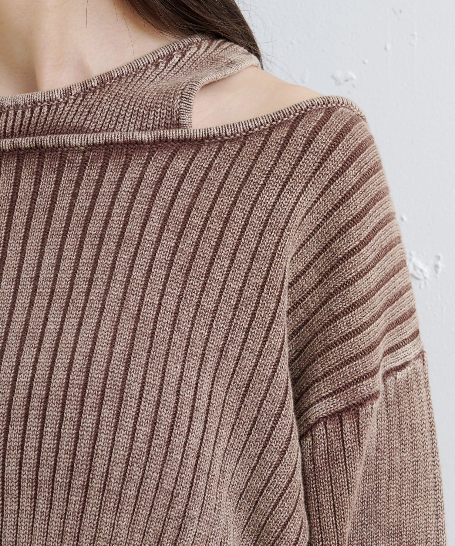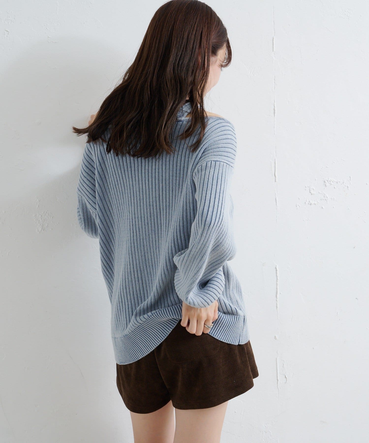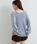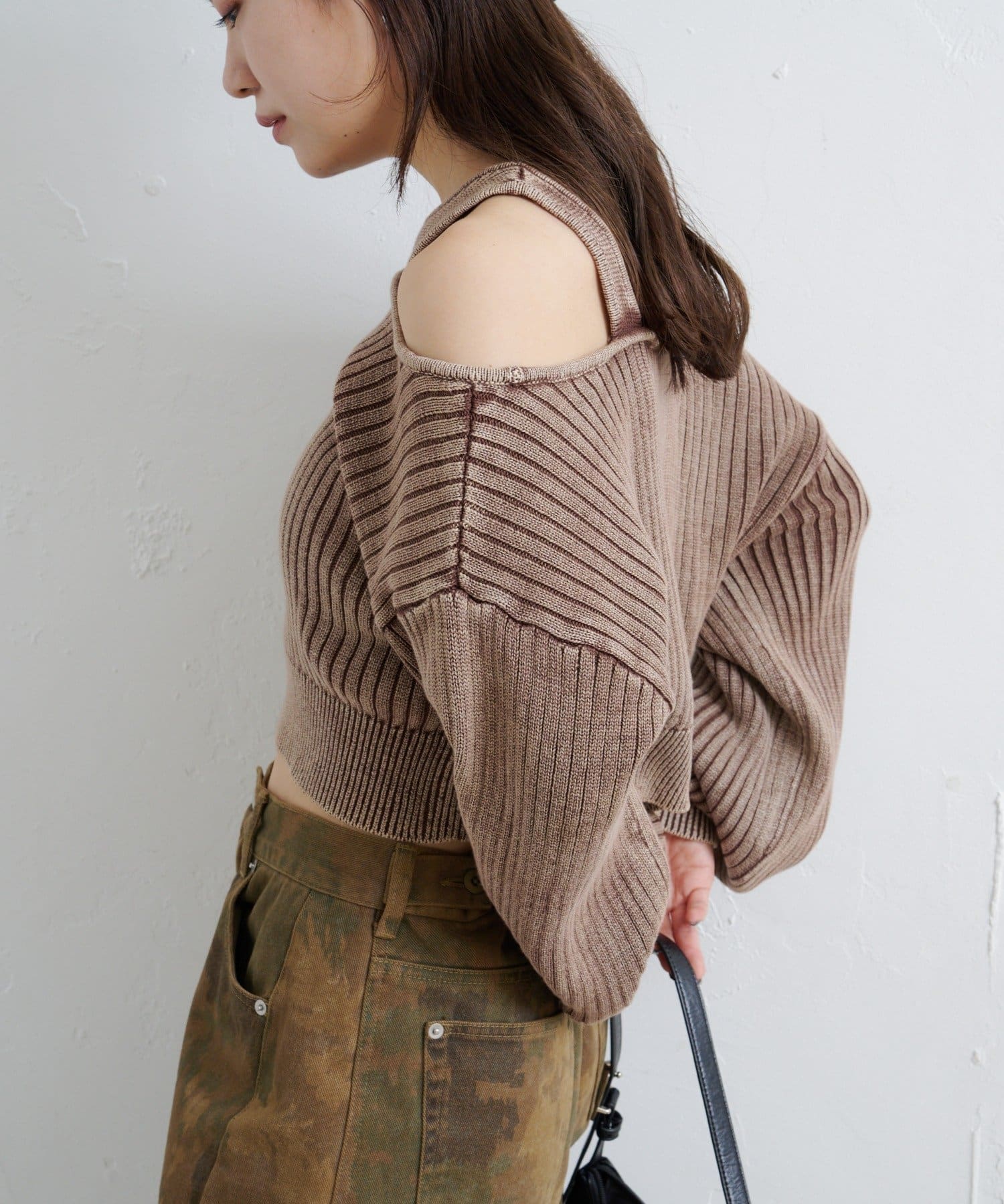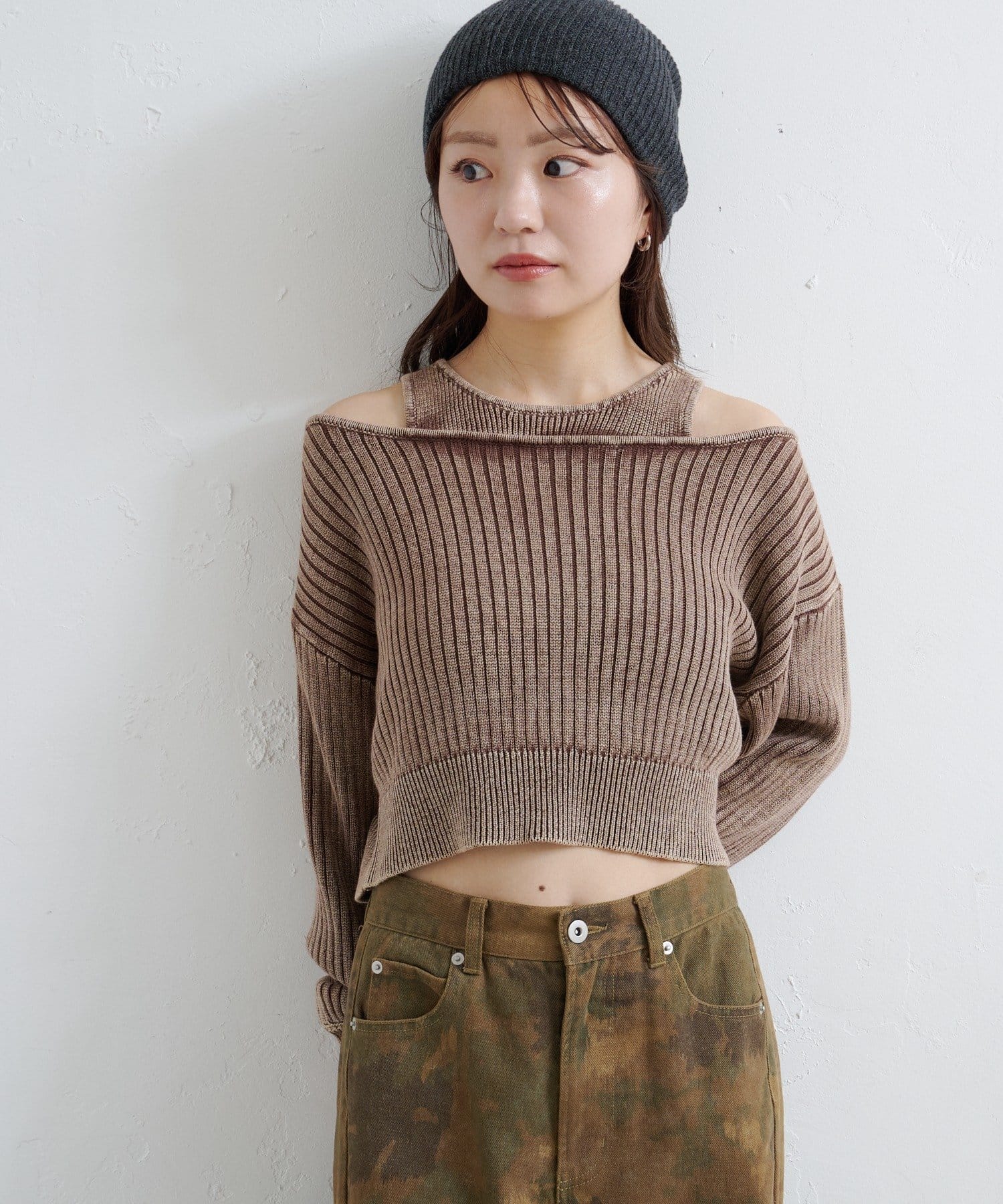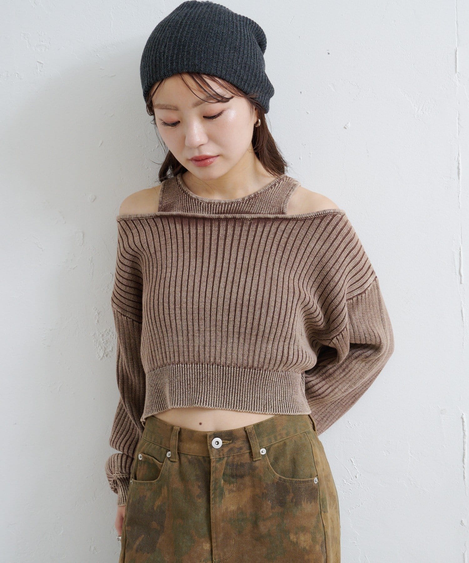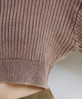 ヴィンテージライクなピグメント加工が目を惹くオフショルタンクニット。