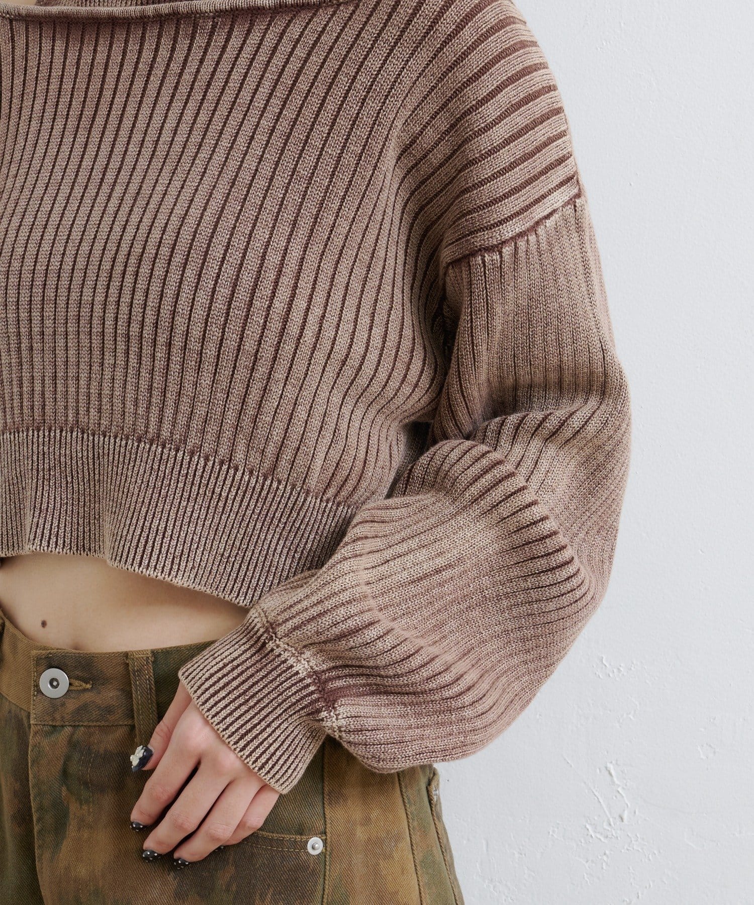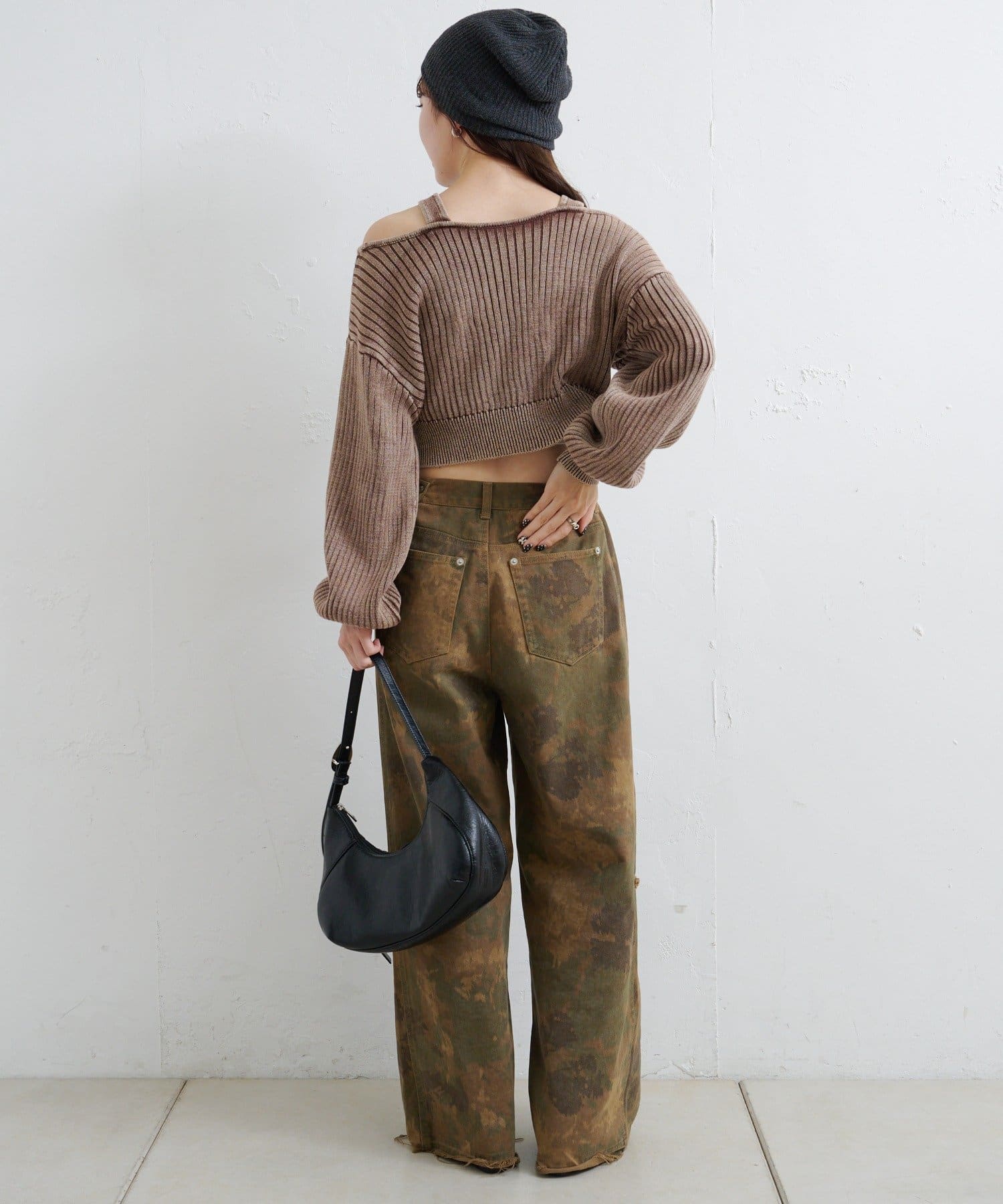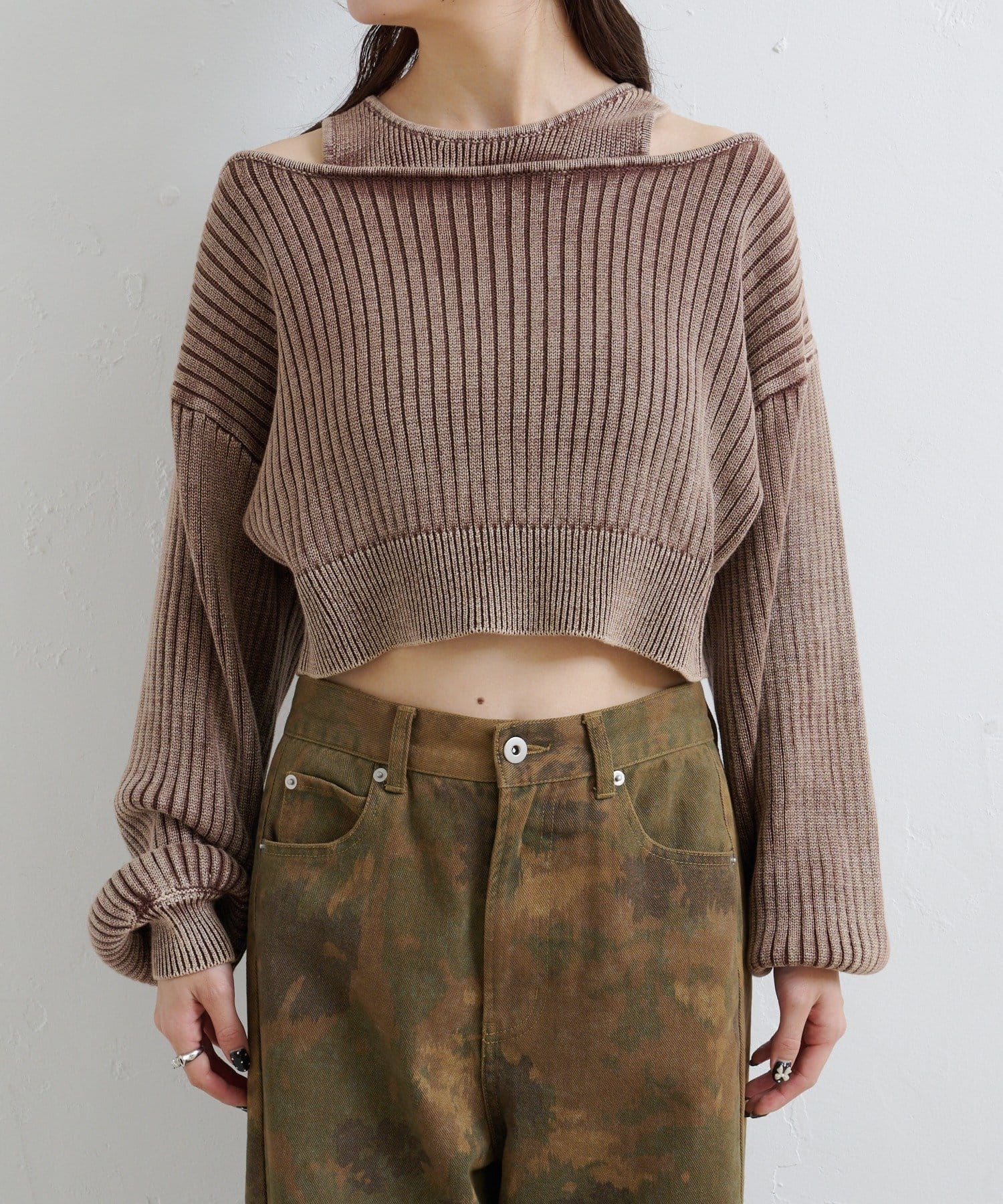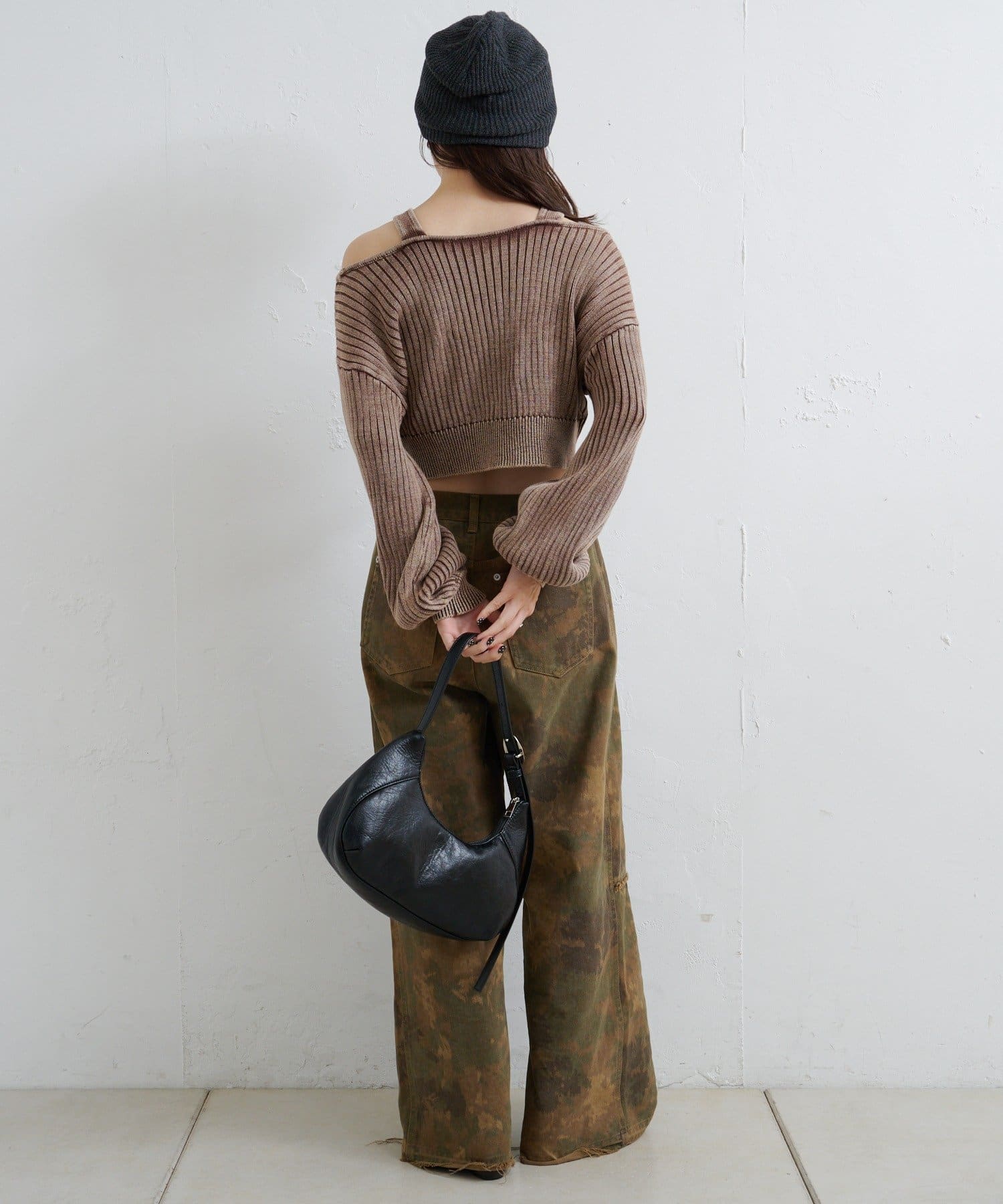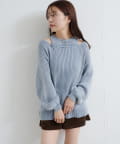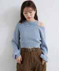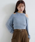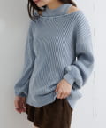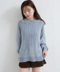 ヴィンテージライクなピグメント加工が目を惹くオフショルタンクニット。