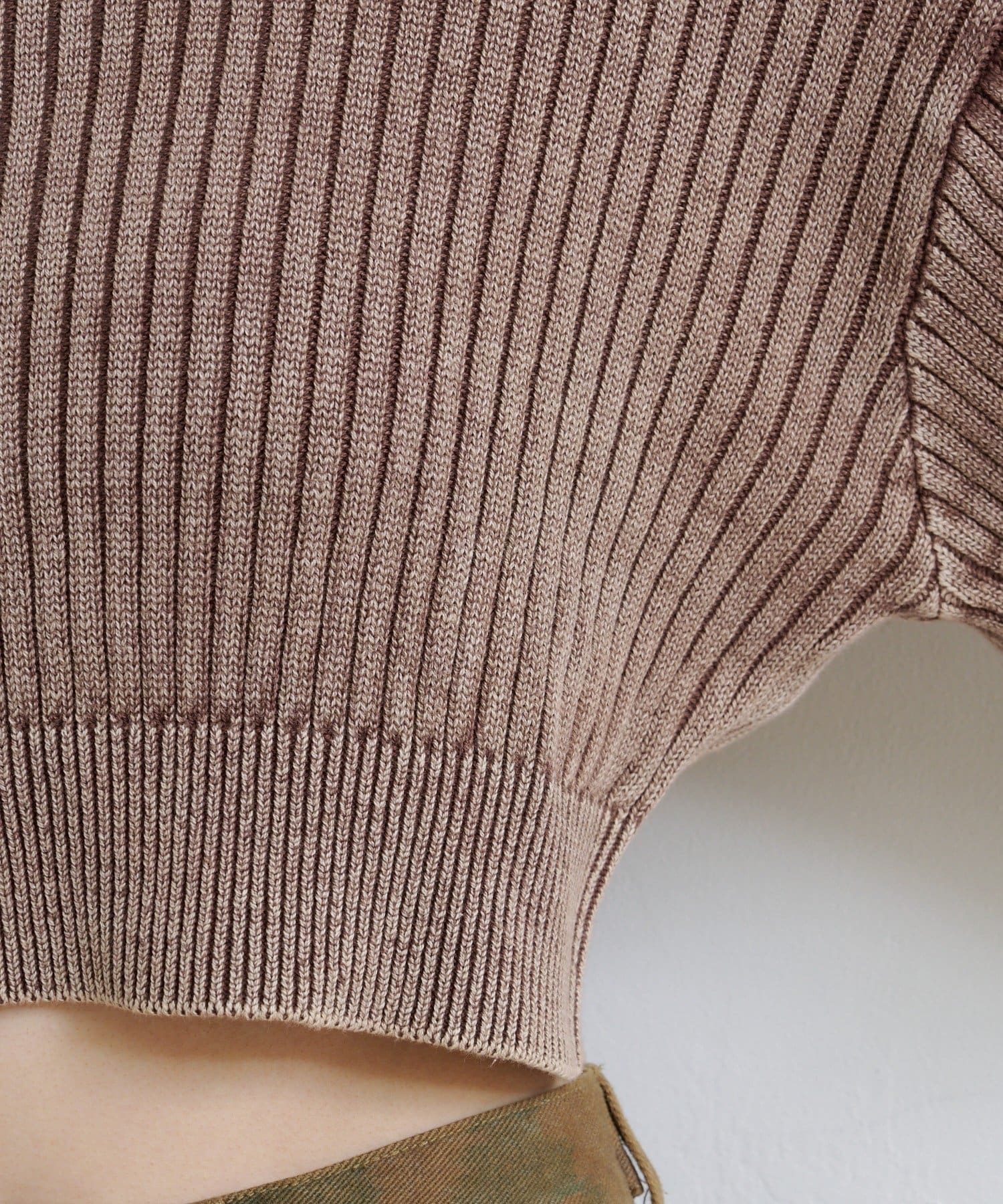 しっかりとしたリブ編みで伸縮性があり、ほどよい厚みのあるニット素材。