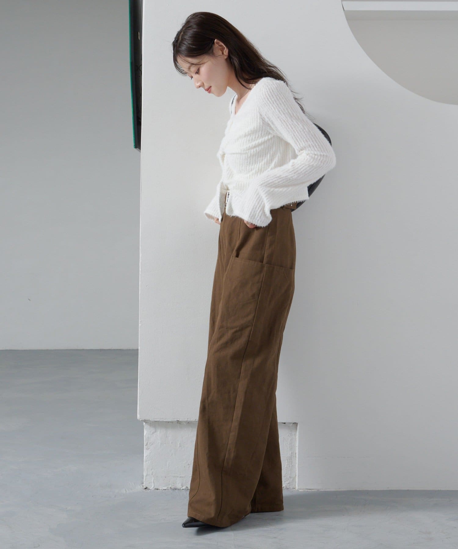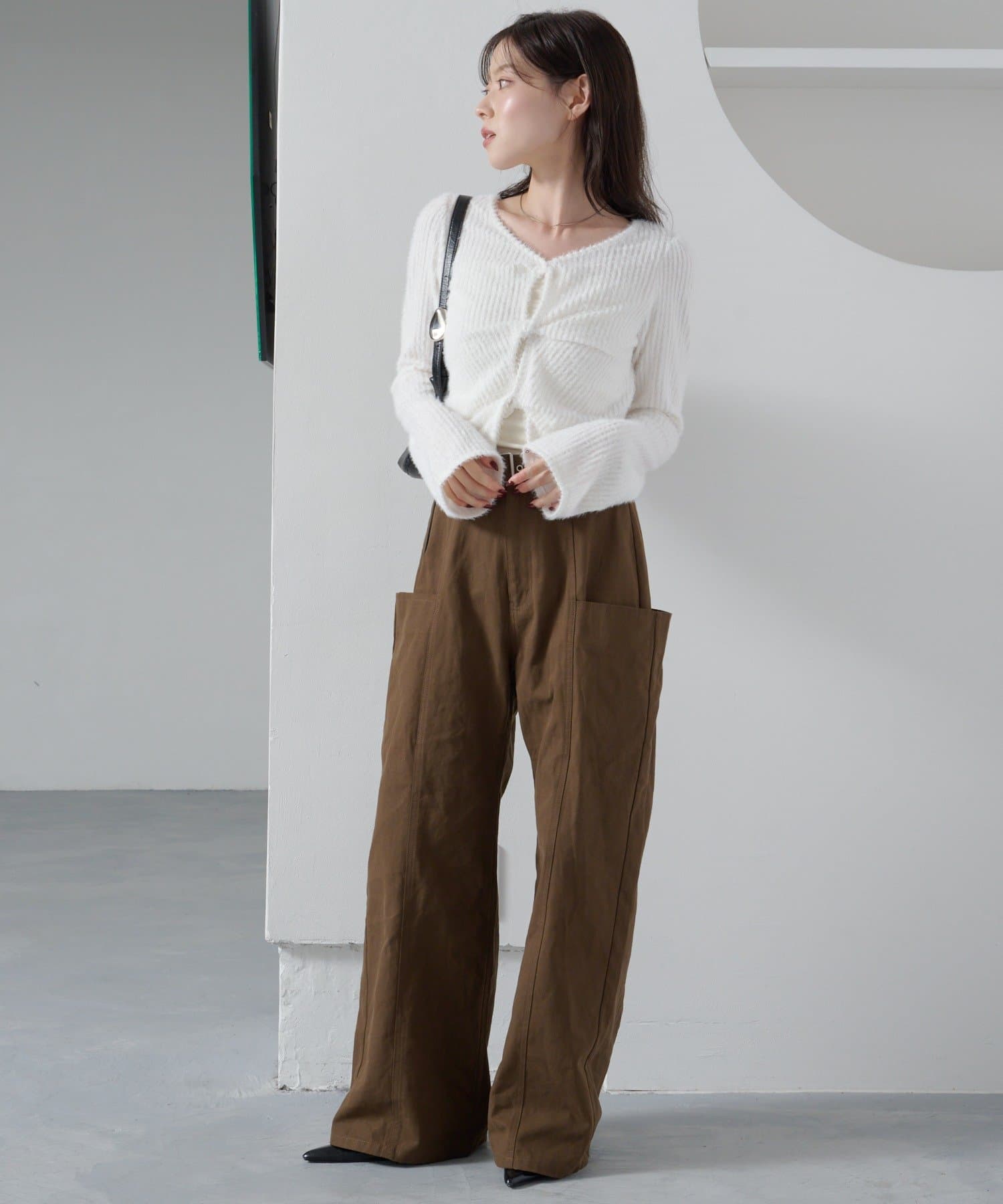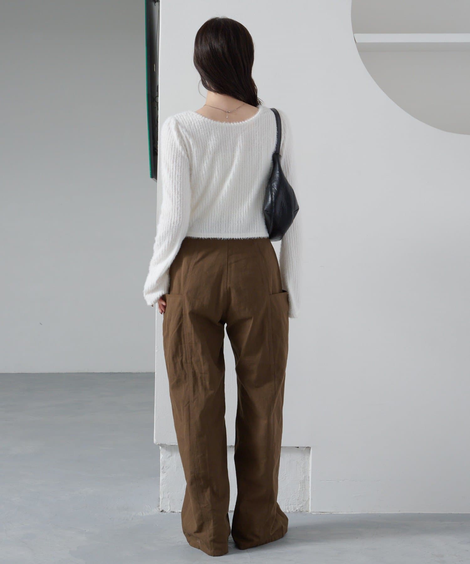 ハイウエストパンツと合わせてすっきり見えスタイルに。
