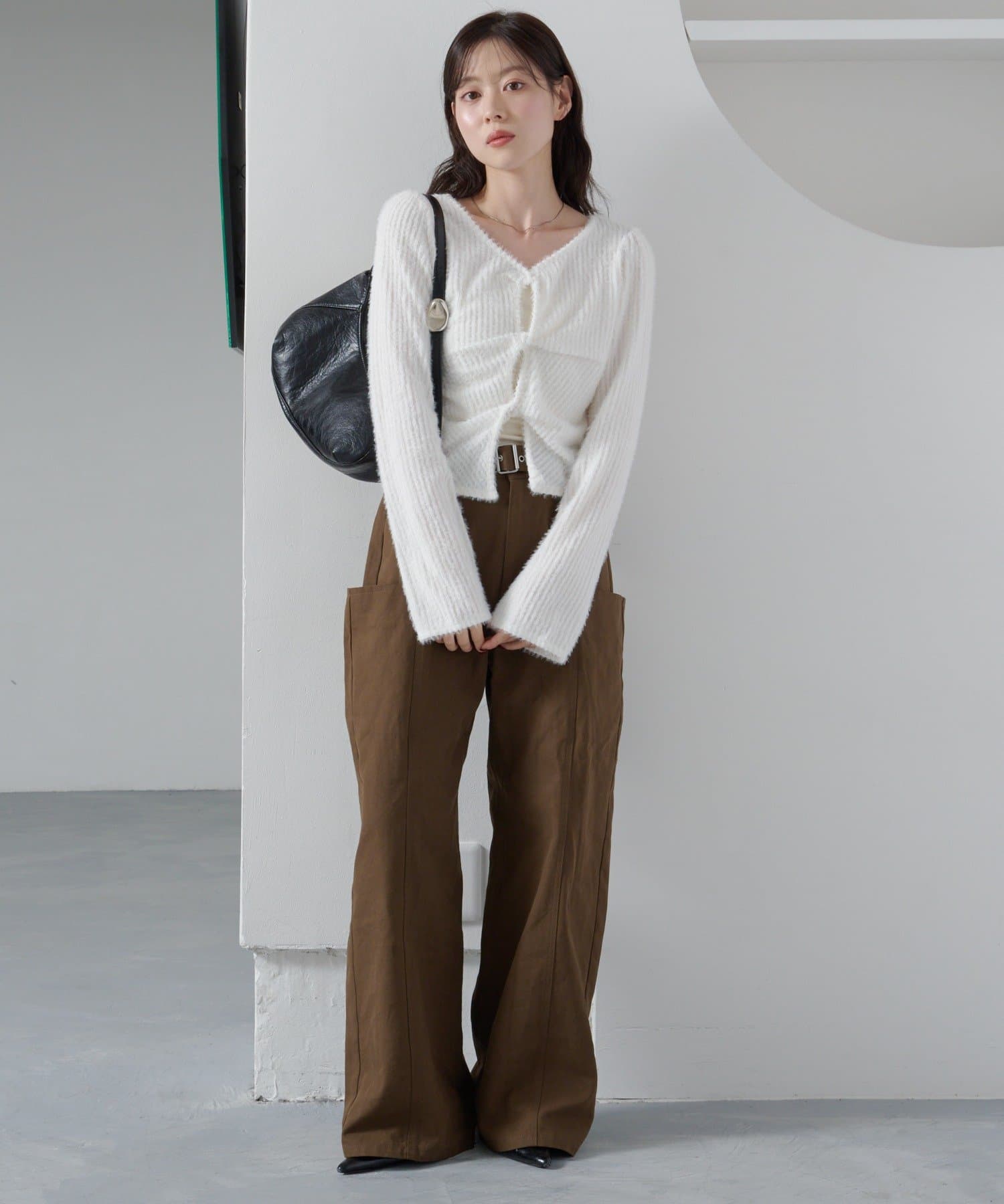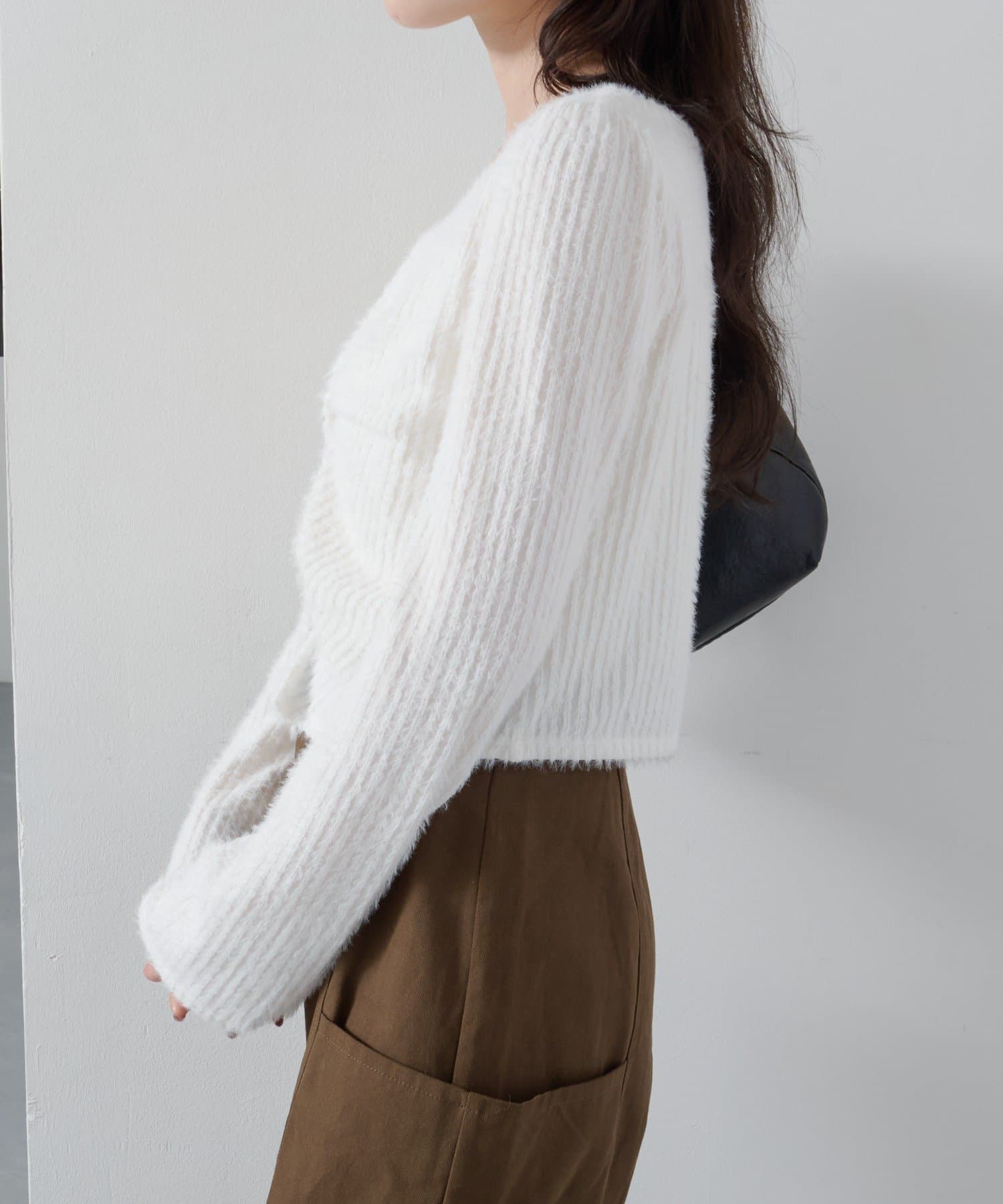 ふんわりとしたシャギー素材が季節感を高めるツイストデザインプルオーバー。