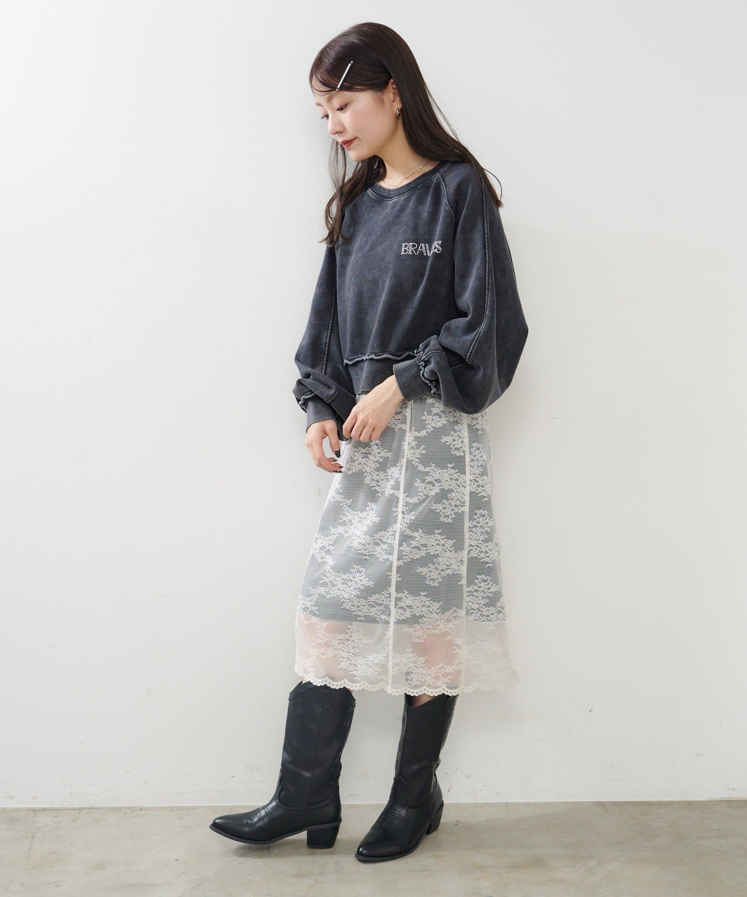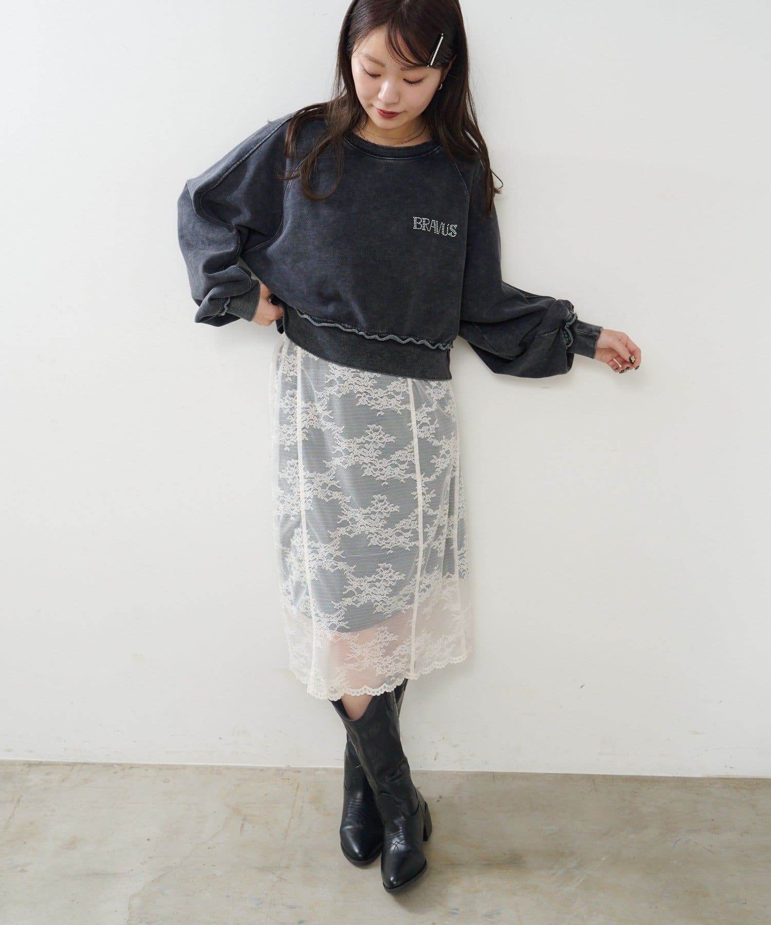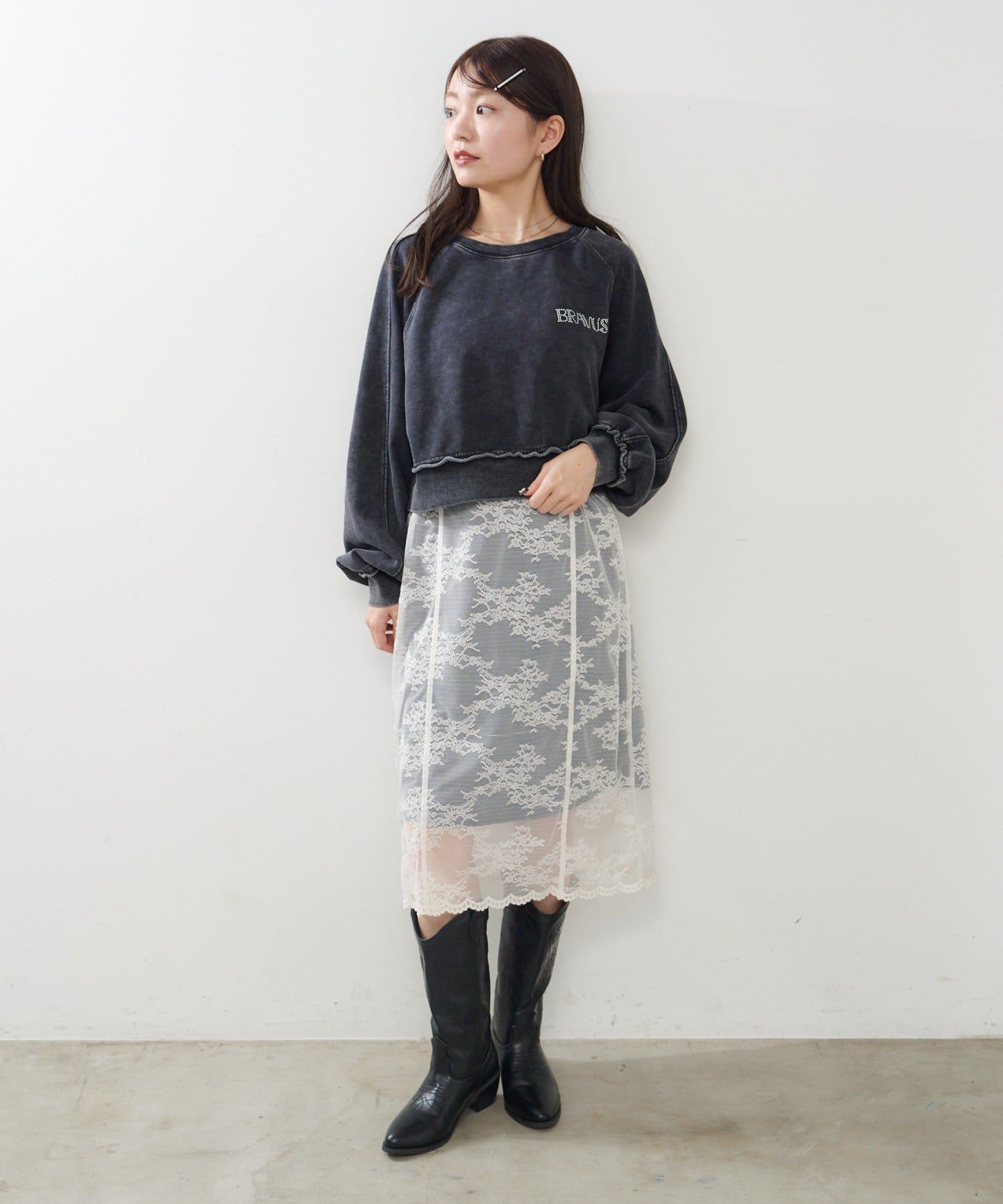 こなれ感と女性らしさを両立するラインストーンスウェット