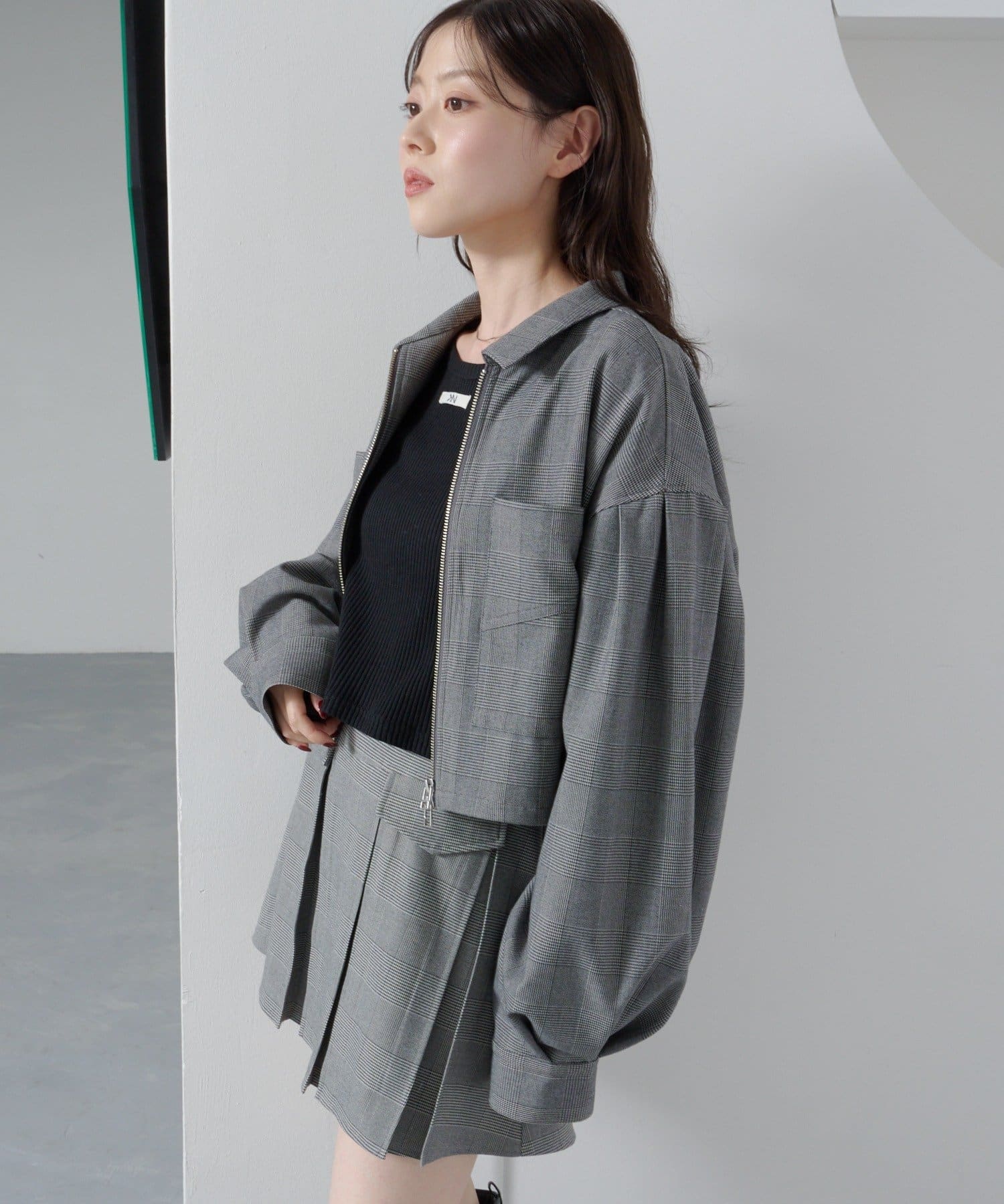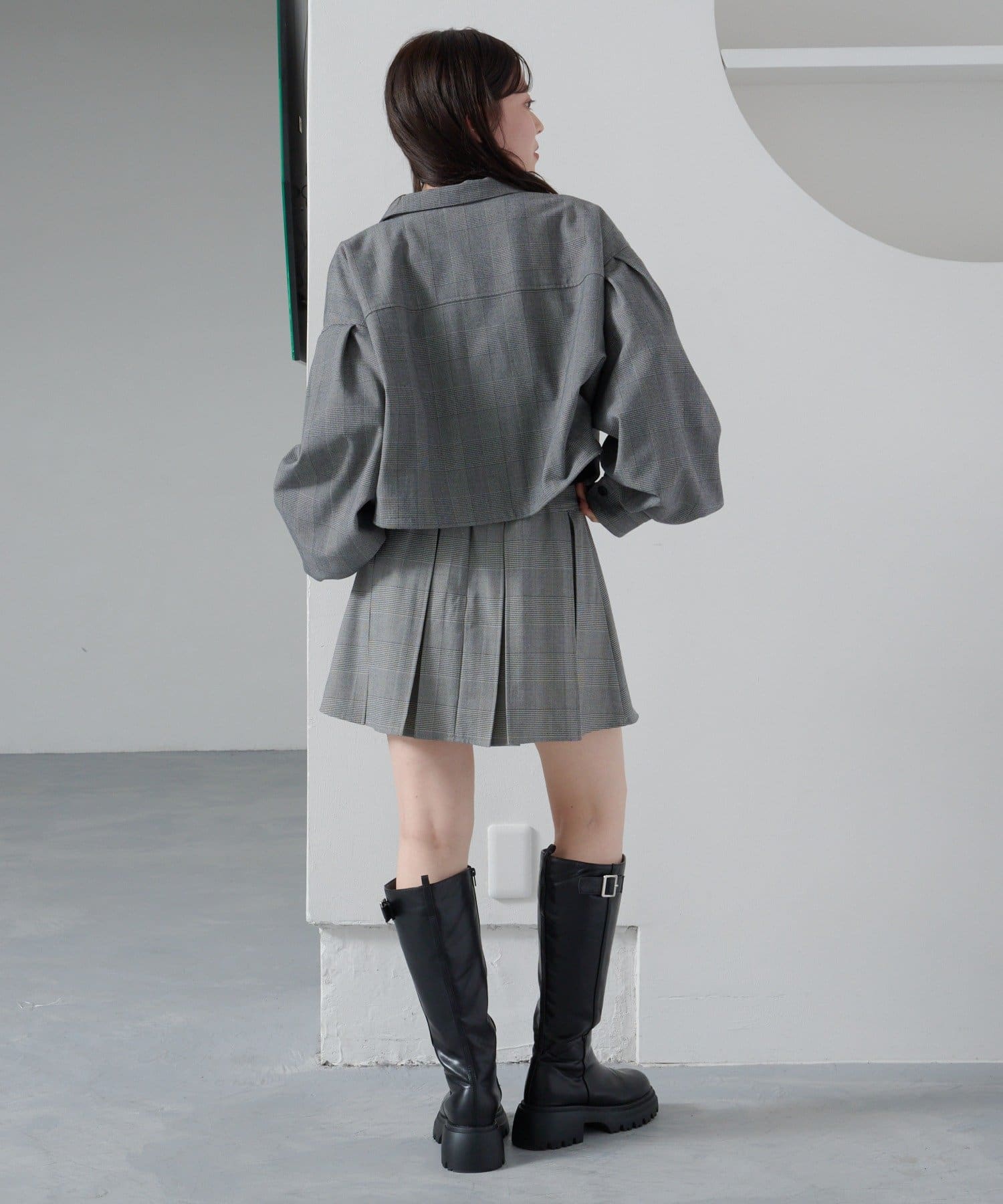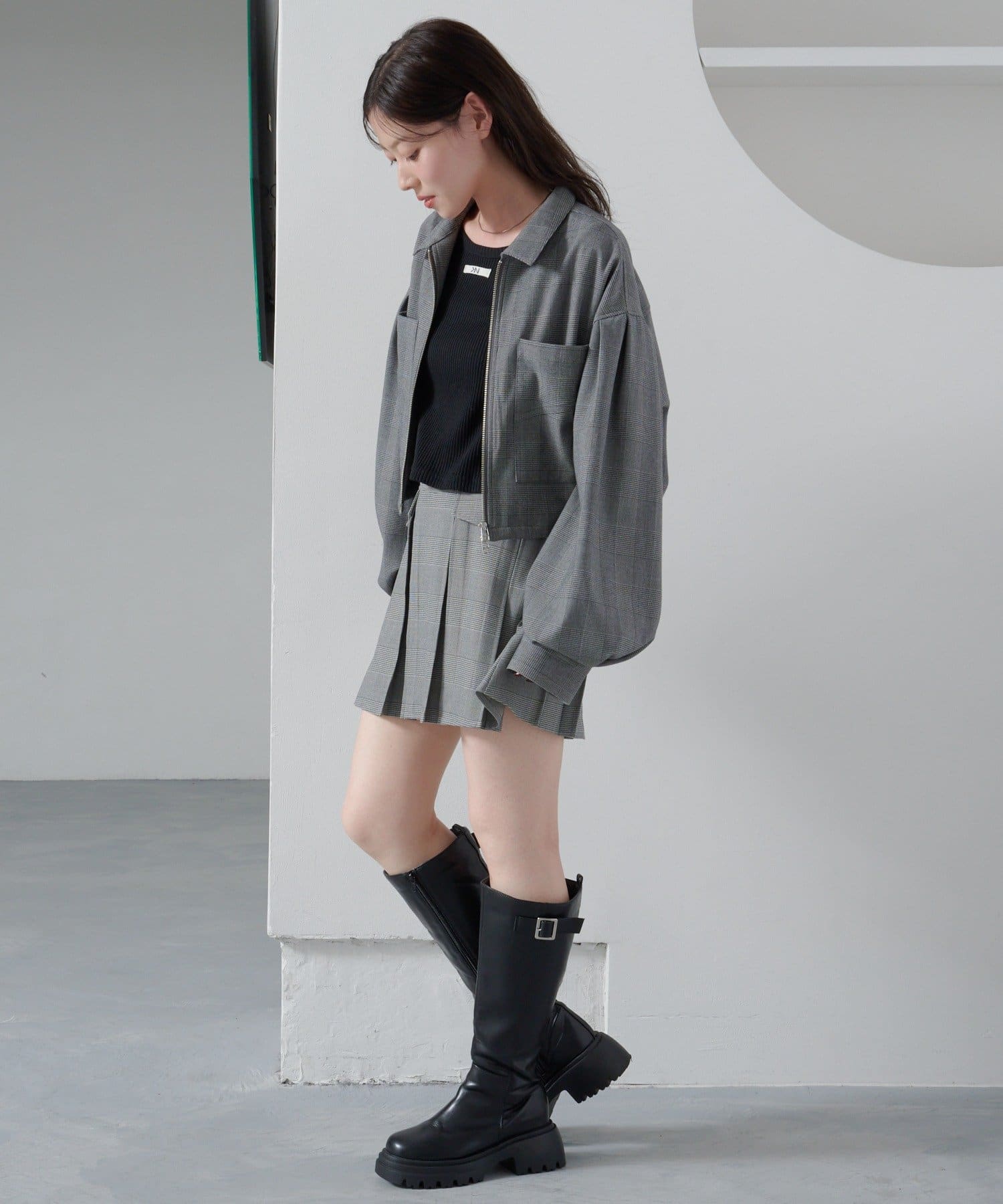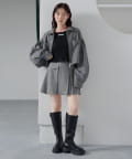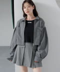 セットアップのミニスカート合わせでトレンドの着こなしに。