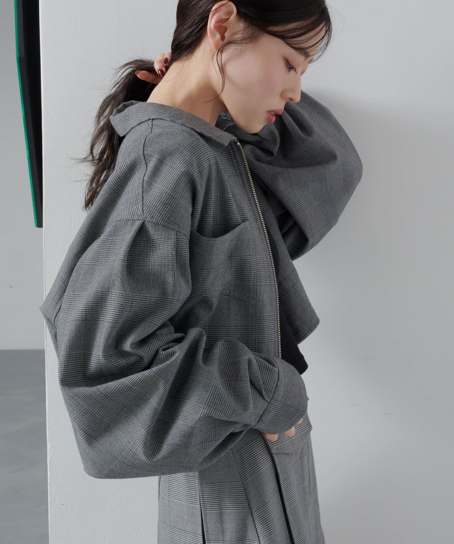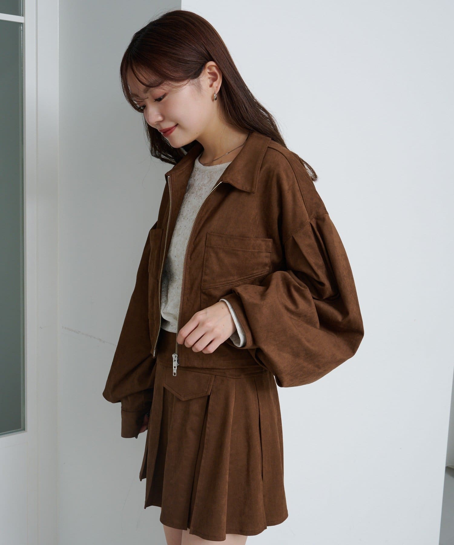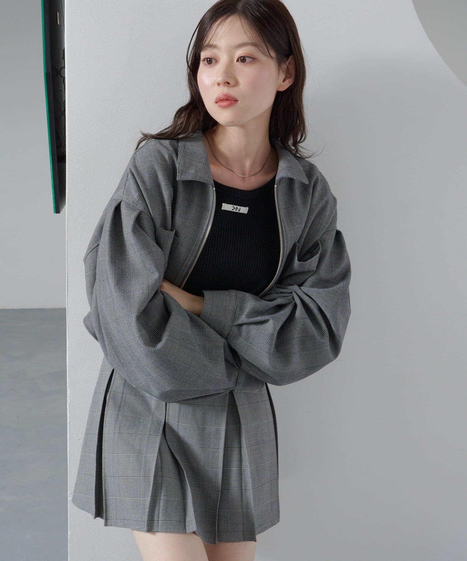 セットアップのミニスカート合わせでトレンドの着こなしに。