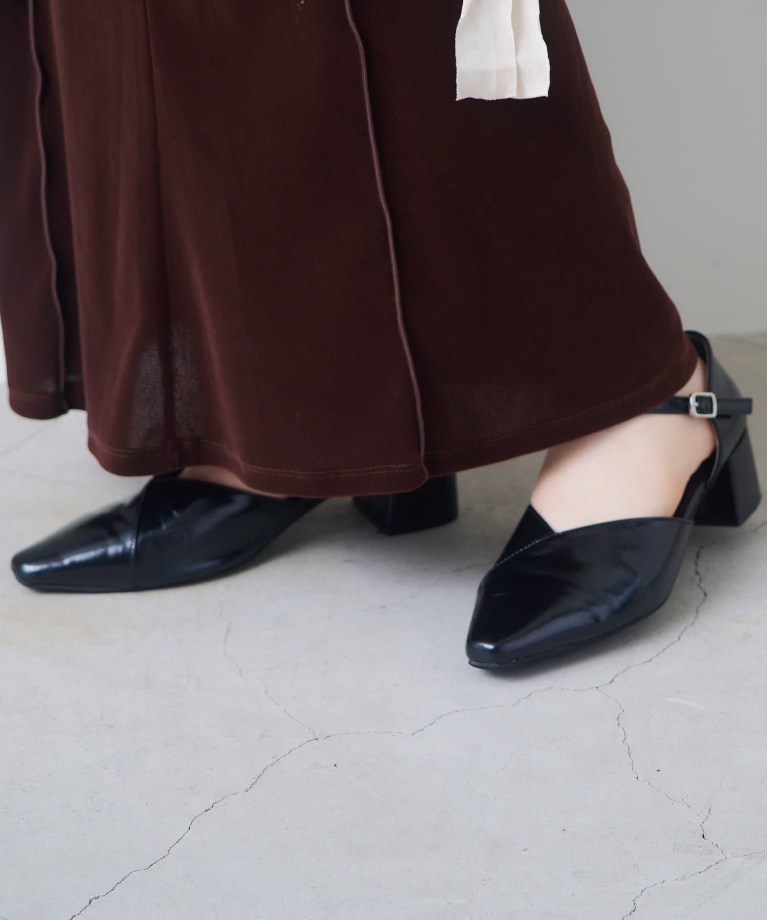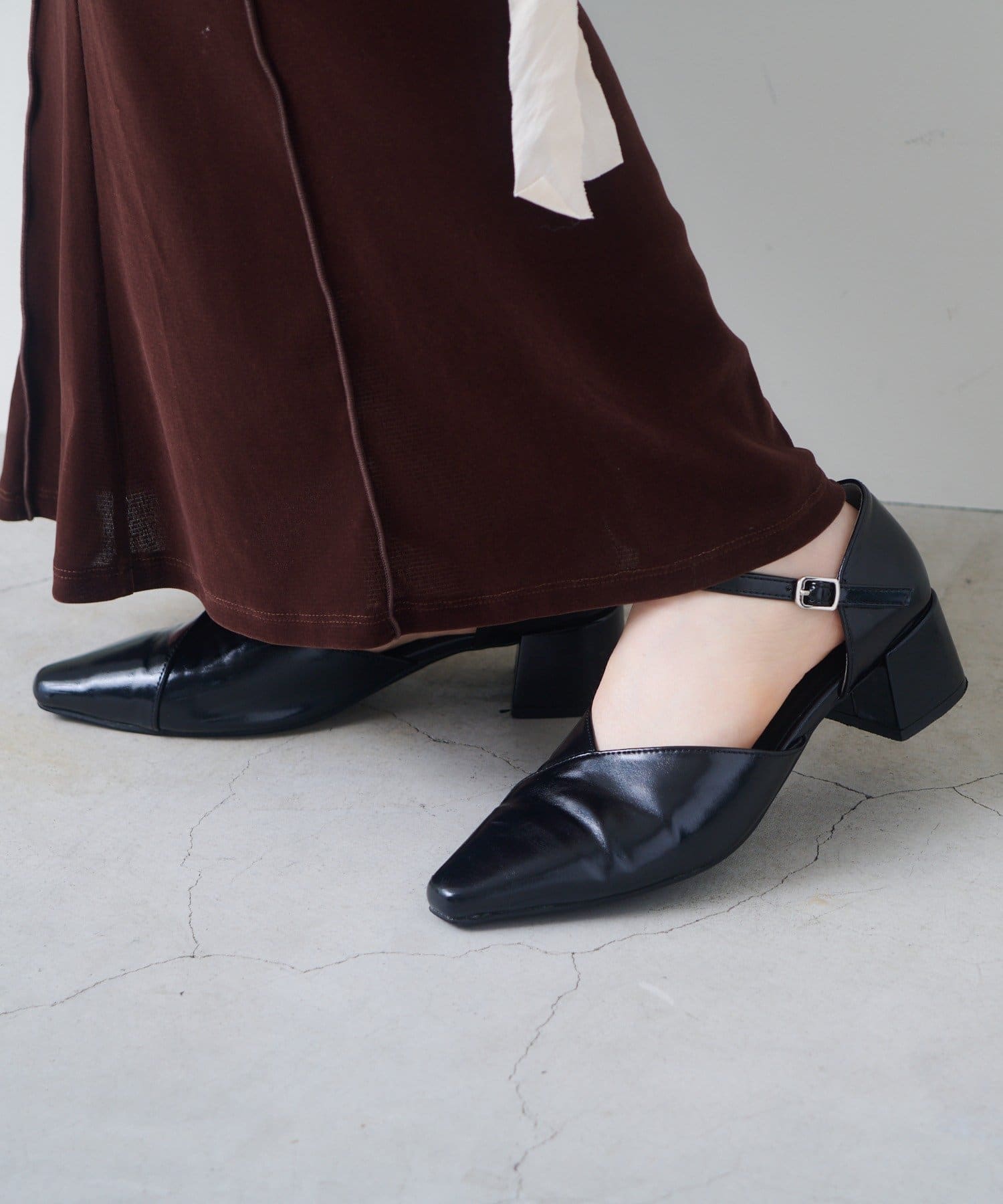 シャープな印象のスクエアトゥと、女性らしさを引き立てるクロスストラップデザインが特徴のパンプス。