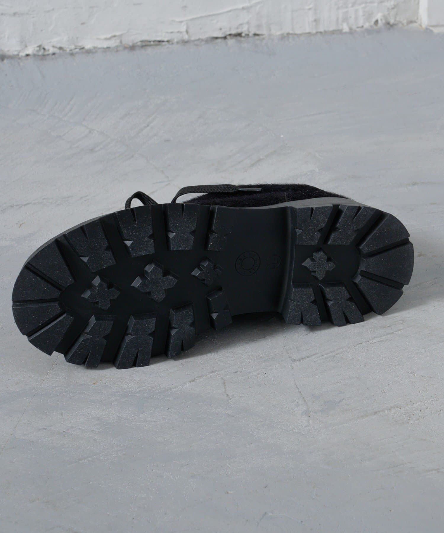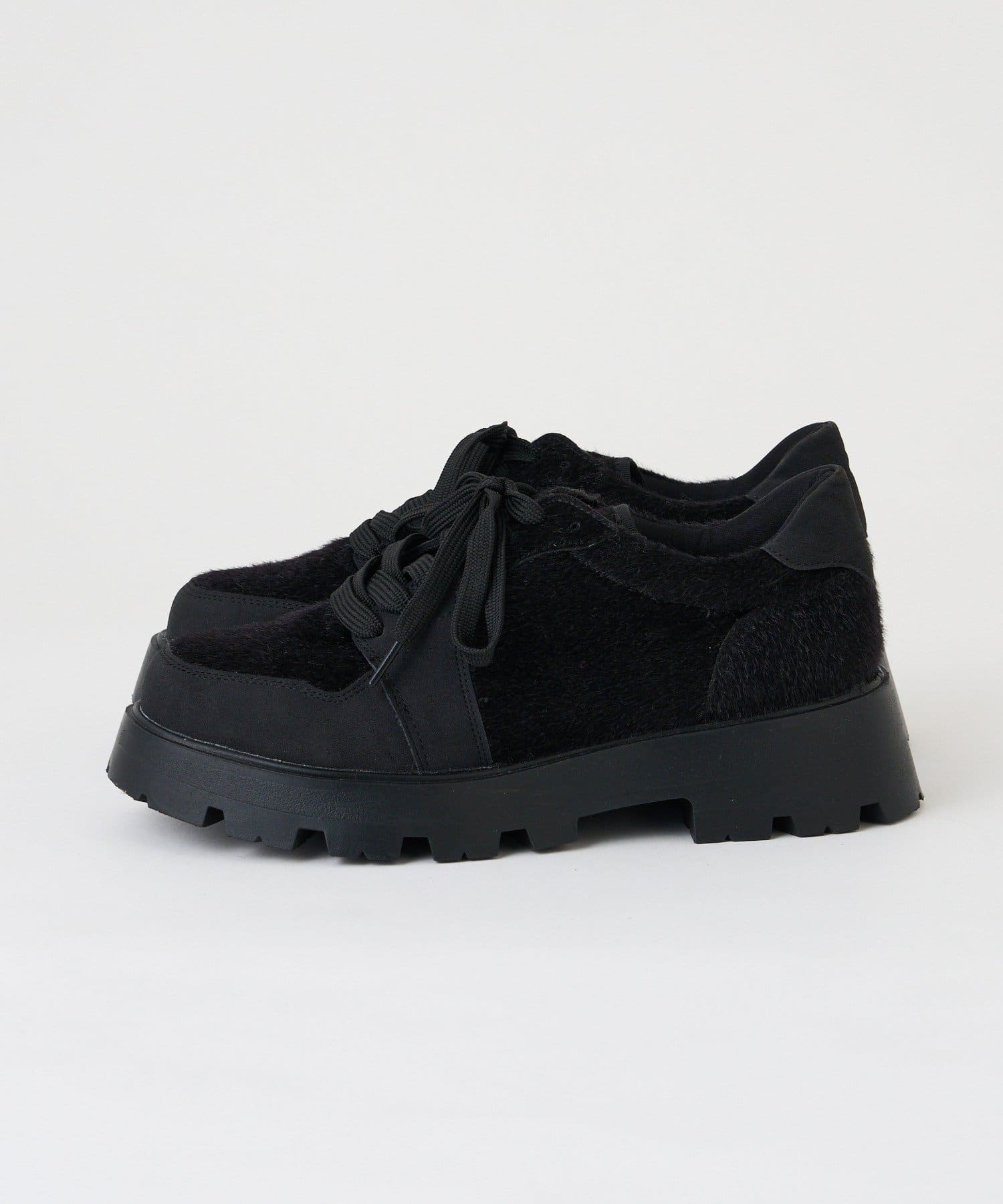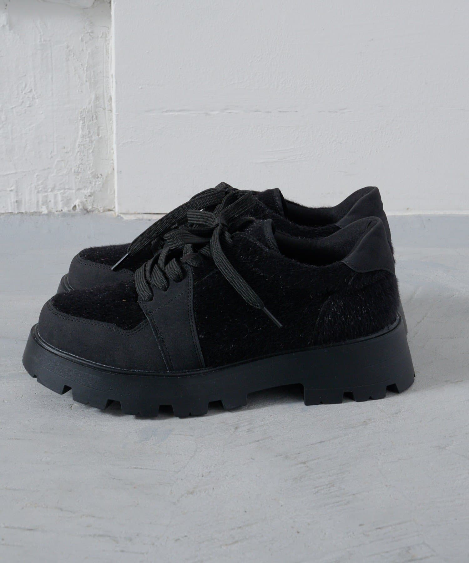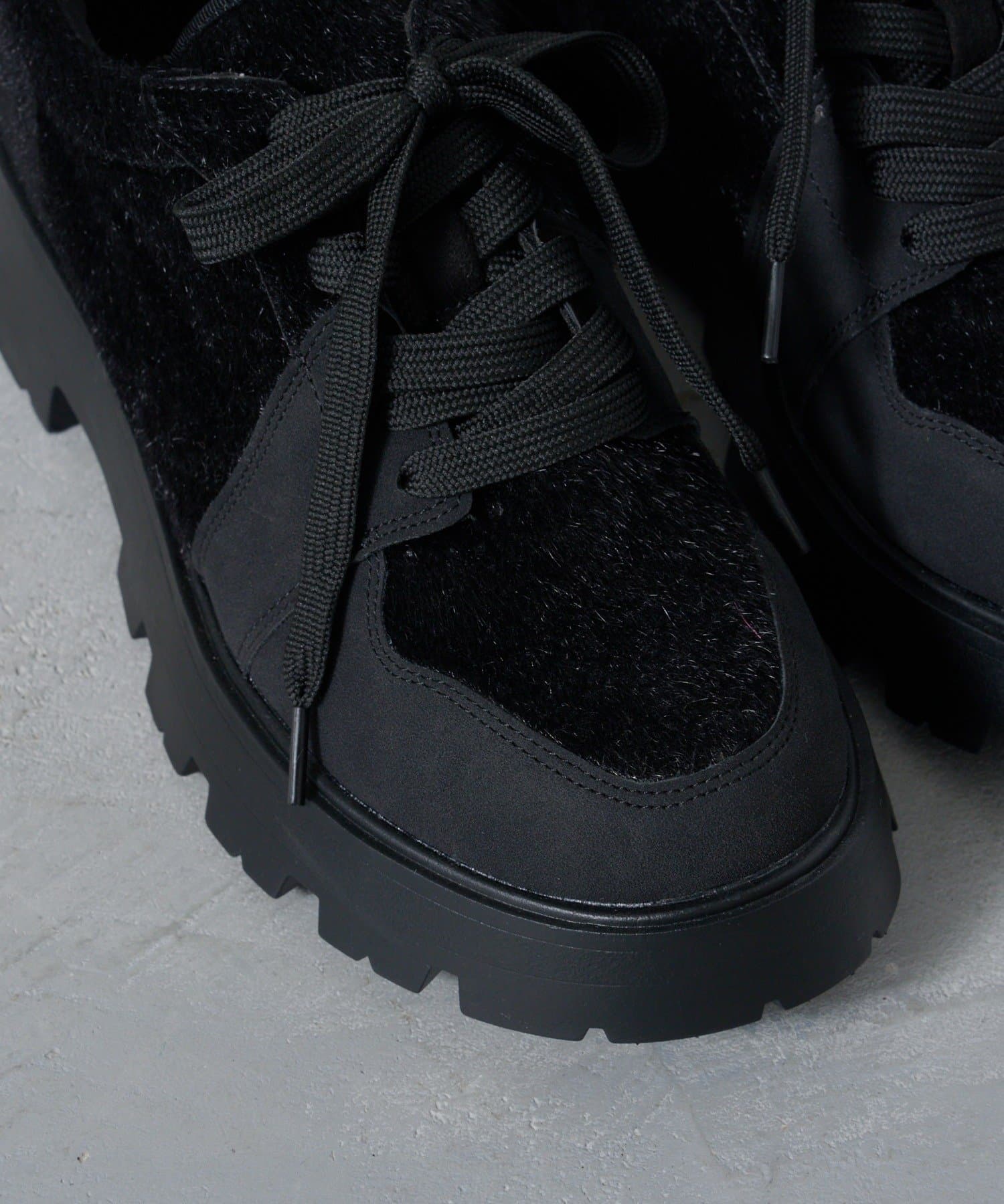 毛足のあるハラコ素材とスエード調の異素材MIXのデザインで主役級に。