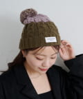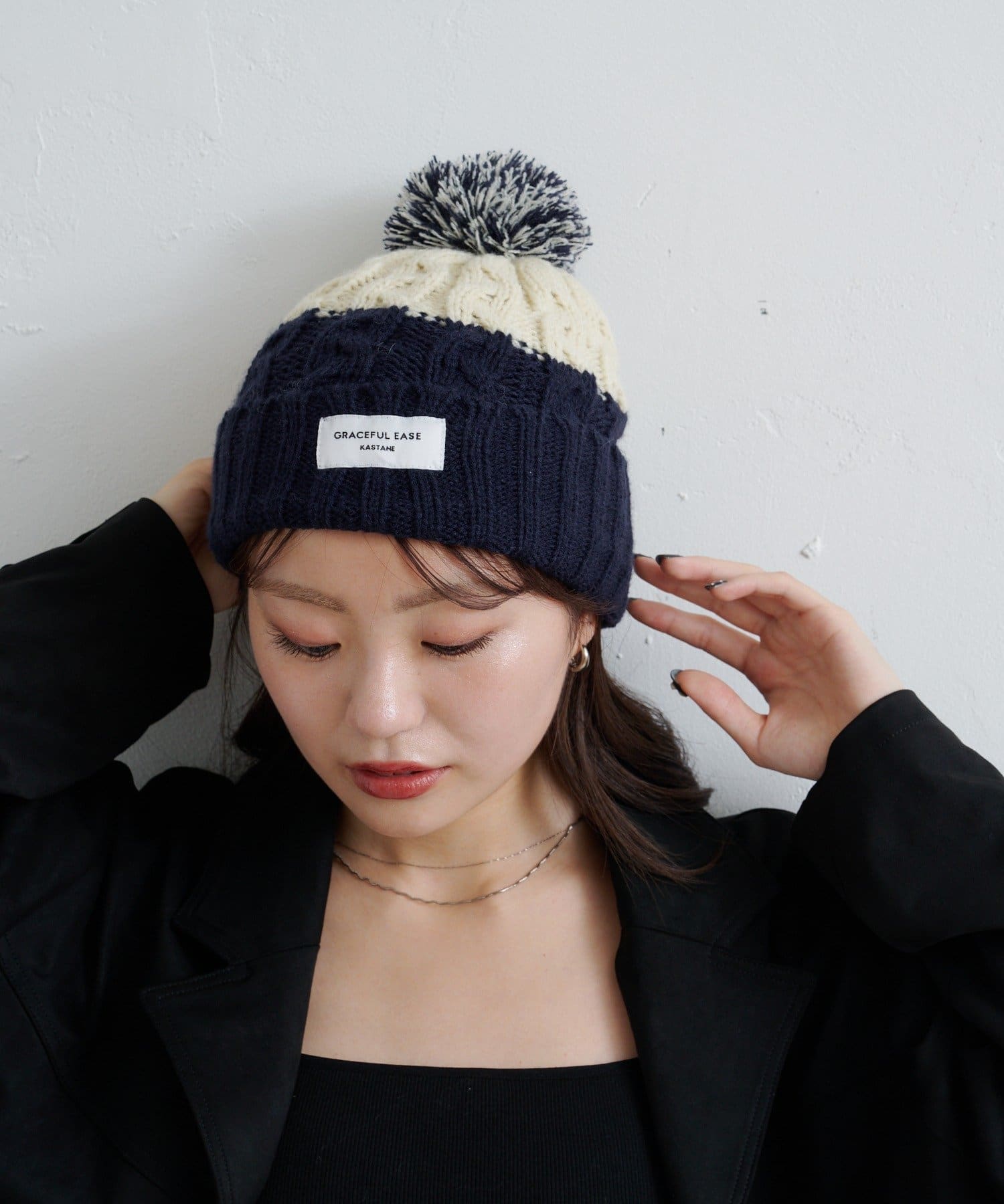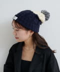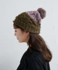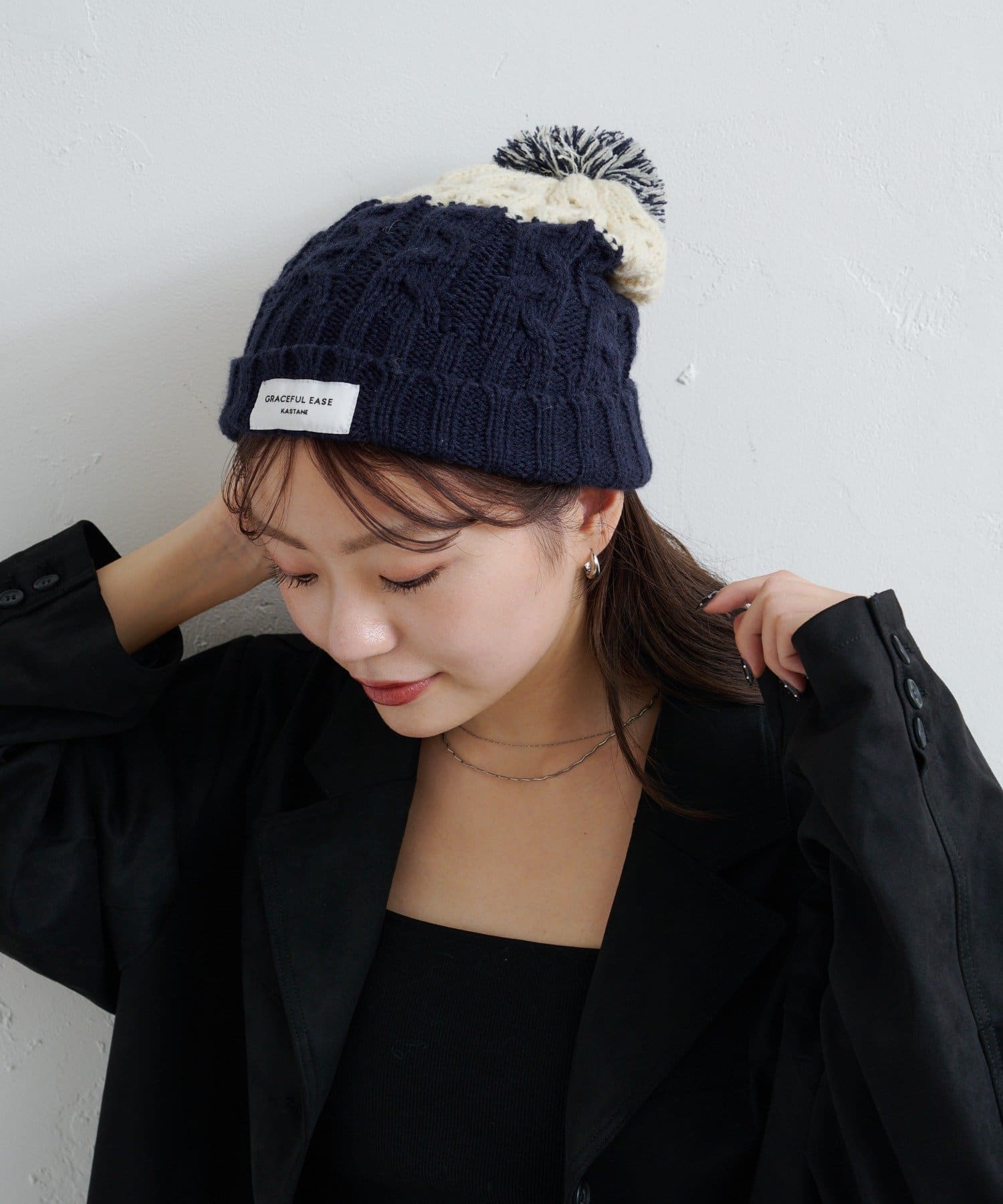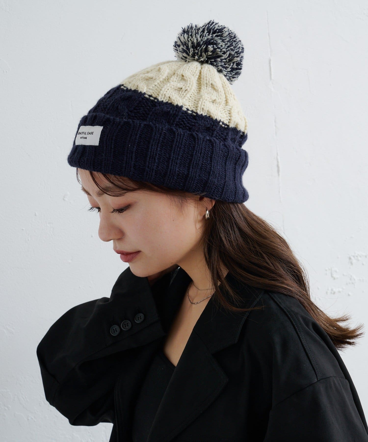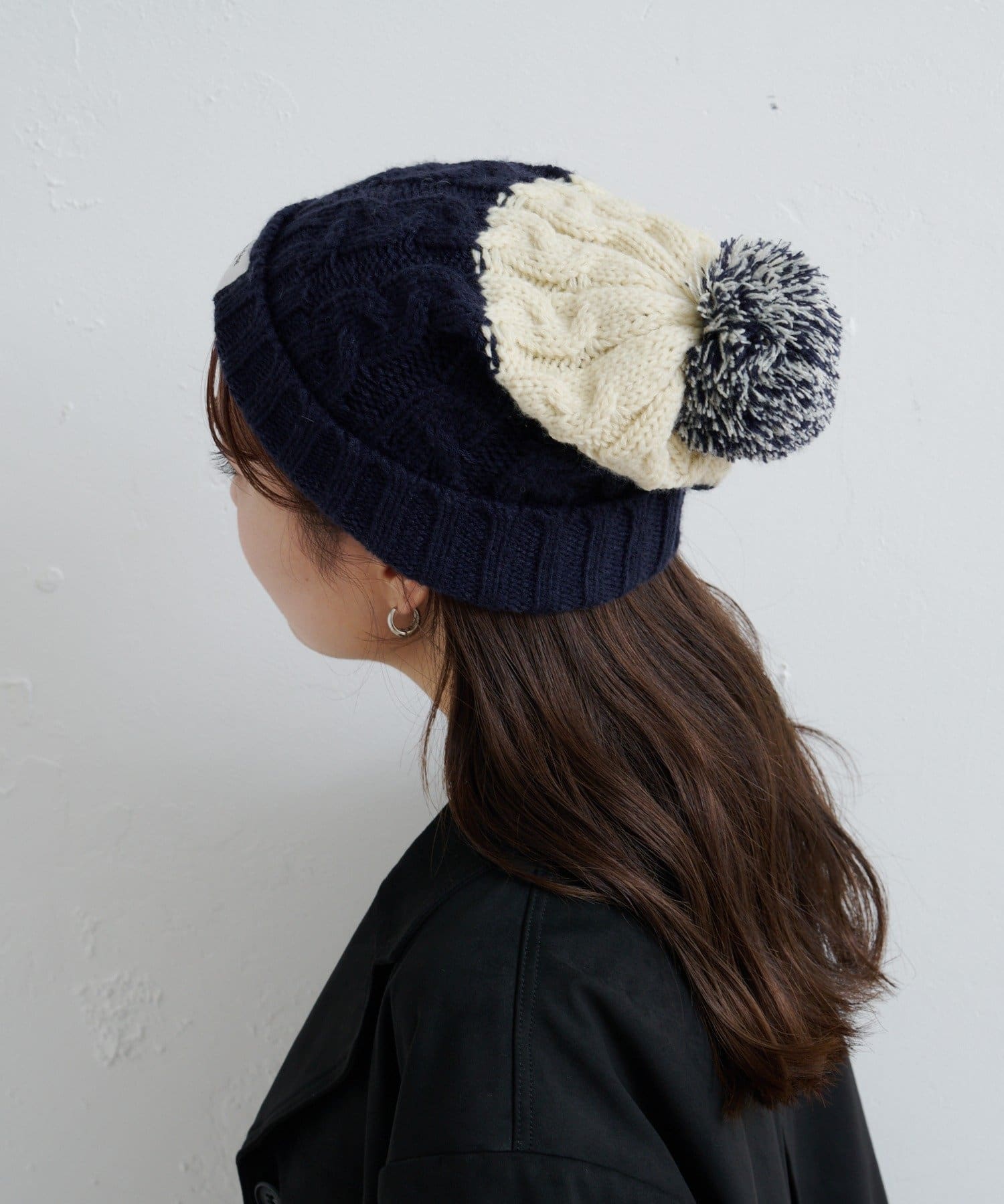 柔らかなケーブル編みと色味の異なる二色使いが特徴的なポンポンビーニー。