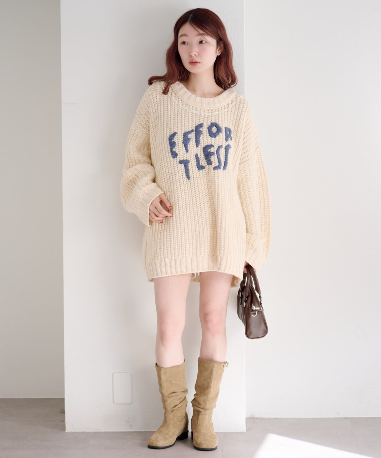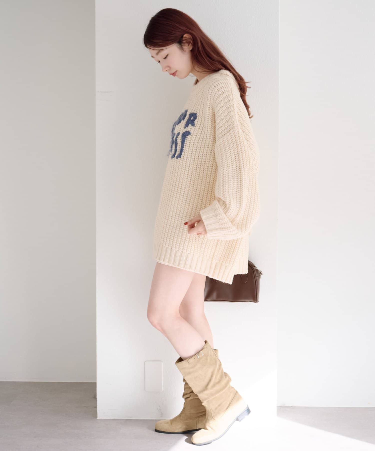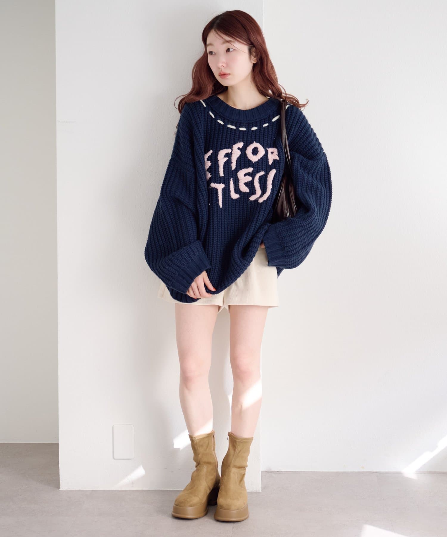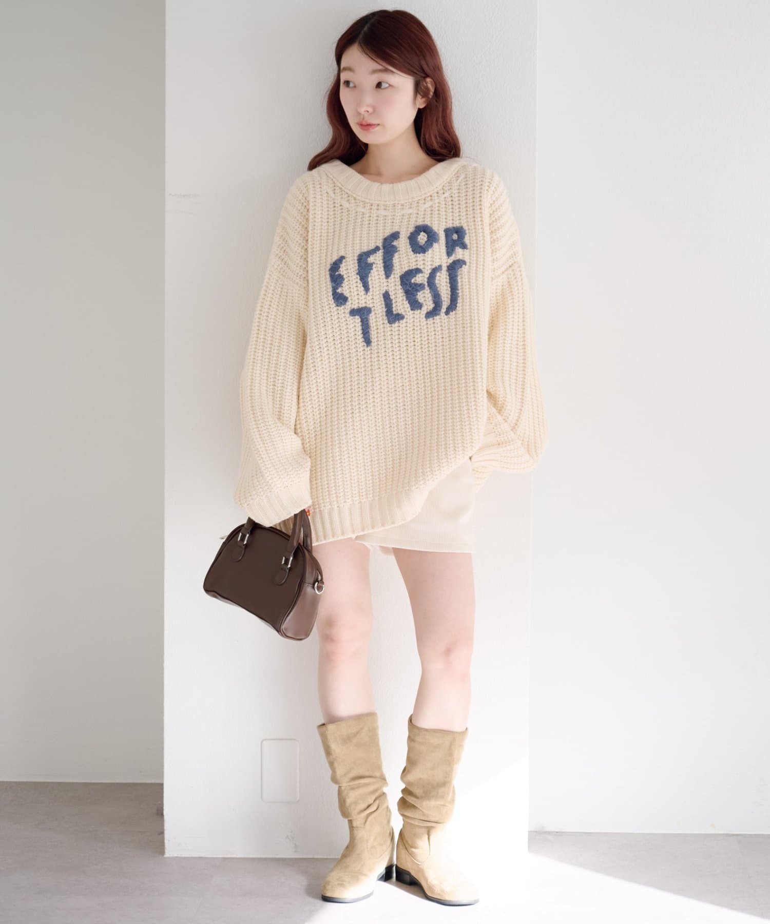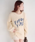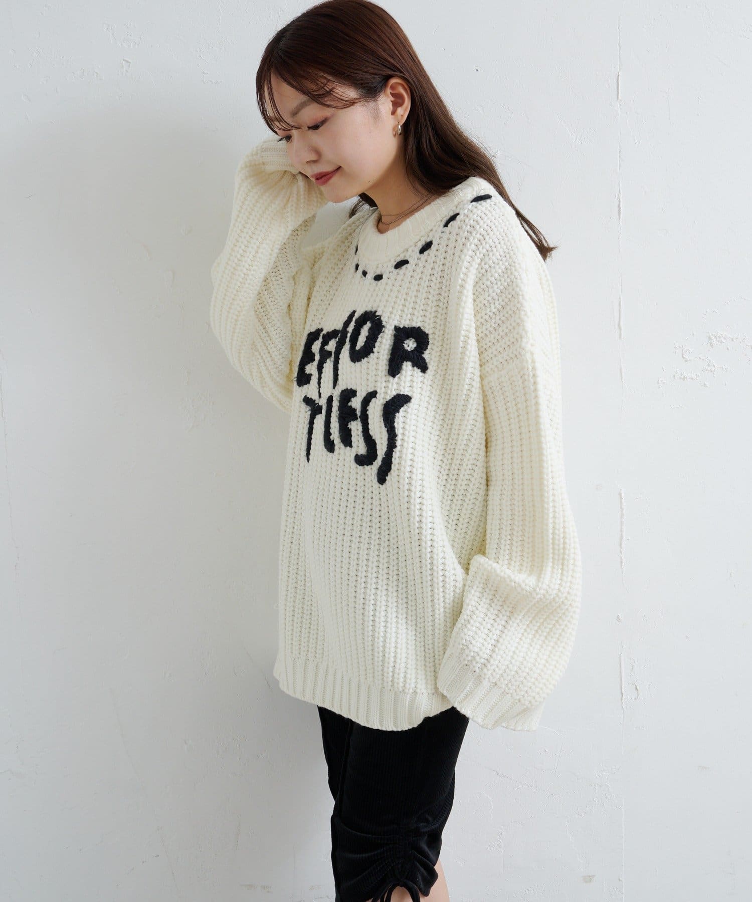 ゆったりとしたシルエットとざっくり編みの柔らかい素材感で、カジュアルながらもこなれた印象に。