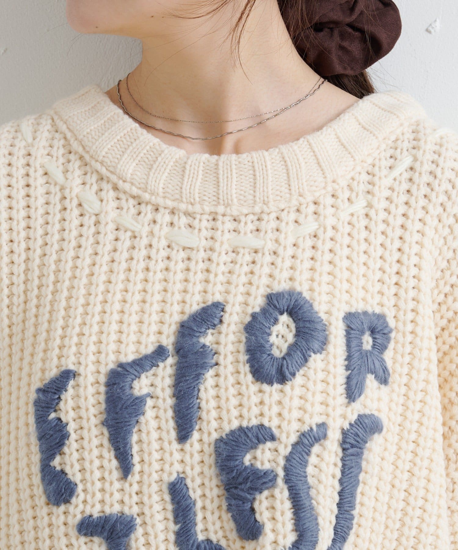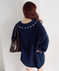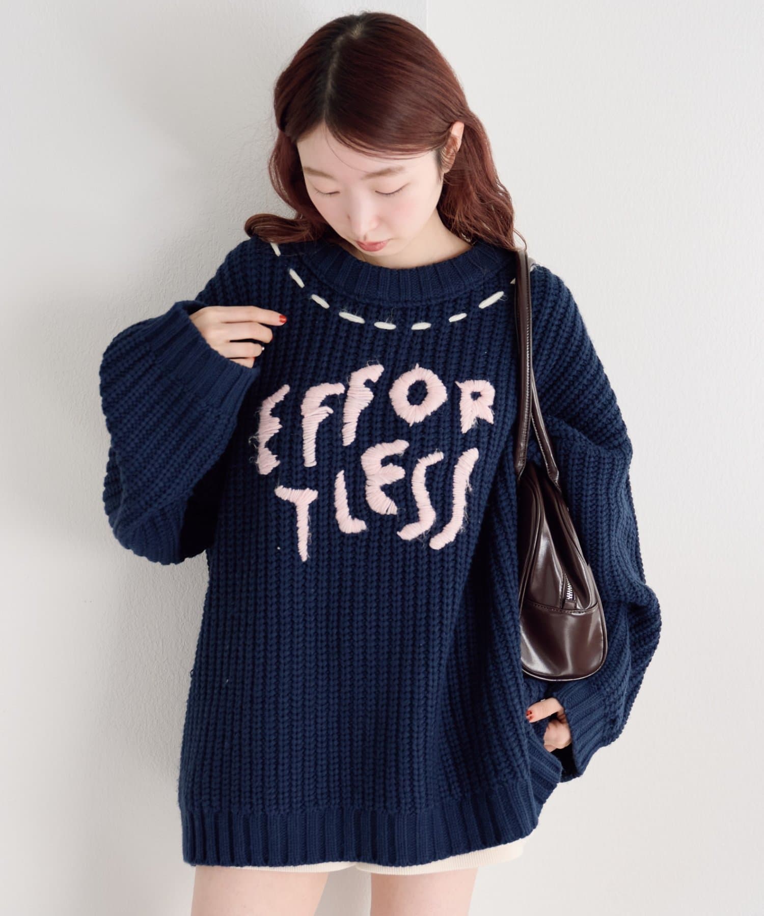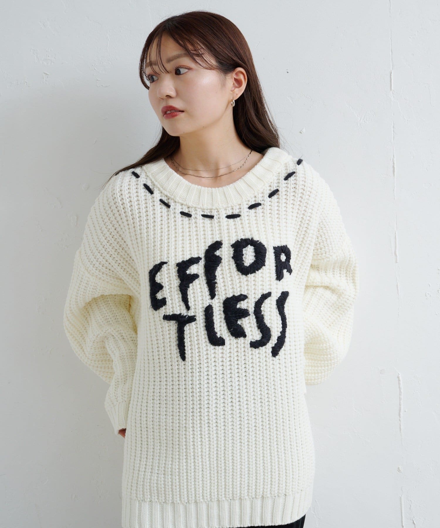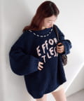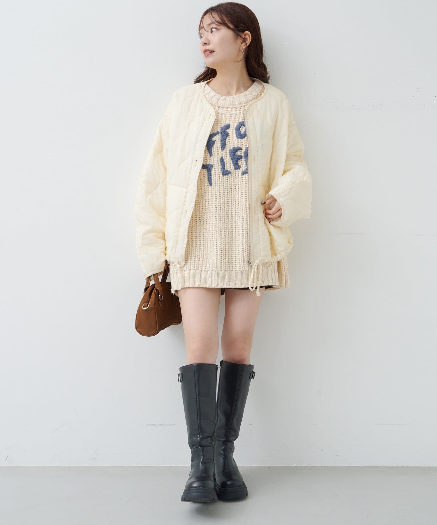 ゆったりとしたシルエットとざっくり編みの柔らかい素材感で、カジュアルながらもこなれた印象に。