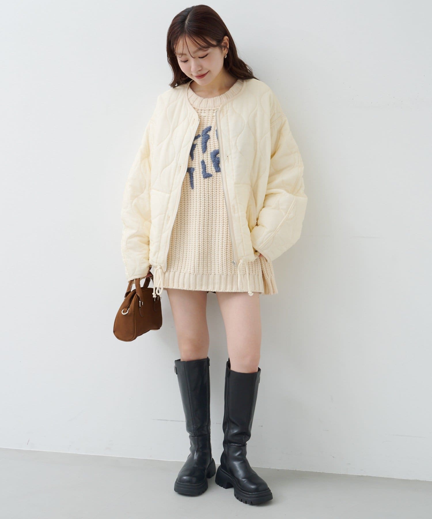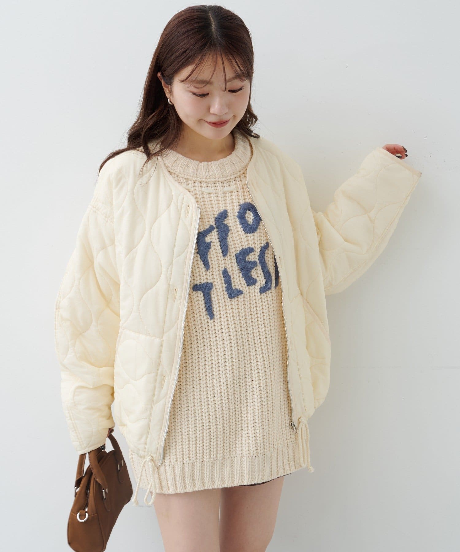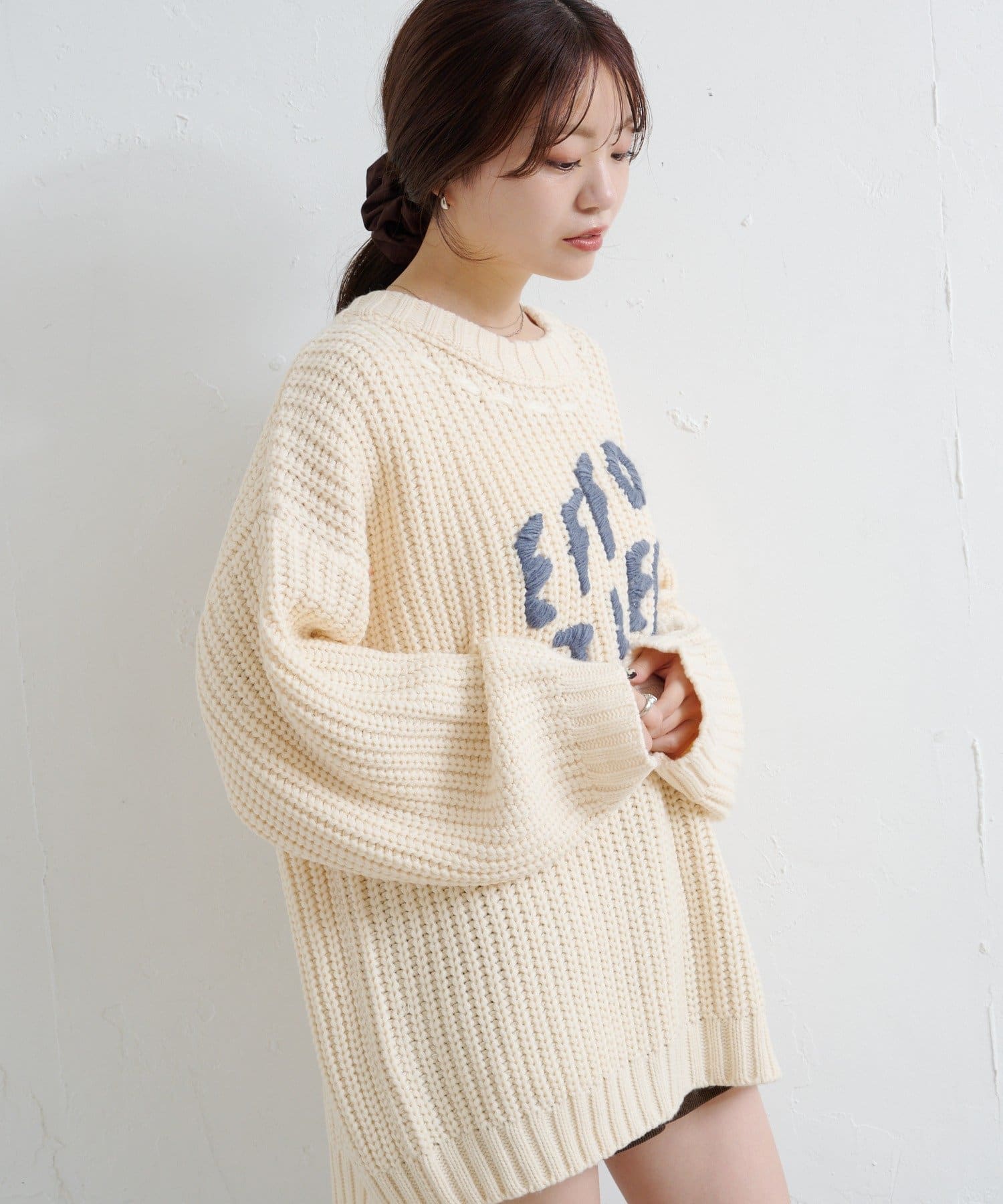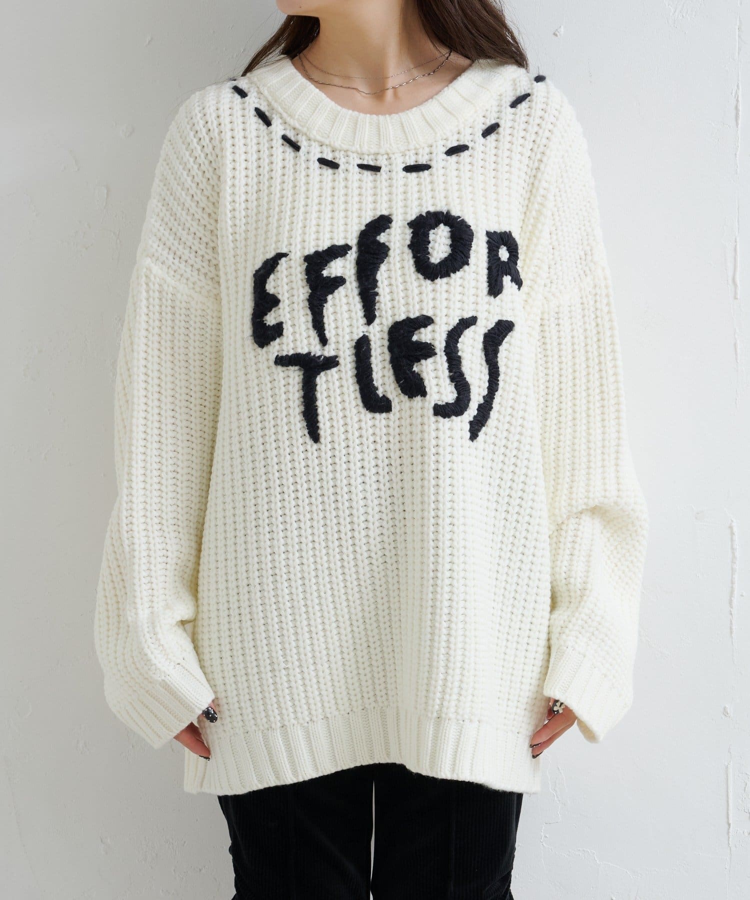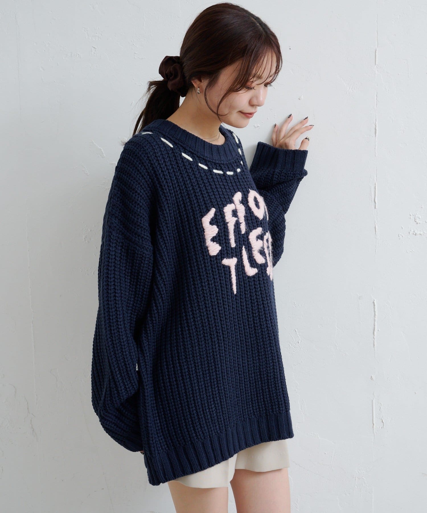 ゆったりとしたシルエットとざっくり編みの柔らかい素材感で、カジュアルながらもこなれた印象に。