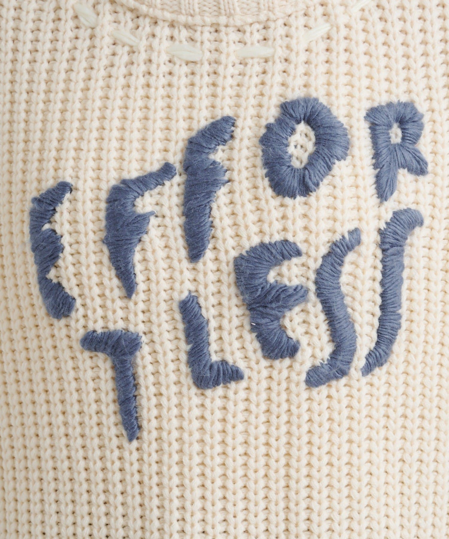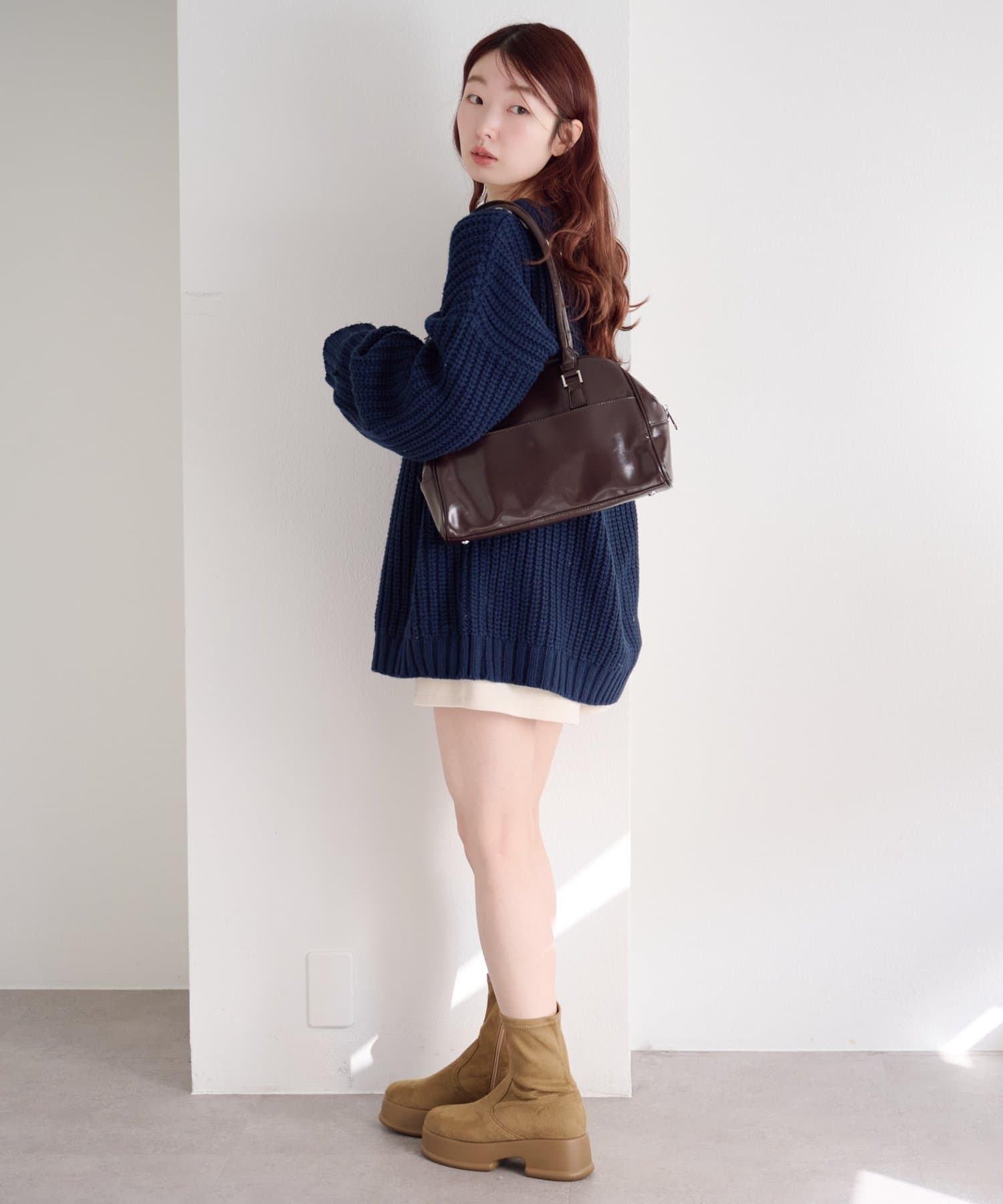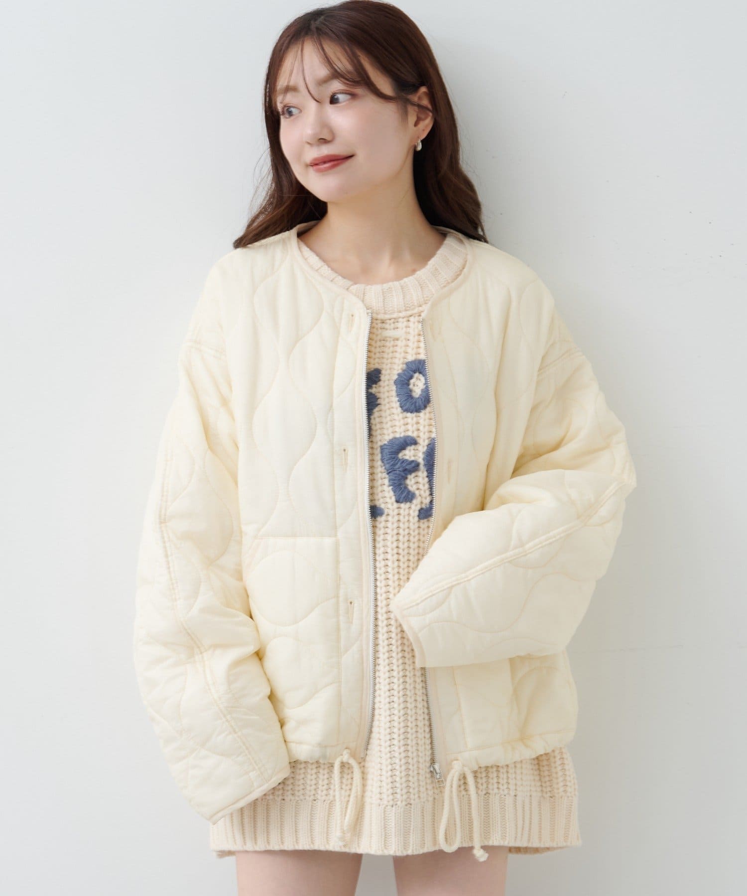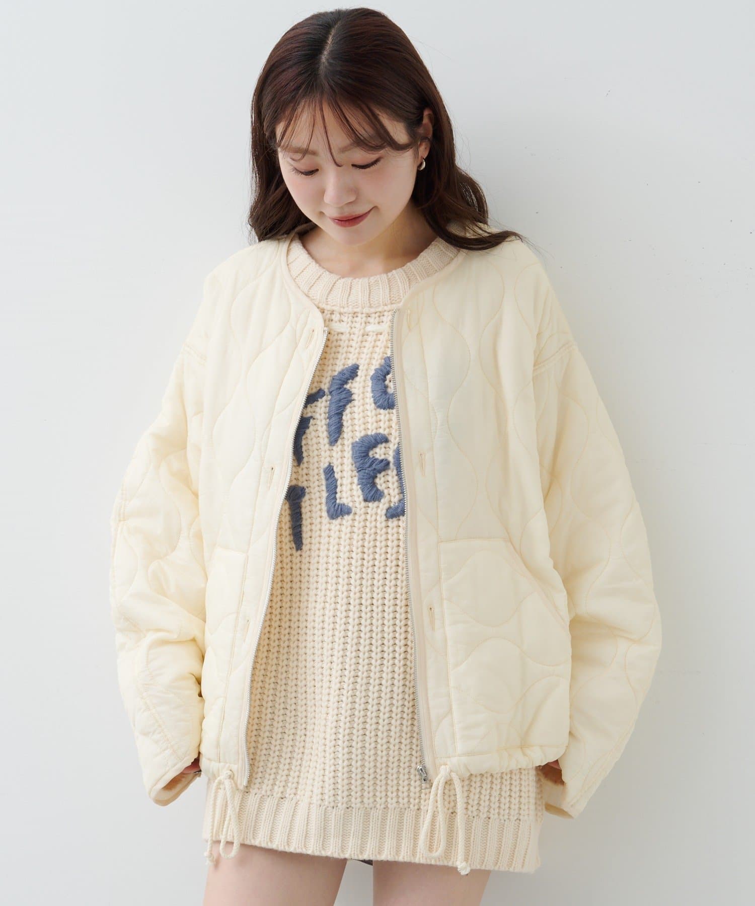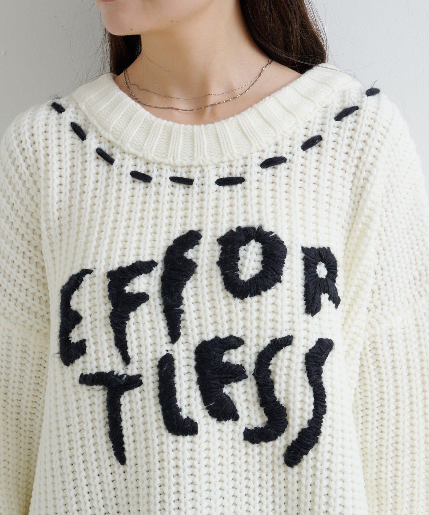ゆったりとしたシルエットとざっくり編みの柔らかい素材感で、カジュアルながらもこなれた印象に。