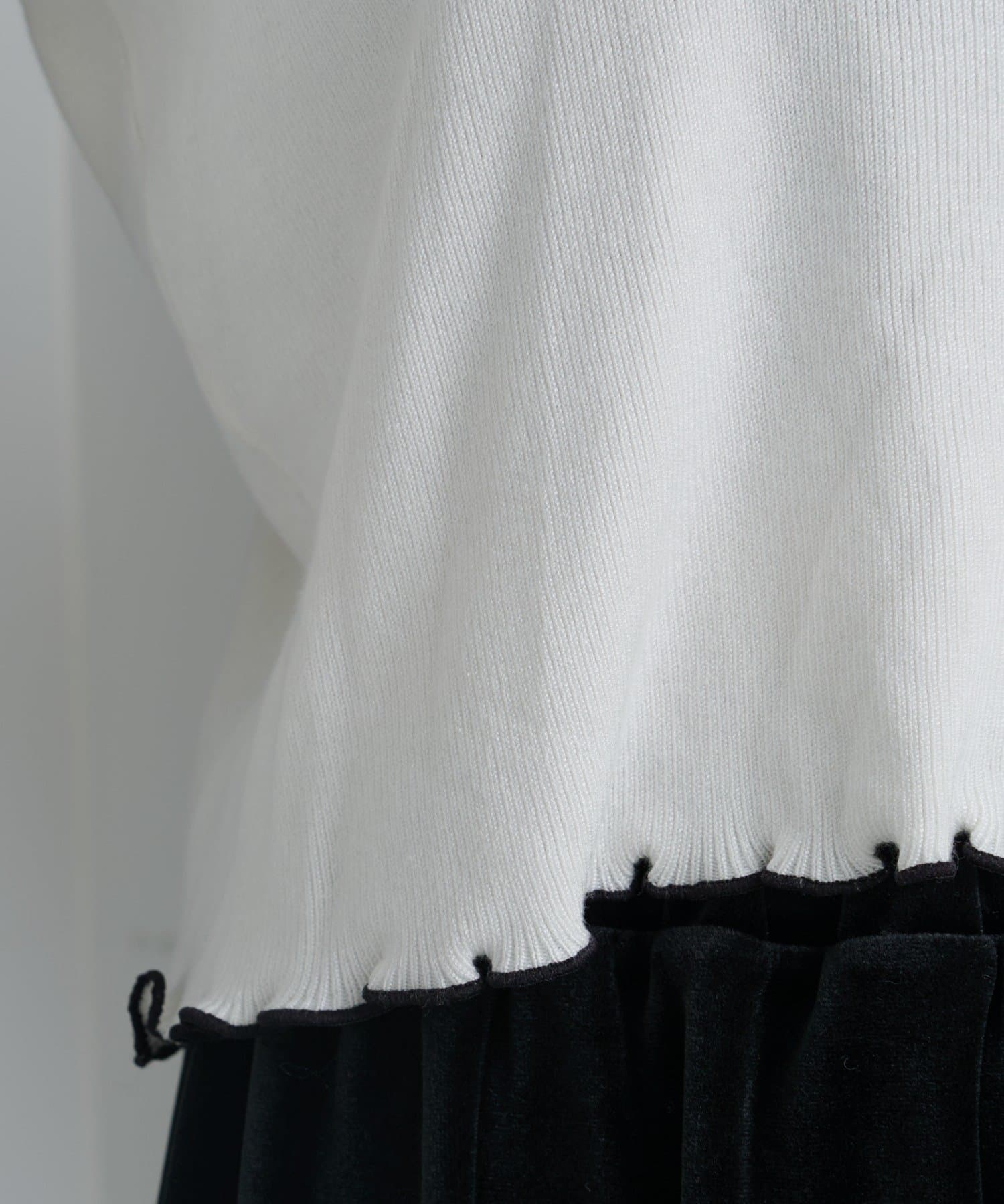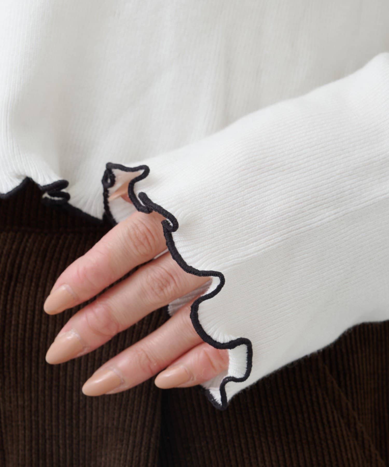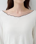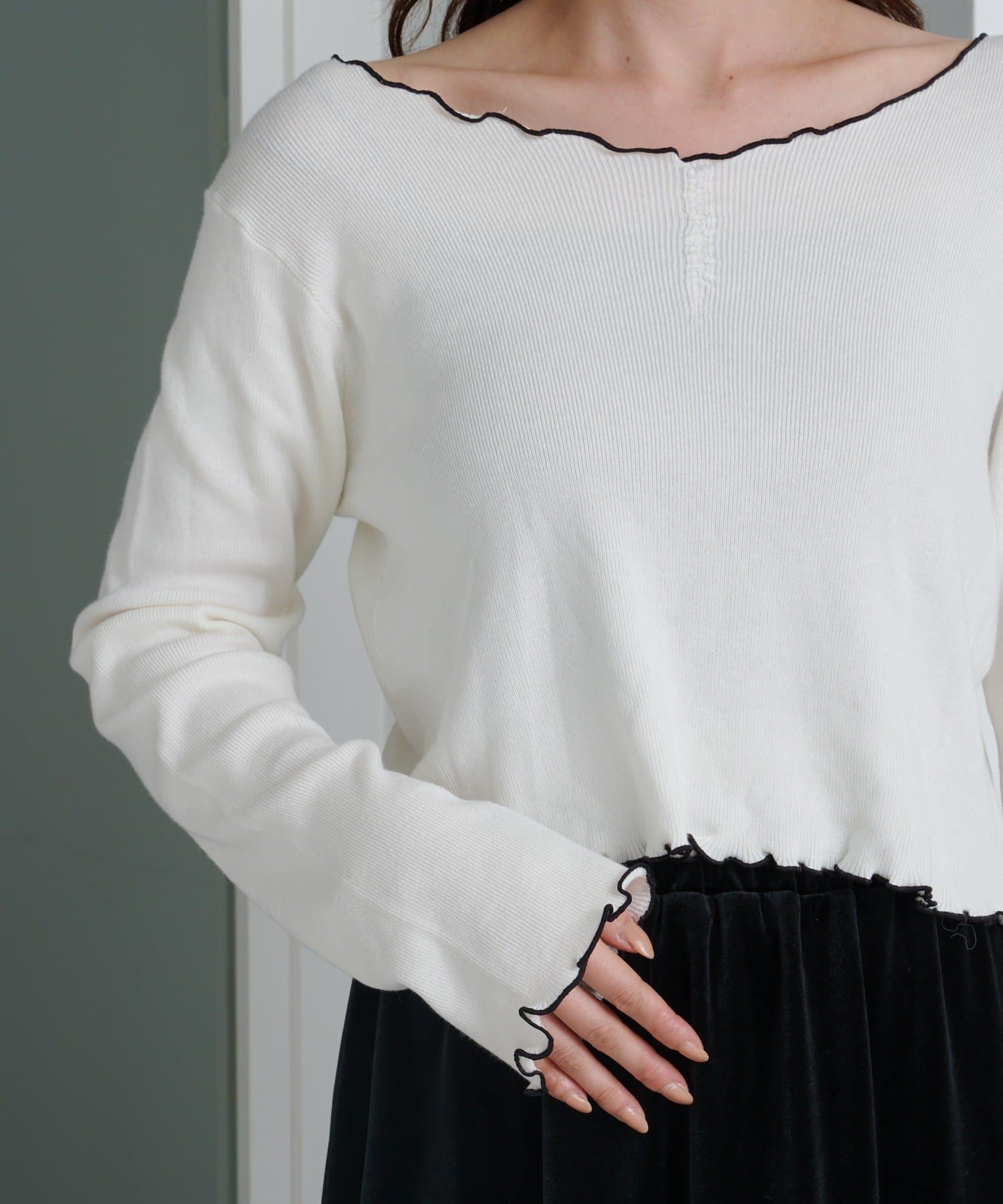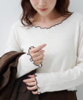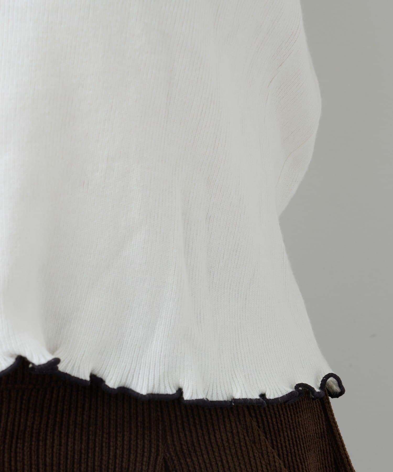 首元と袖口、裾に施されたメロウデザインがフェミニンな印象のニットプルオーバー。