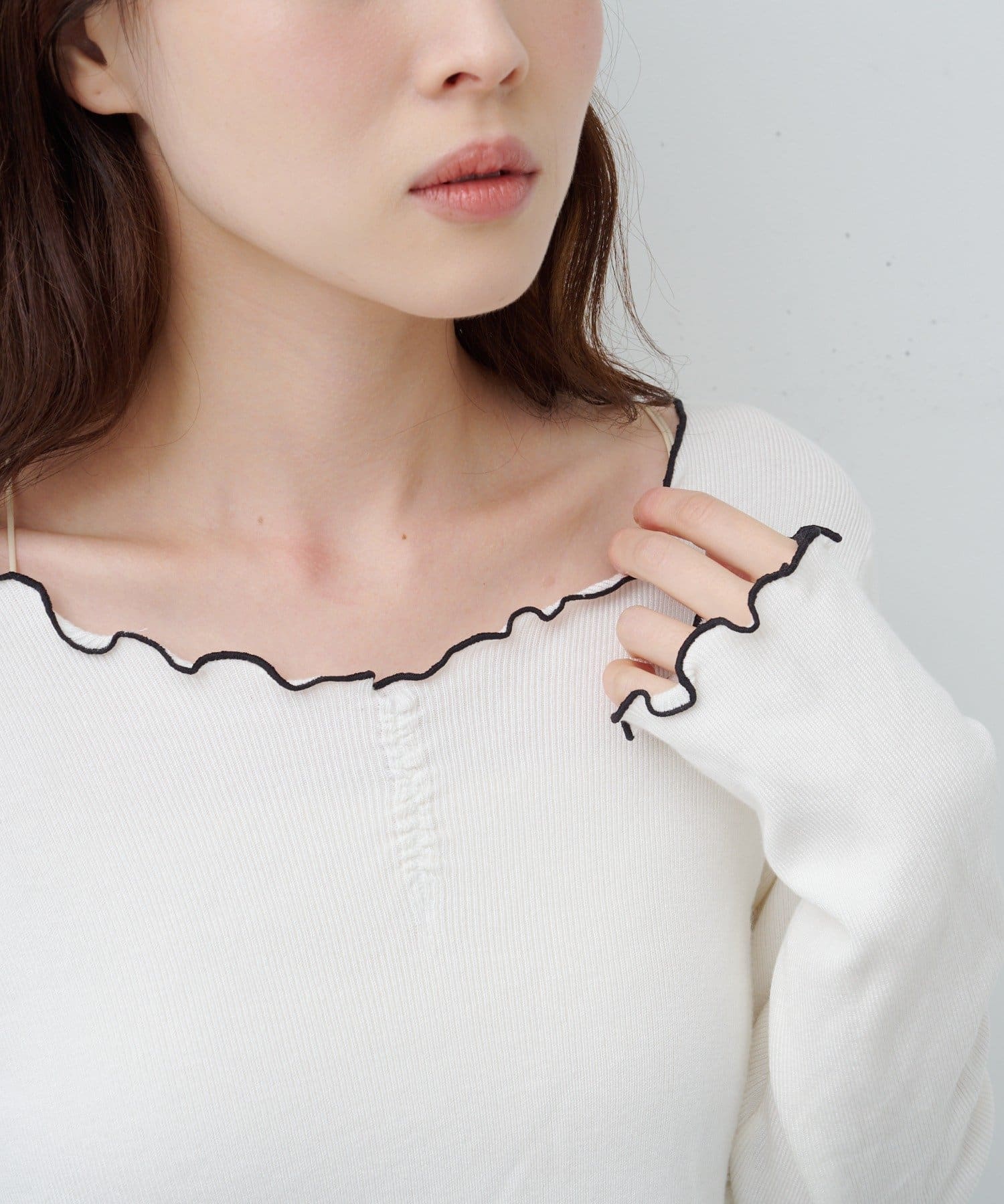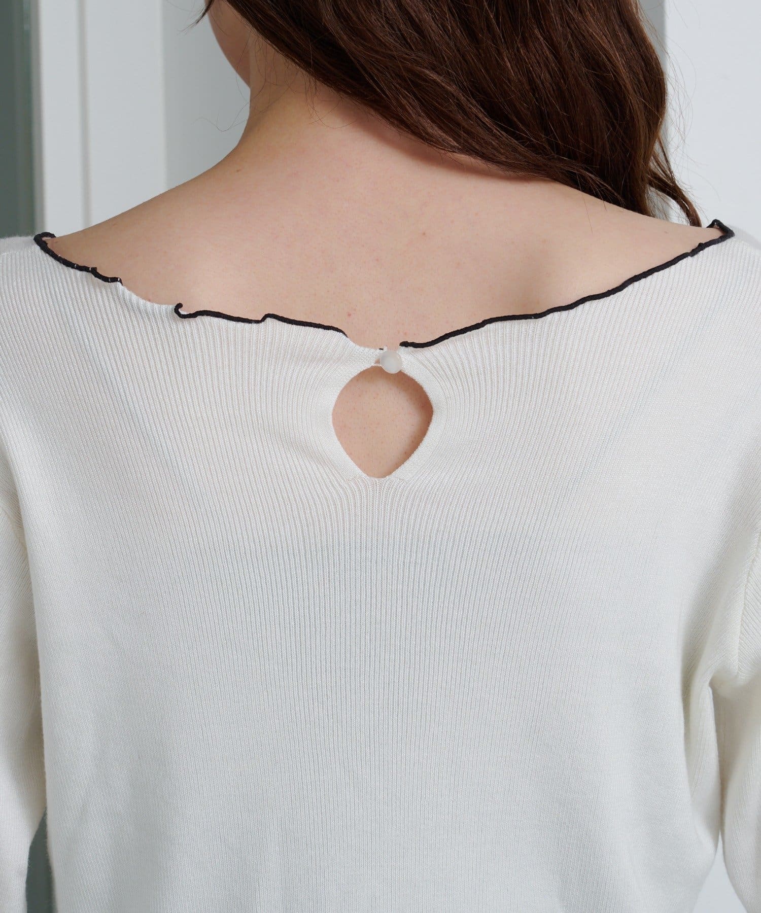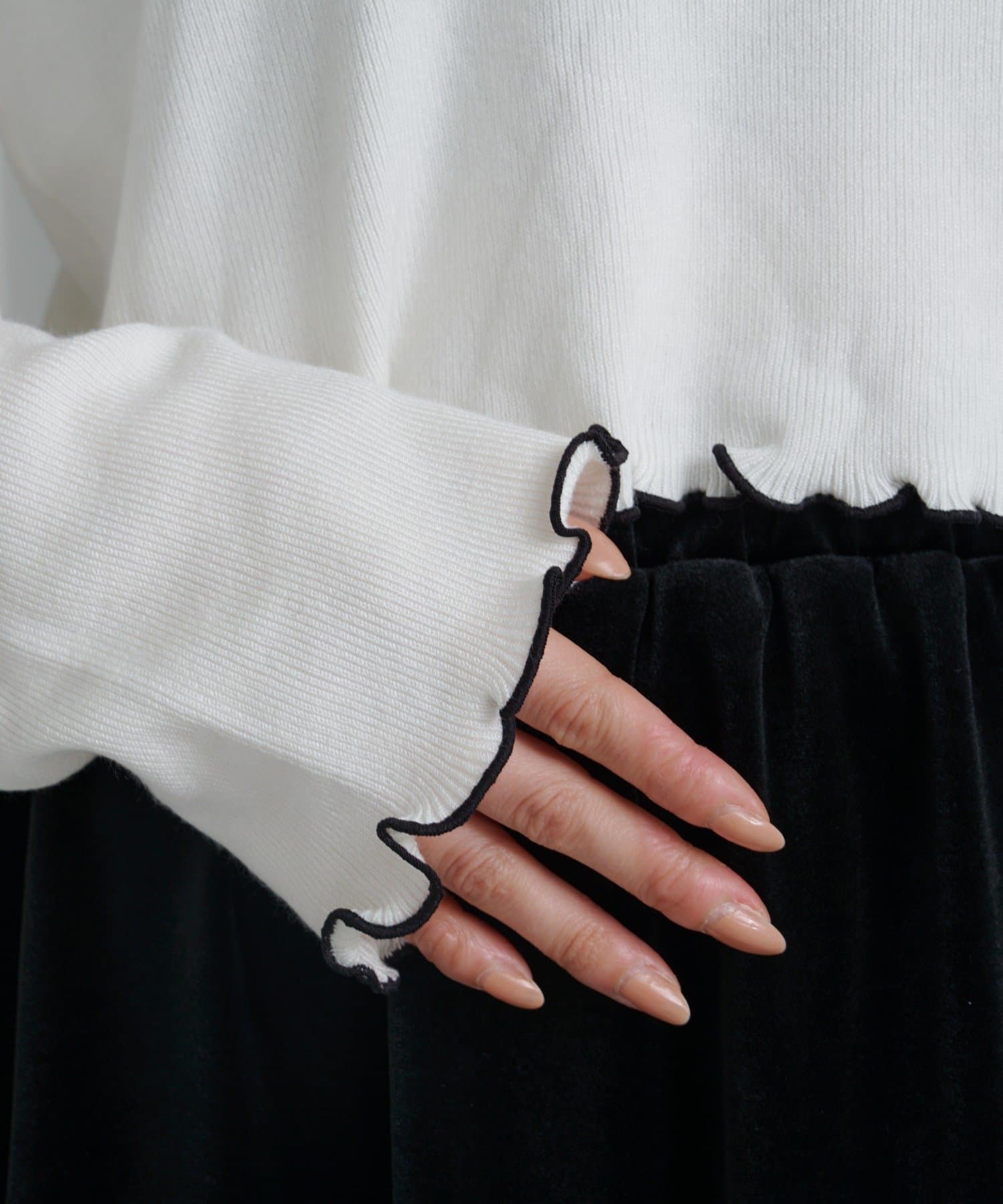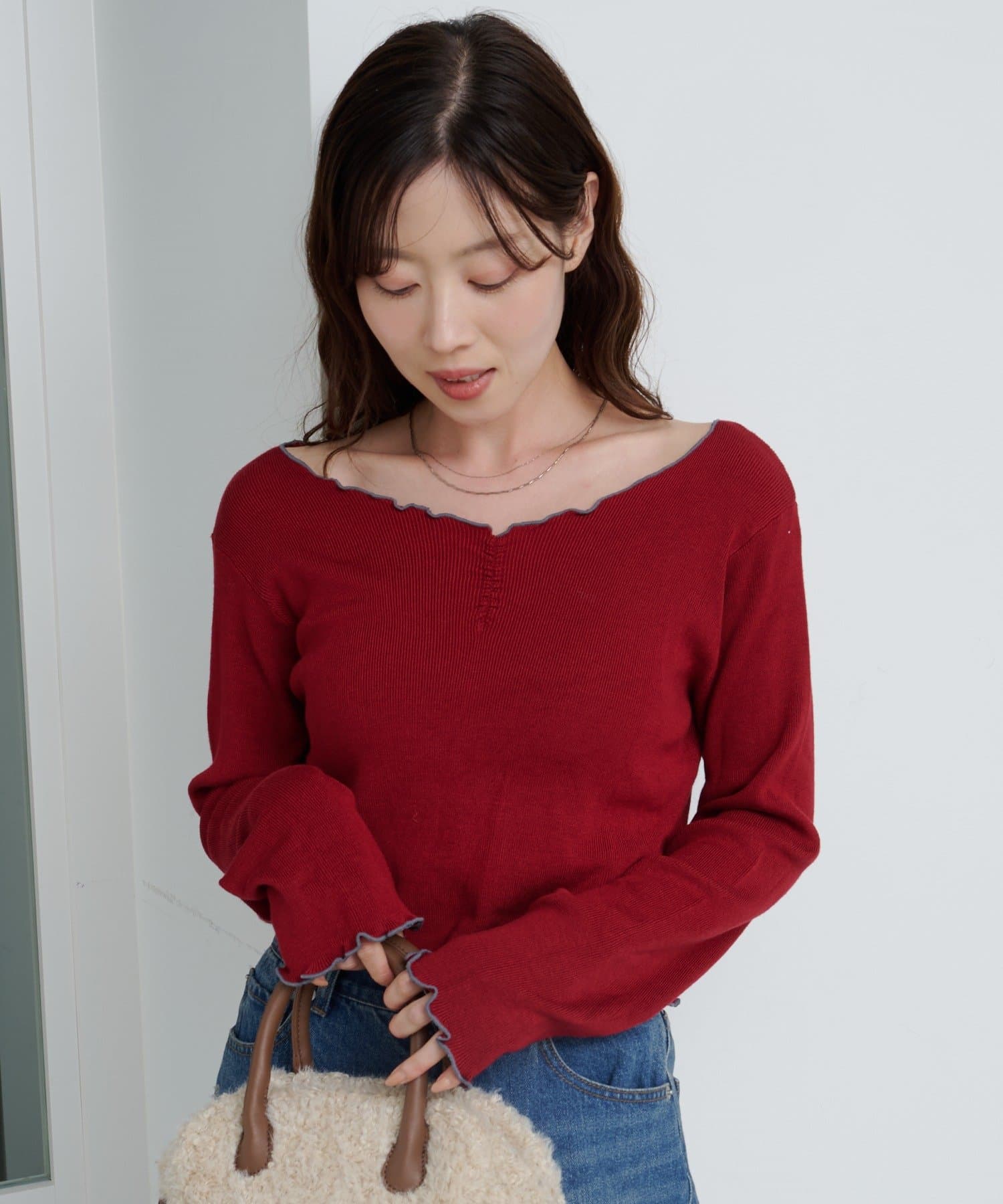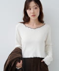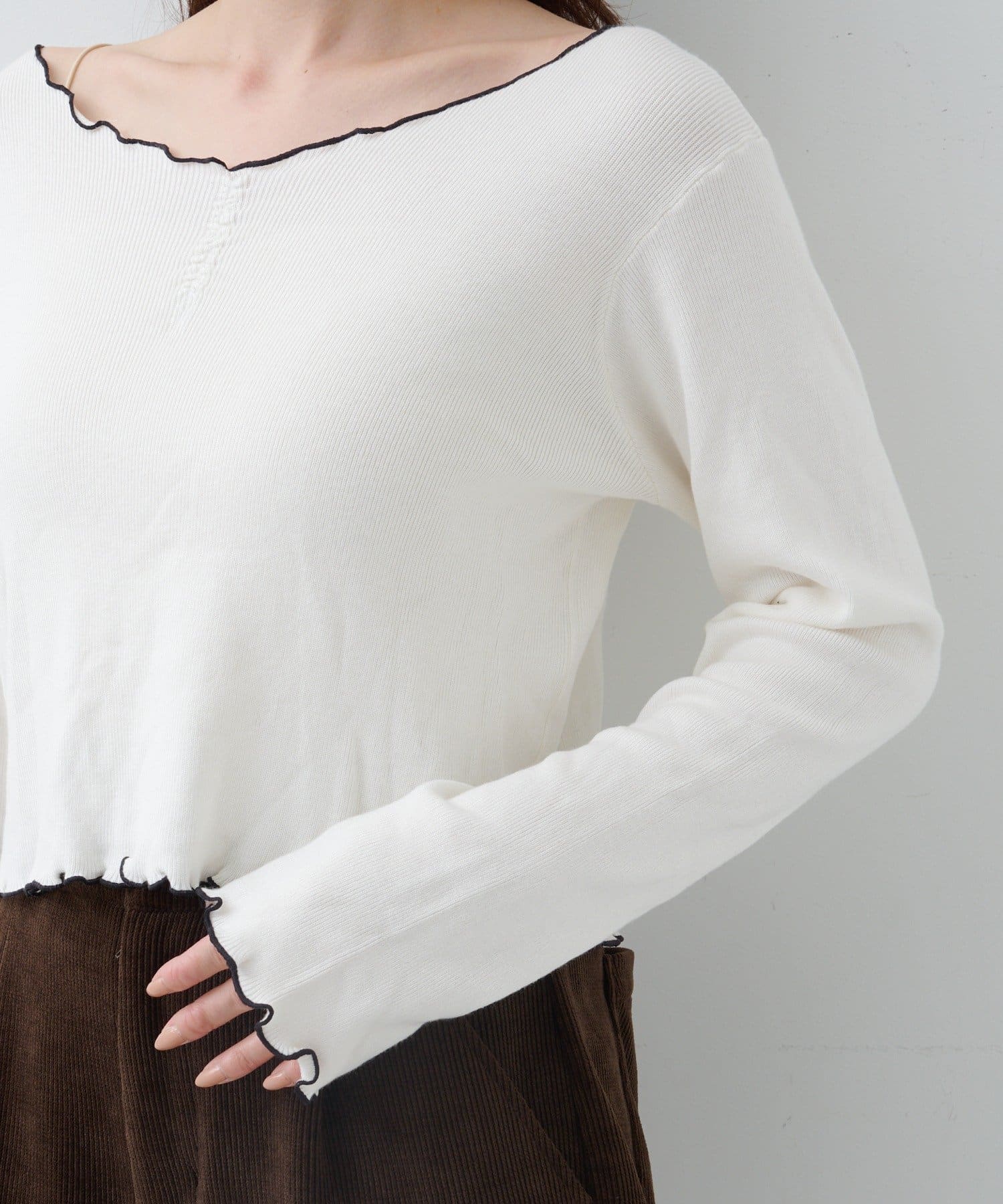 首元と袖口、裾に施されたメロウデザインがフェミニンな印象のニットプルオーバー。